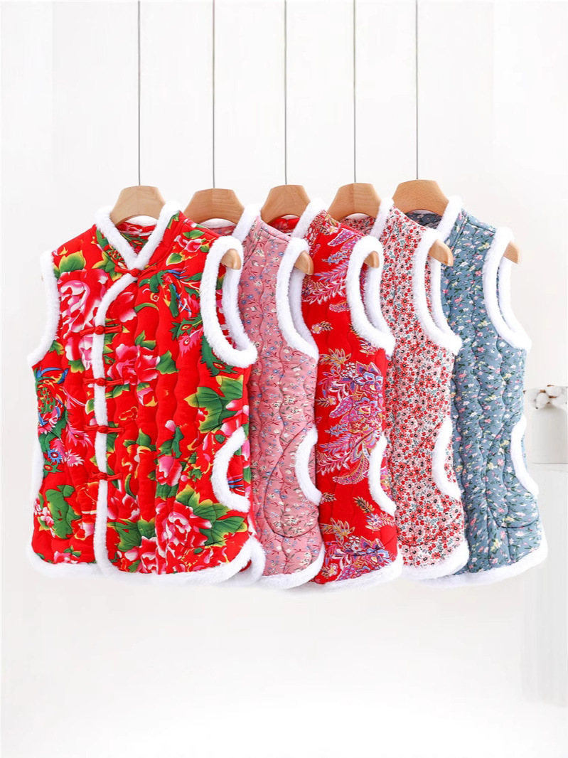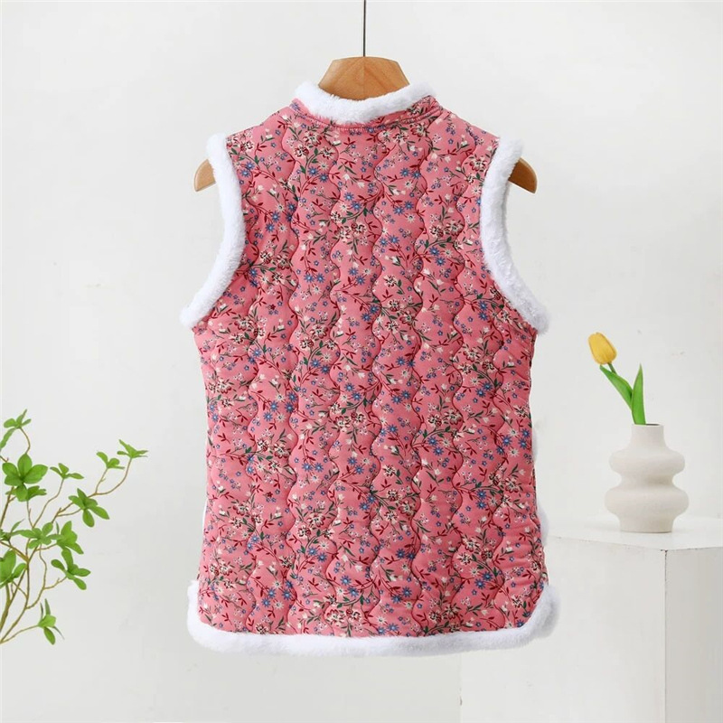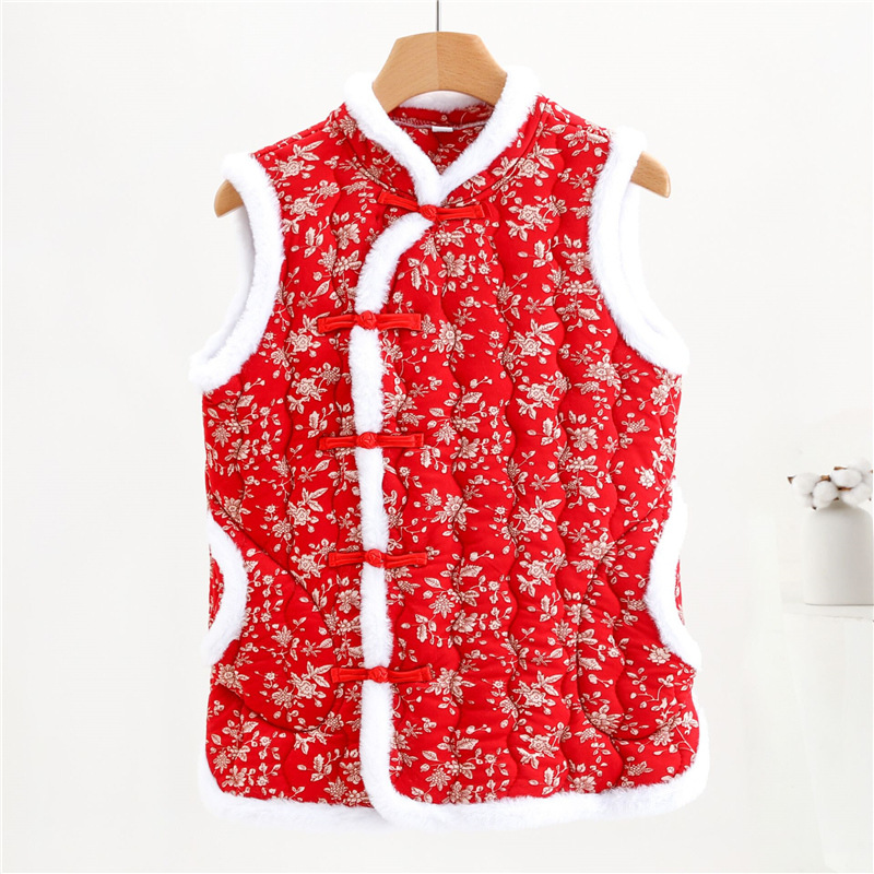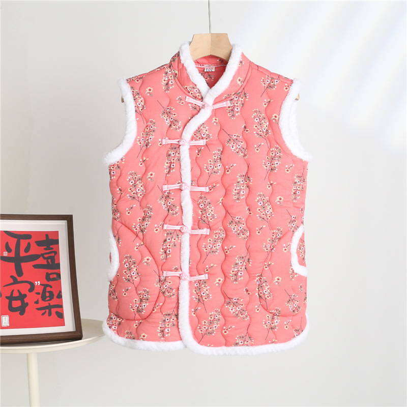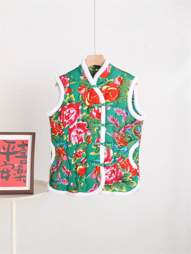 Guofeng Northeast Big Flower Vest 여성 겨울 여성 버튼 웨이스트 코트 코튼 탑으로 따뜻한 조끼