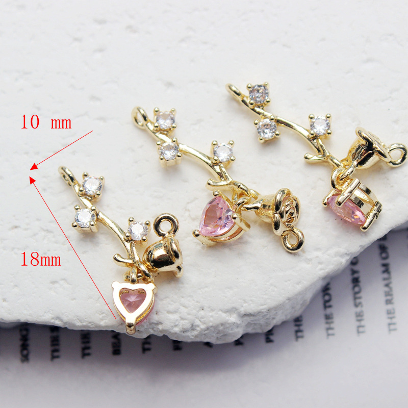 14k包金保色玫瑰花双吊爱心镶锆石吊坠花枝diy手工手链项链配件