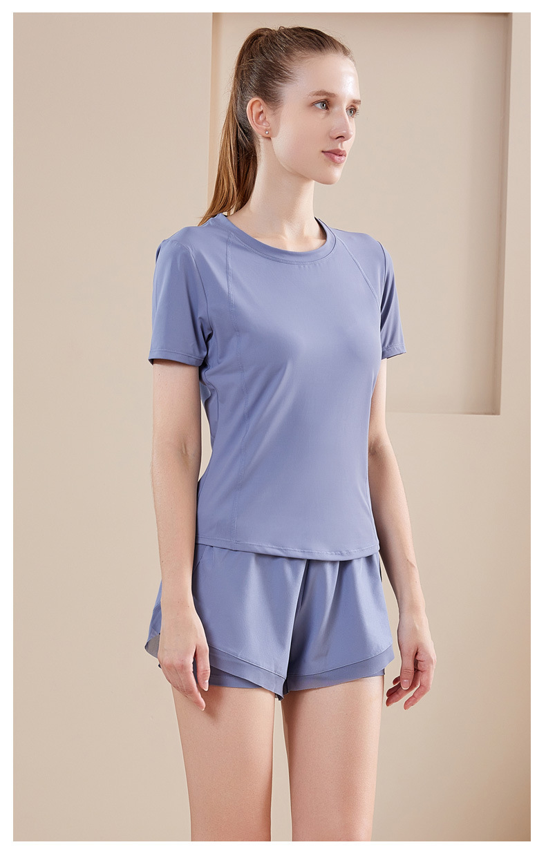 새로운 스포츠 세트 여성의 빠른 드라이 러닝 투피스 통기성 피트니스 반팔 가짜 투피스 반바지 국경 간 요가 세트스토어 가기