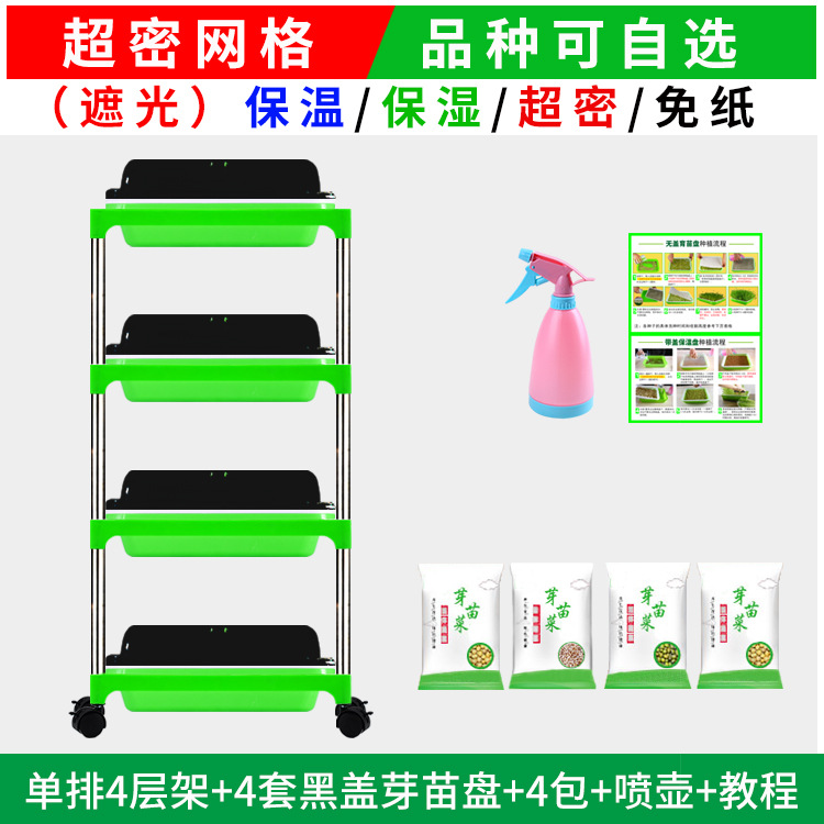 • 단일 행 4겹/4 검정색 뚜껑 새싹 트레이 + 4팩 + 물뿌리개