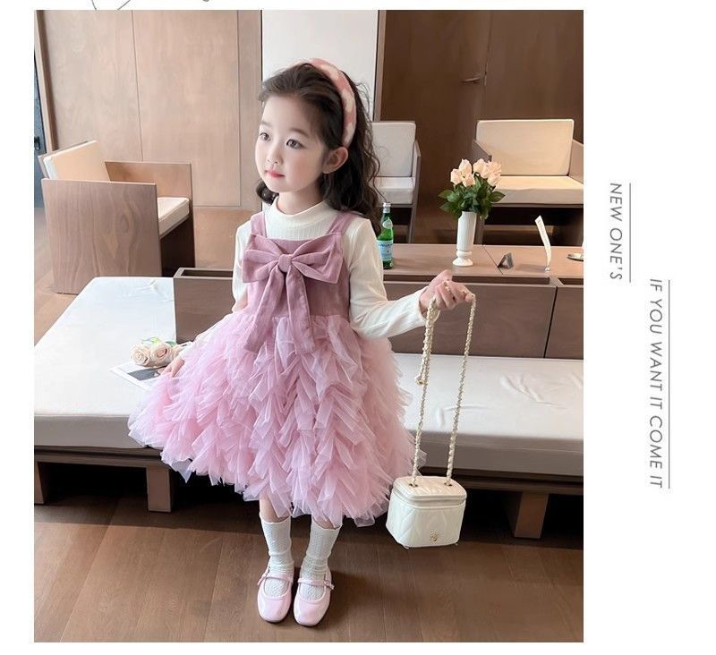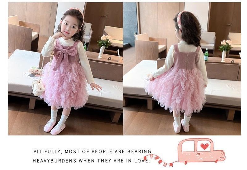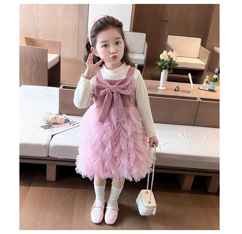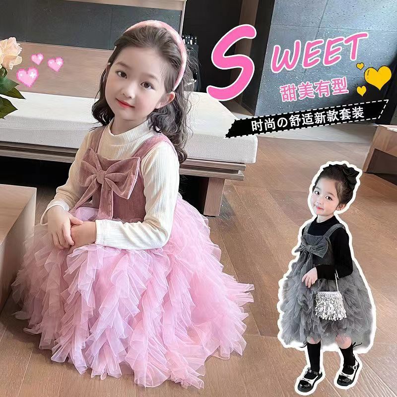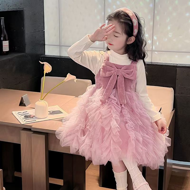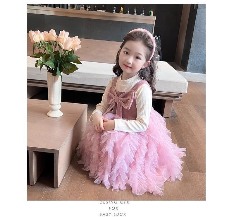 여자 원피스 세트 가을 겨울 2024 새로운 작은 소녀 푹신한 메쉬 원피스 아기 슬링 공주 원피스스토어 가기