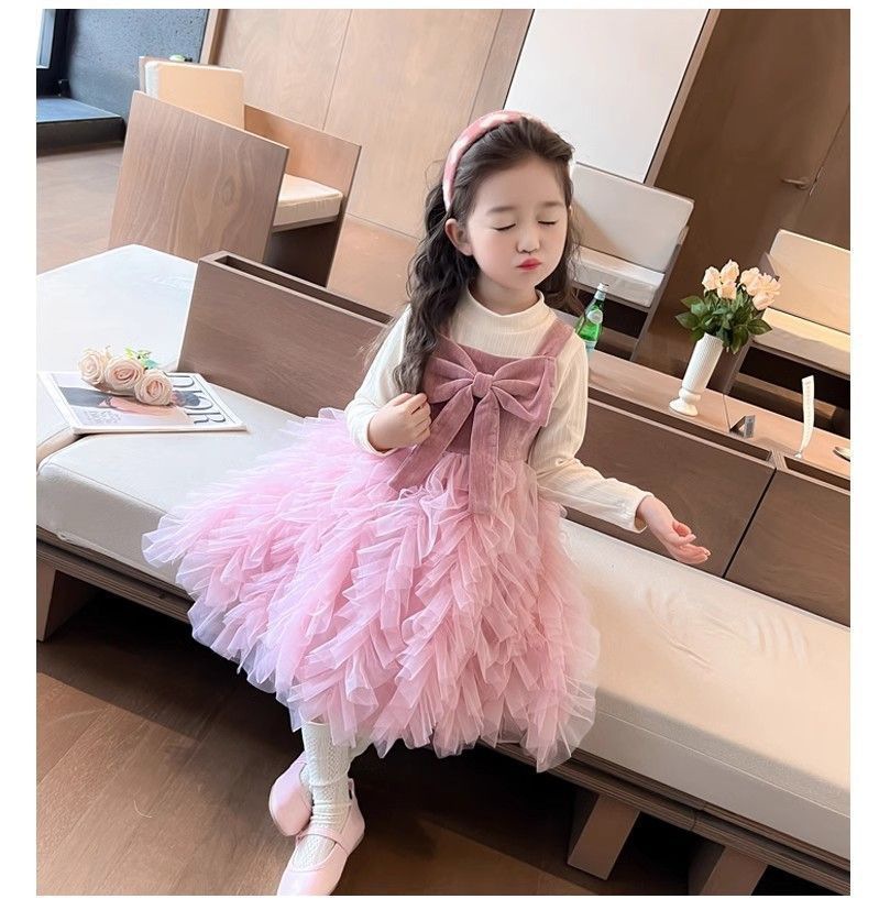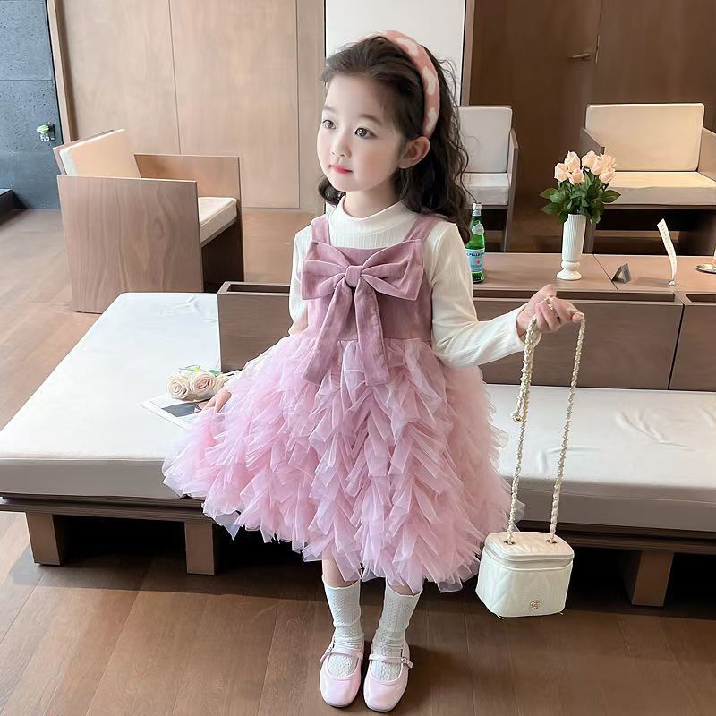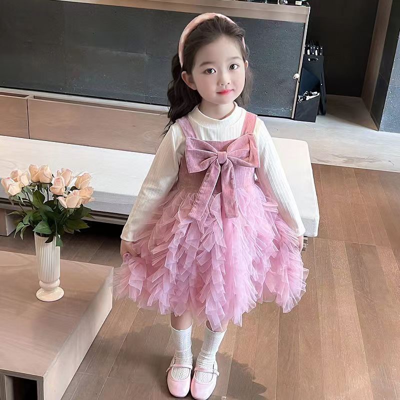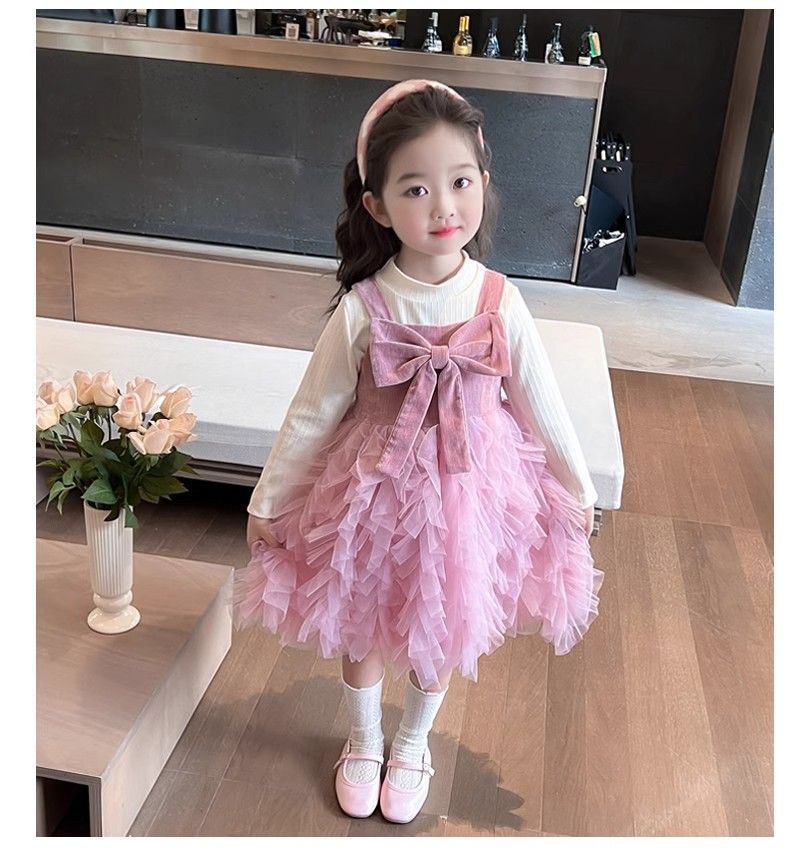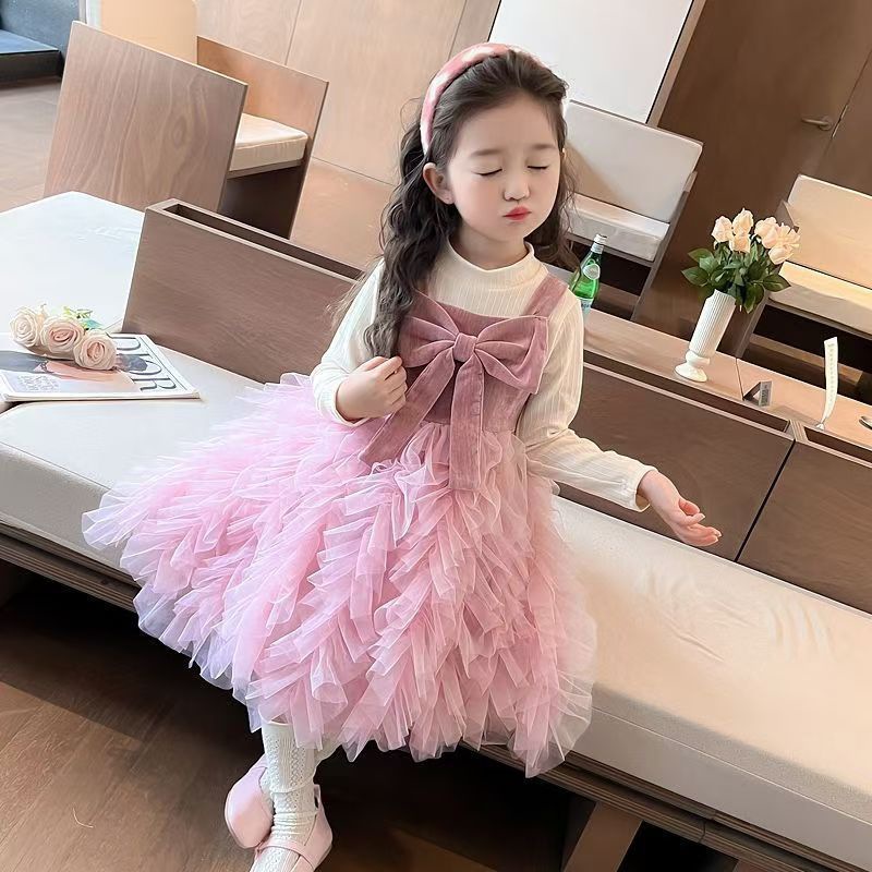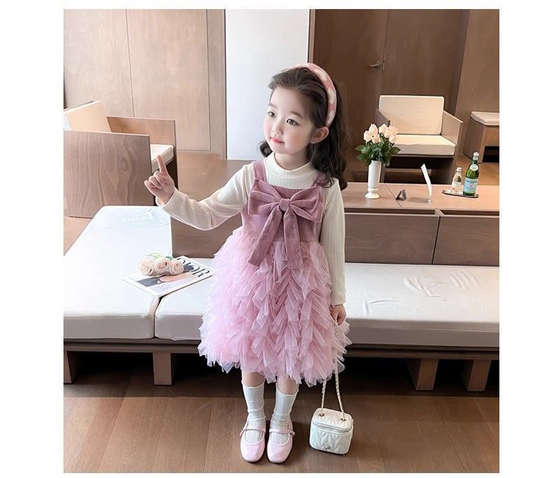 여자 원피스 세트 가을 겨울 2024 새로운 작은 소녀 푹신한 메쉬 원피스 아기 슬링 공주 원피스스토어 가기