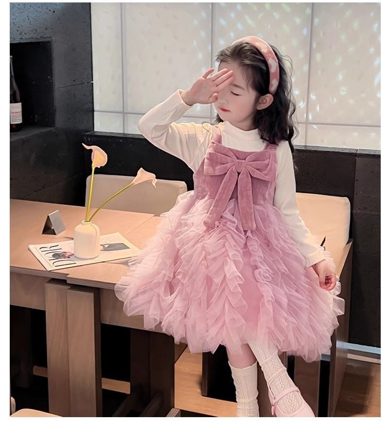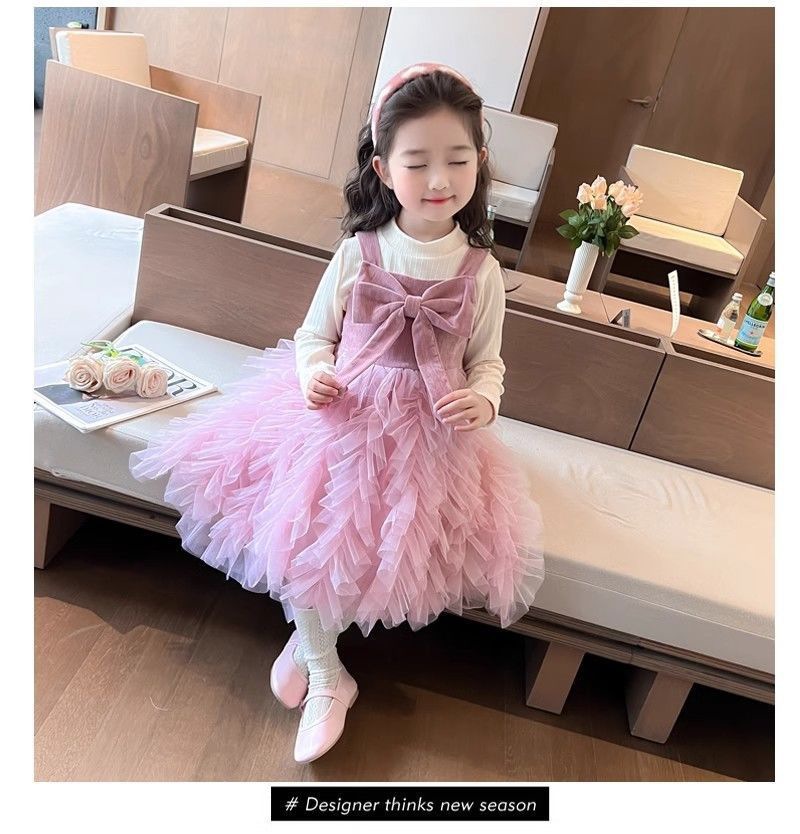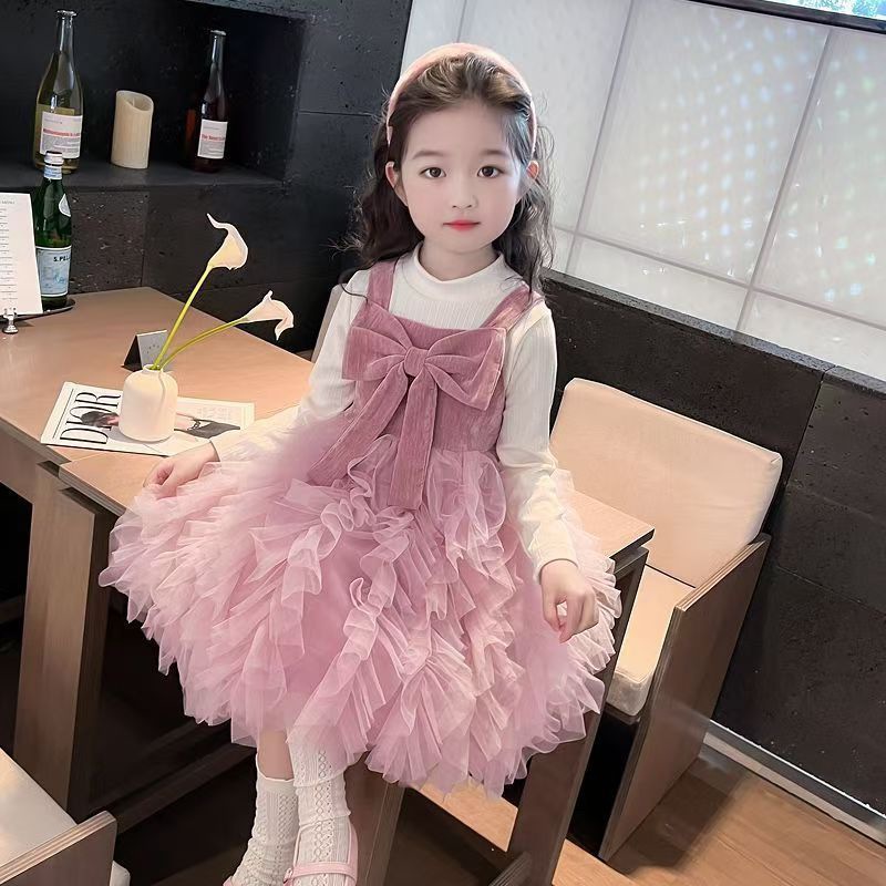여자 원피스 세트 가을 겨울 2024 새로운 작은 소녀 푹신한 메쉬 원피스 아기 슬링 공주 원피스