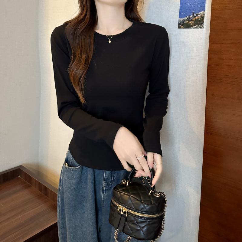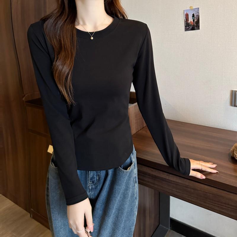 짧은 곡선 둥근 목베이스 셔츠 슬림핏 내부 긴 소매 여성 가을 및 겨울 한국식 단색 틈새 올 매치 양털 탑