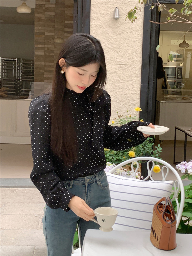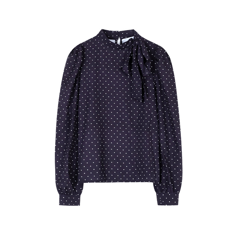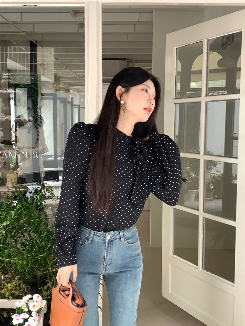 프랑스 스타일 활 타이 업 폴로 닷 셔츠 여성의 봄과 가을 디자인 세련된 캐주얼 퍼프 슬리브 스타일 탑