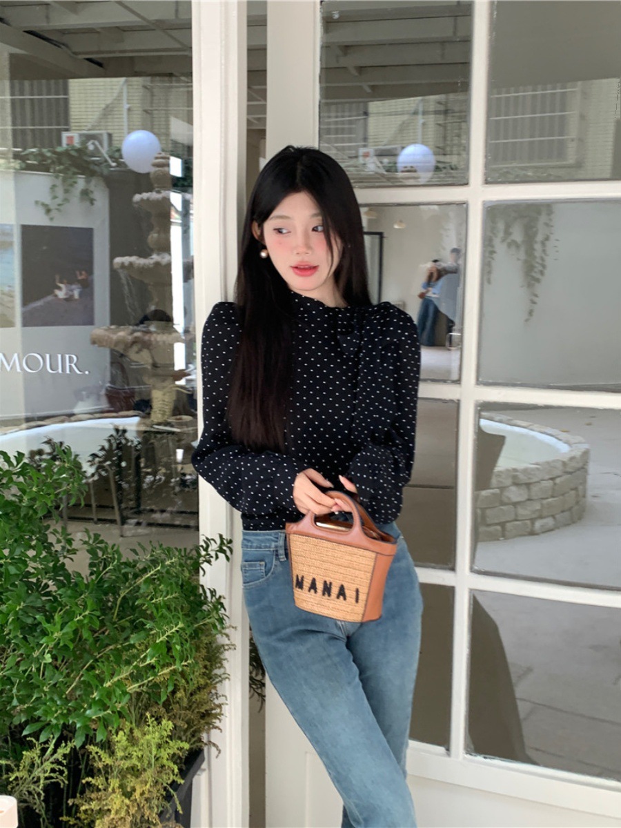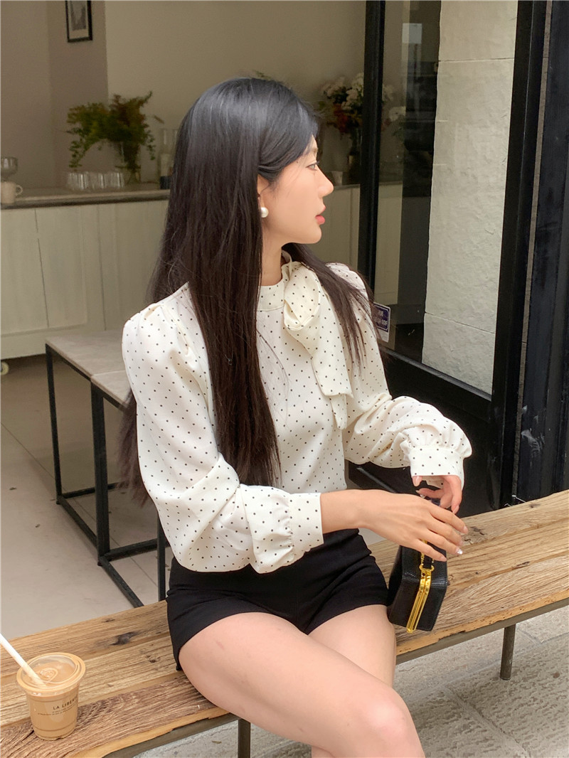 프랑스 스타일 활 타이 업 폴로 닷 셔츠 여성의 봄과 가을 디자인 세련된 캐주얼 퍼프 슬리브 스타일 탑스토어 가기