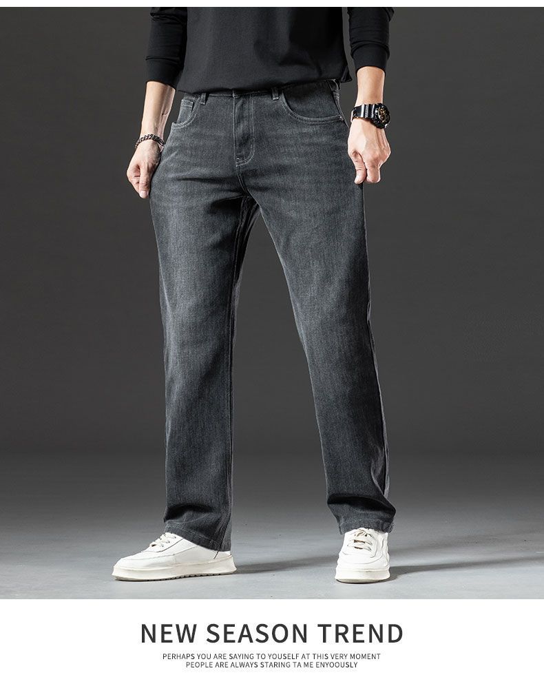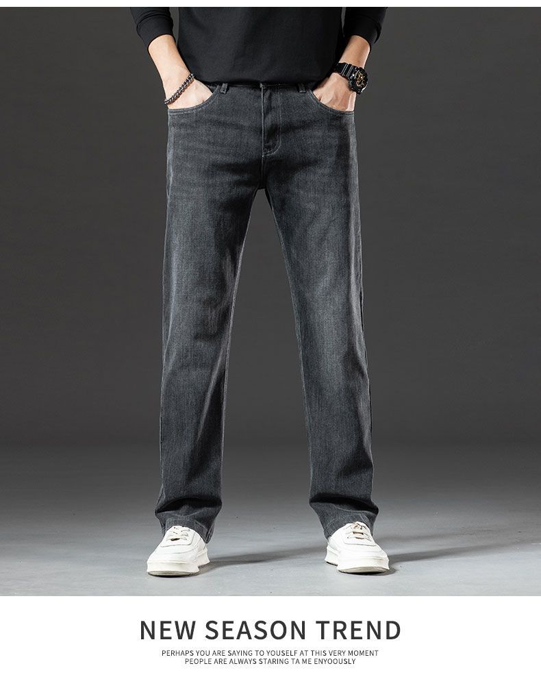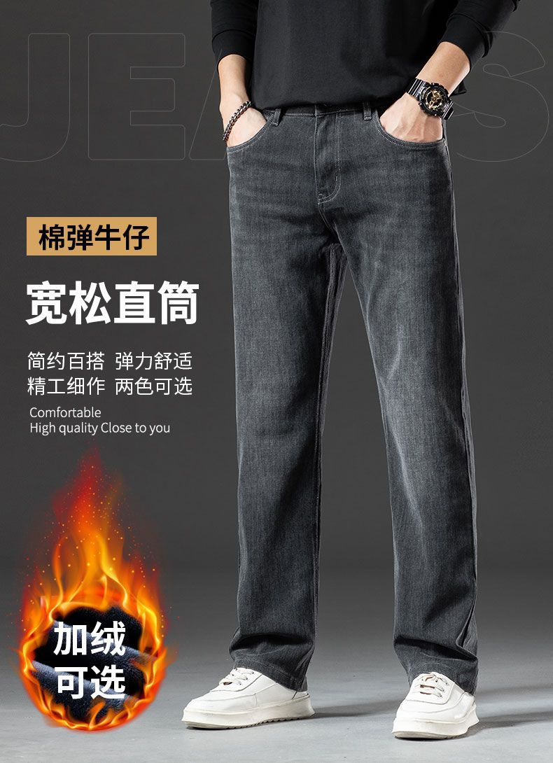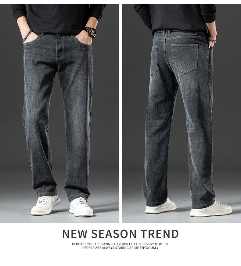 홍콩 2025 봄 가을 블랙 그레이 데님 팬츠 남성용 스트레이트 핏 중년용 신축성 캐주얼 롱 팬츠 다용도 플리스 안감