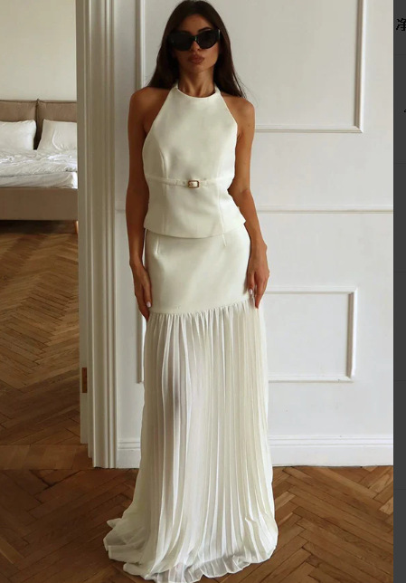 단색 민소매 목 짧은 최고 치마 세트 국경 패션 캐주얼 백리스 조끼 주름 치마 투피스 세트