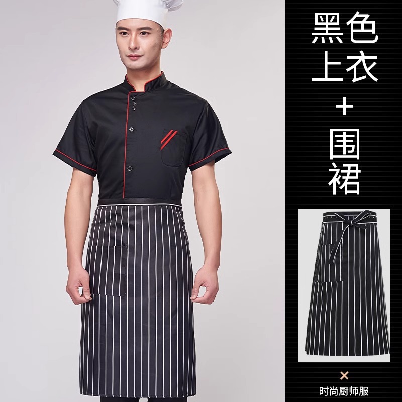 • 쓰리버튼 블랙 반팔 + 스트라이프 앞치마