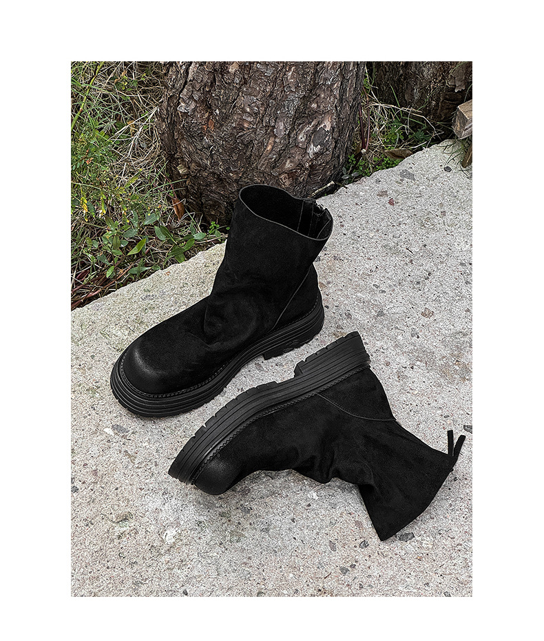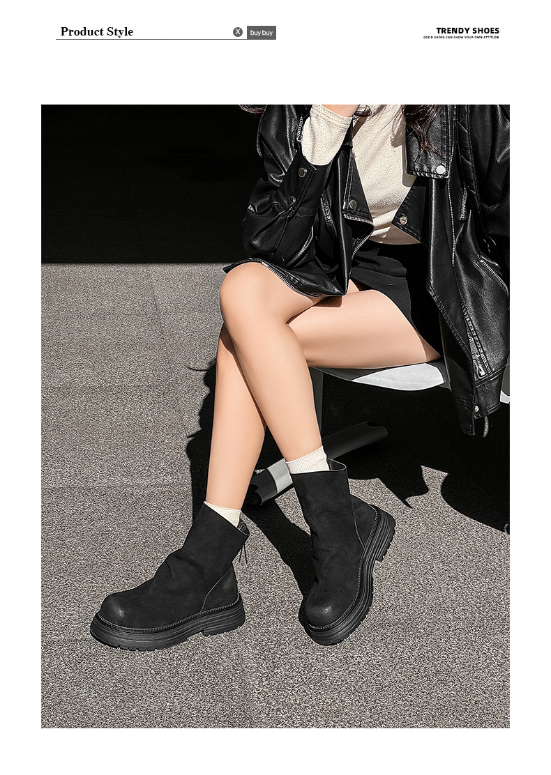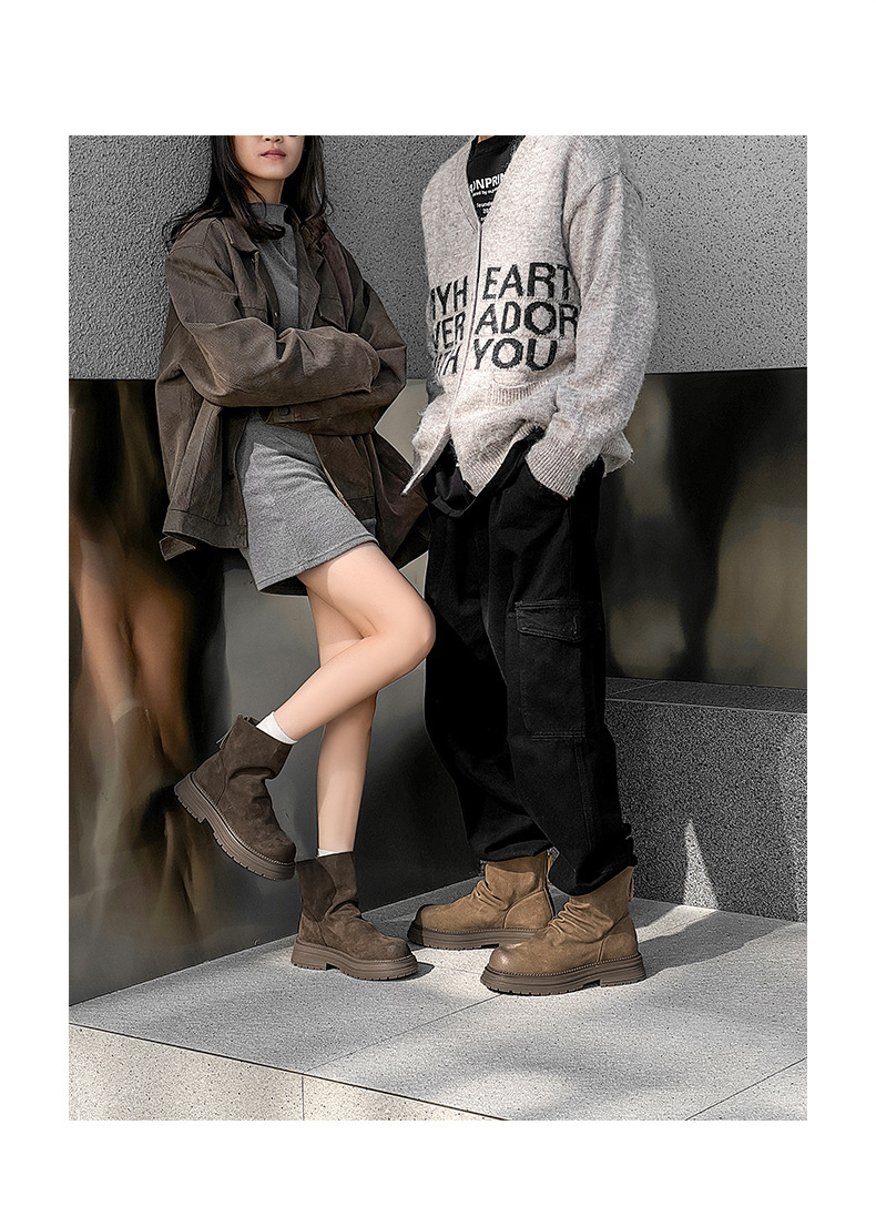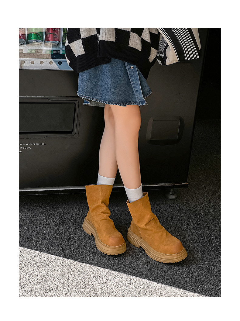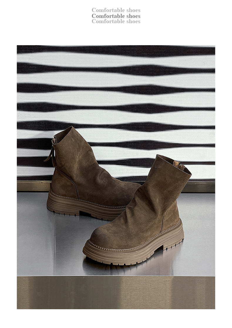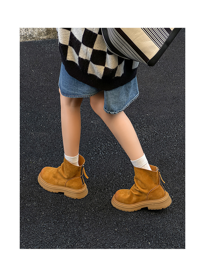 2024 가을 및 겨울 새로운 주름 디자인 짧은 부츠 후면 지퍼 라운드 컬러 닦는 반전 부츠 두꺼운 바닥 스크럽 기계 부츠