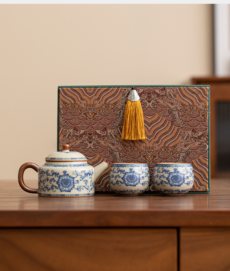 • 루야오 파란색과 흰색 냄비 1개와 컵 2개(매화 손 냄비/자수 브로케이드 상자)