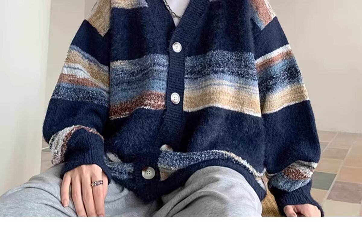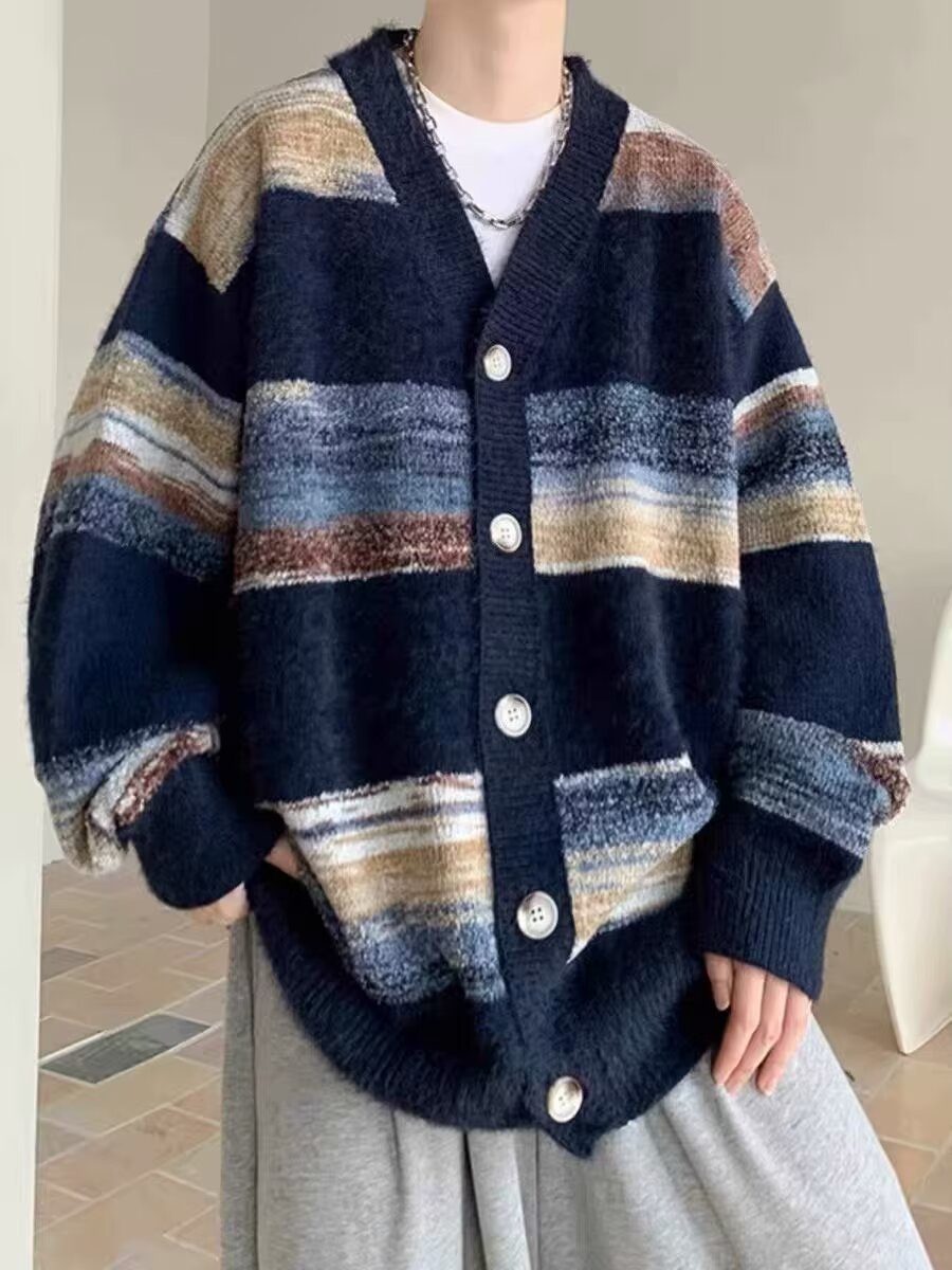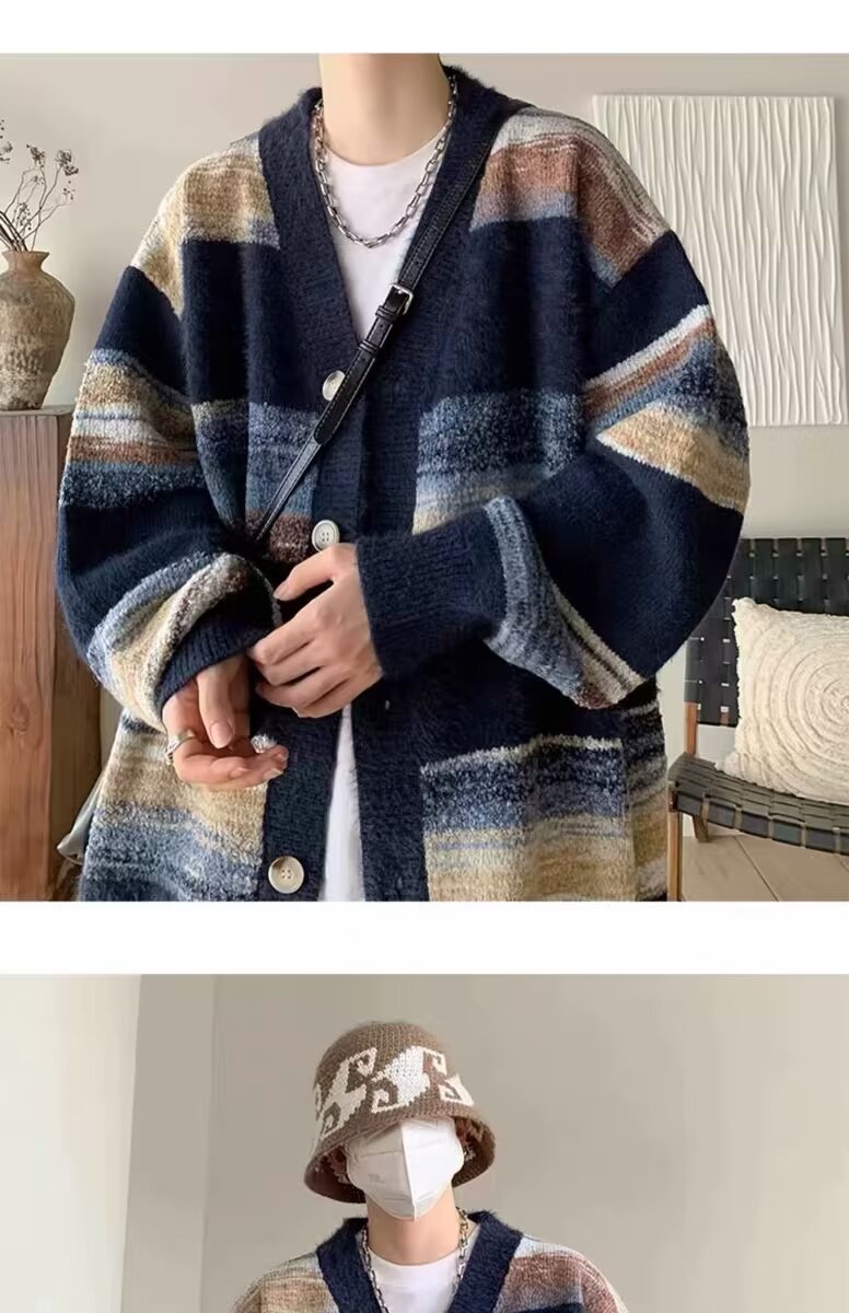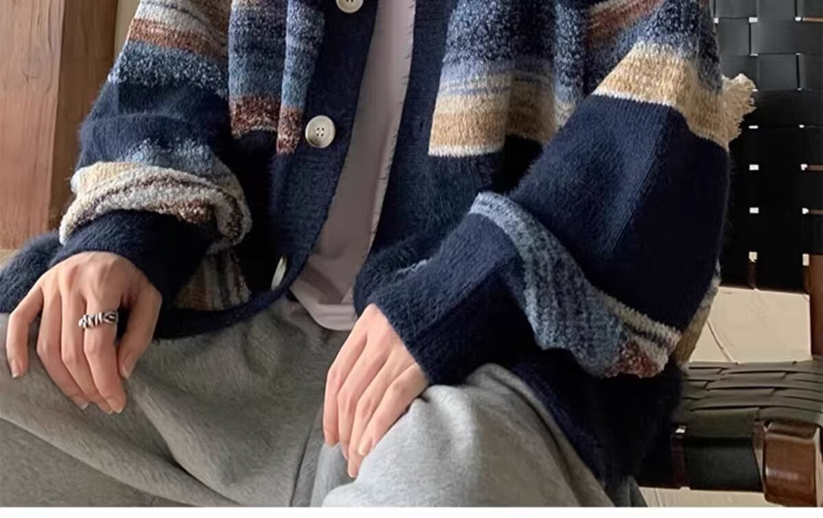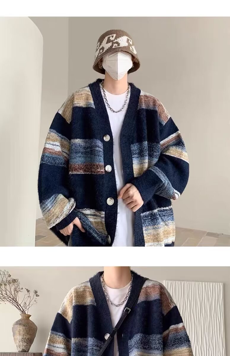 대비 컬러 스트라이프 카디건 스웨터 남성 가을과 겨울 새로운 바람 니트 코트 디자인 센스 커플 라인 의류 헤어 세대스토어 가기