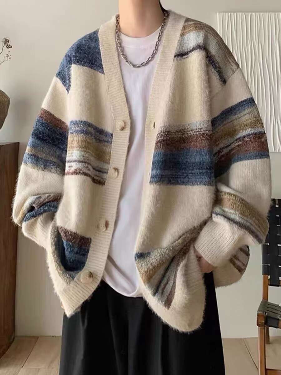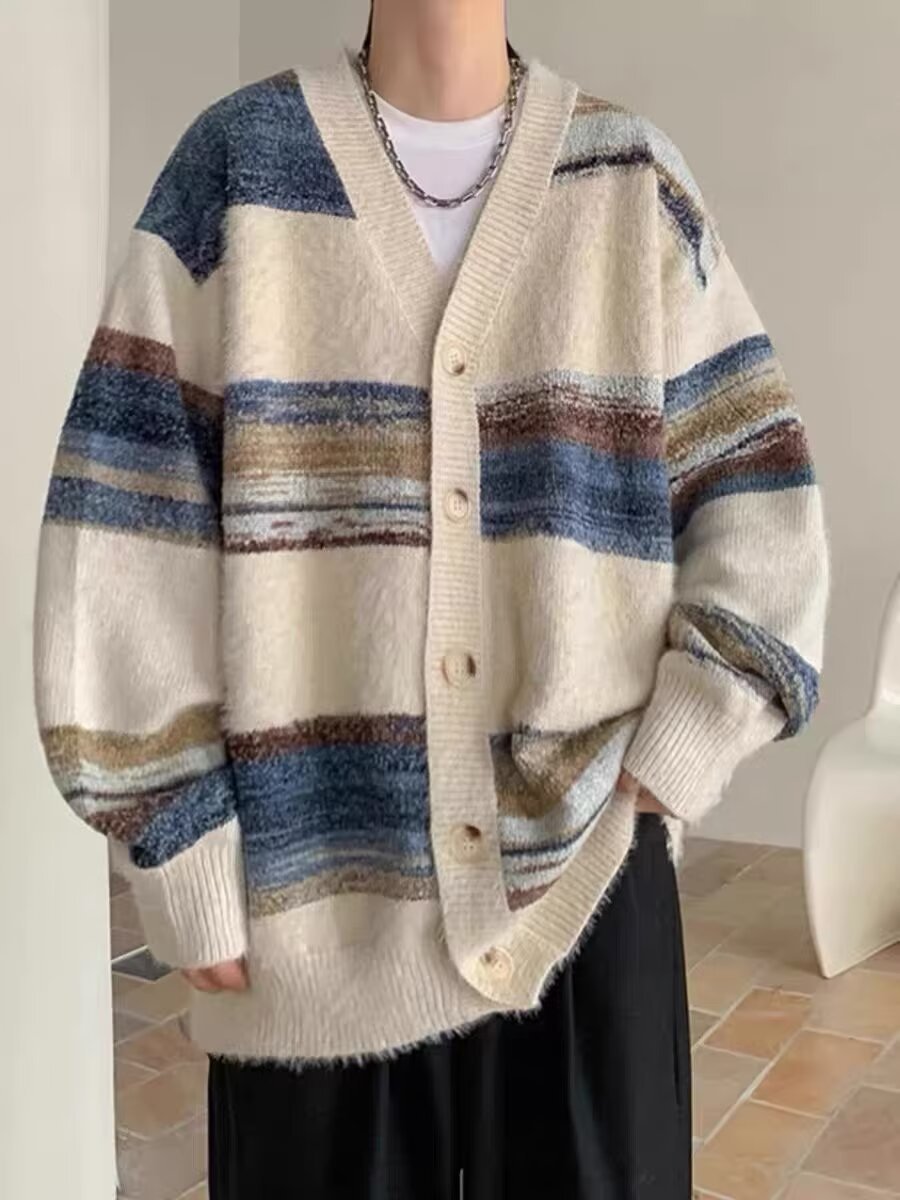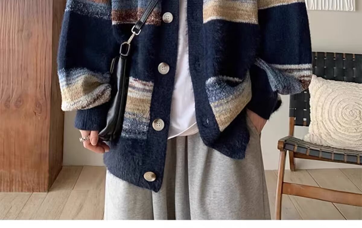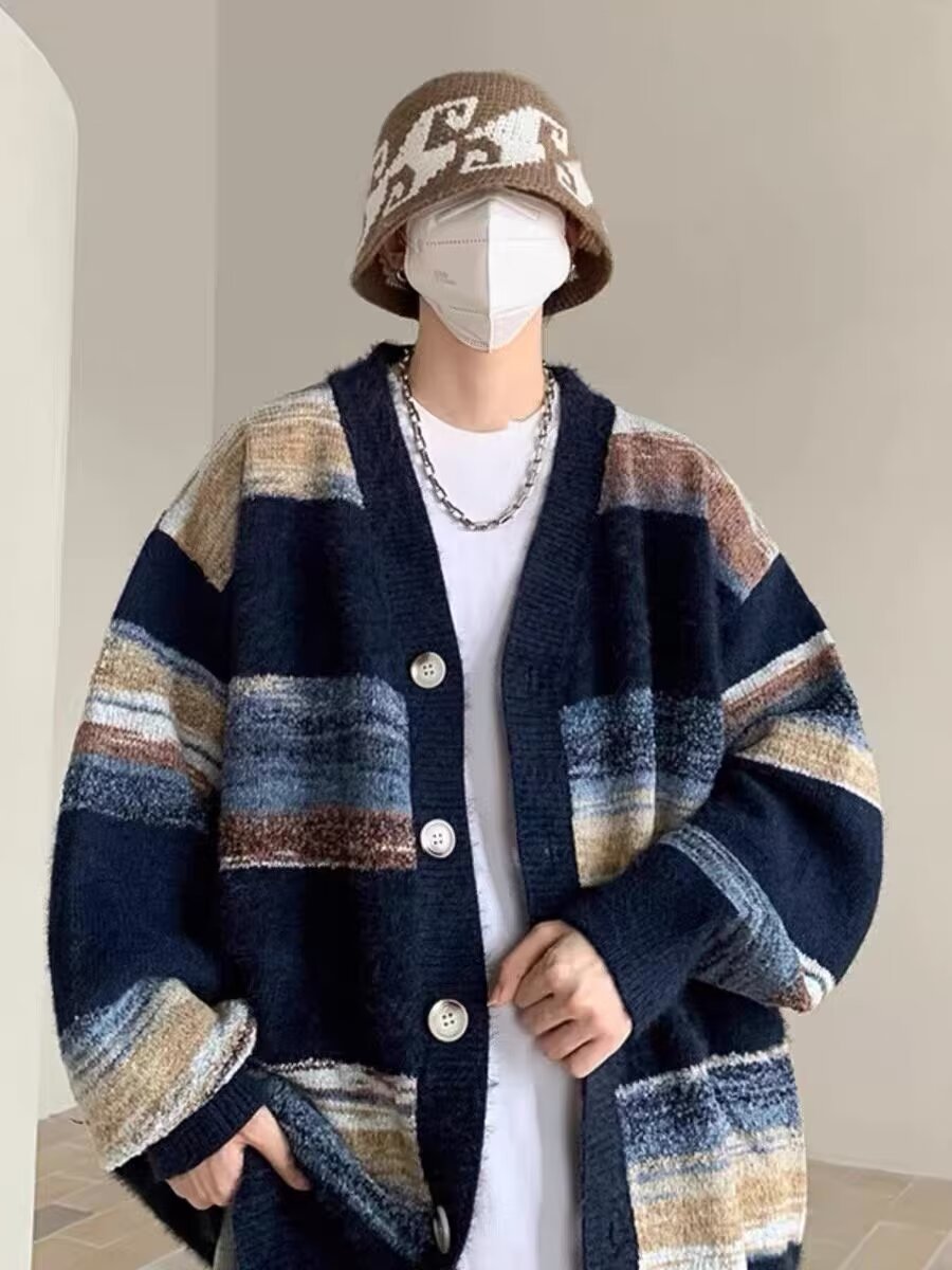 대비 컬러 스트라이프 카디건 스웨터 남성 가을과 겨울 새로운 바람 니트 코트 디자인 센스 커플 라인 의류 헤어 세대스토어 가기