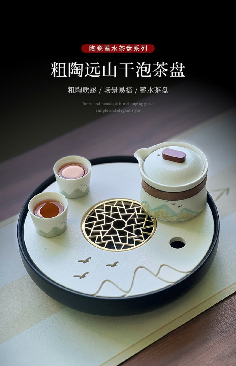 둥근 세라믹 차 트레이 홈 오피스 게스트 회의 복고풍 물 저장 쿵푸 차 세트 트레이 작은 건조 양조 차 테이블
