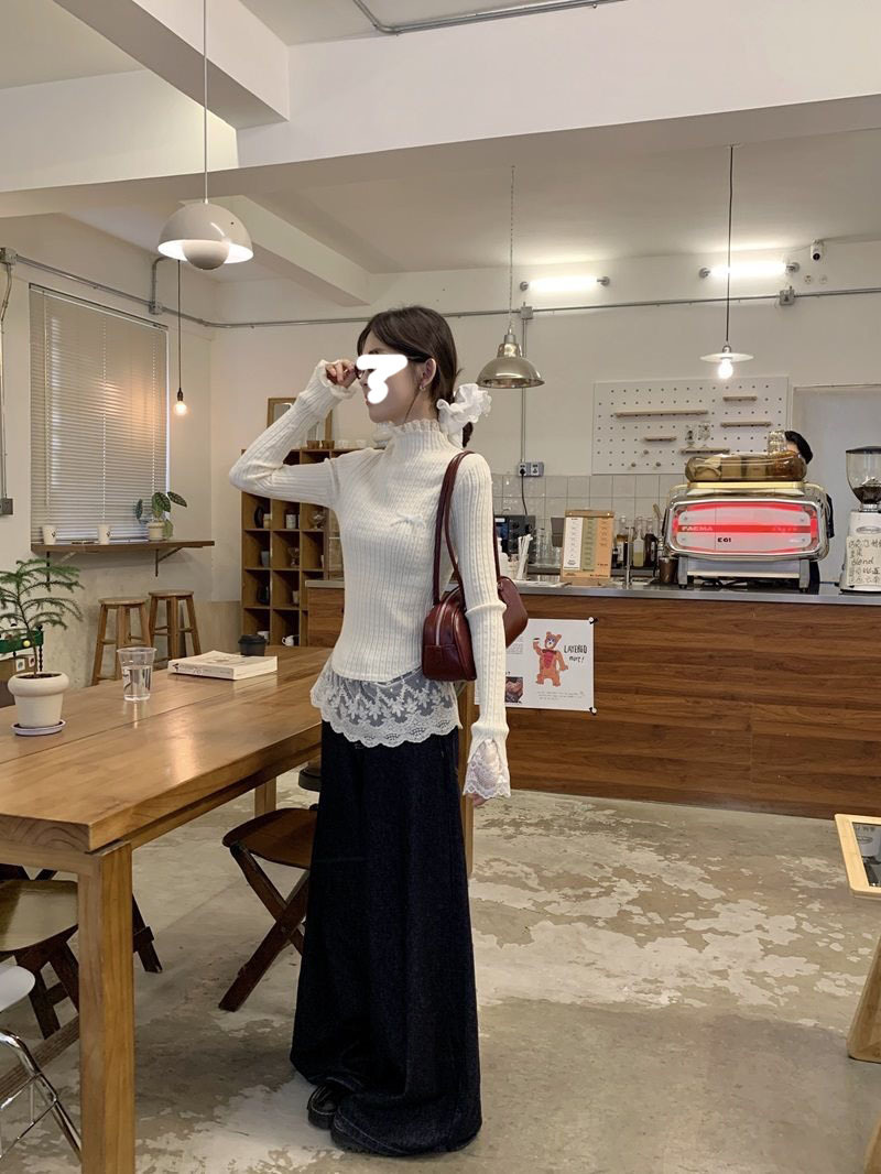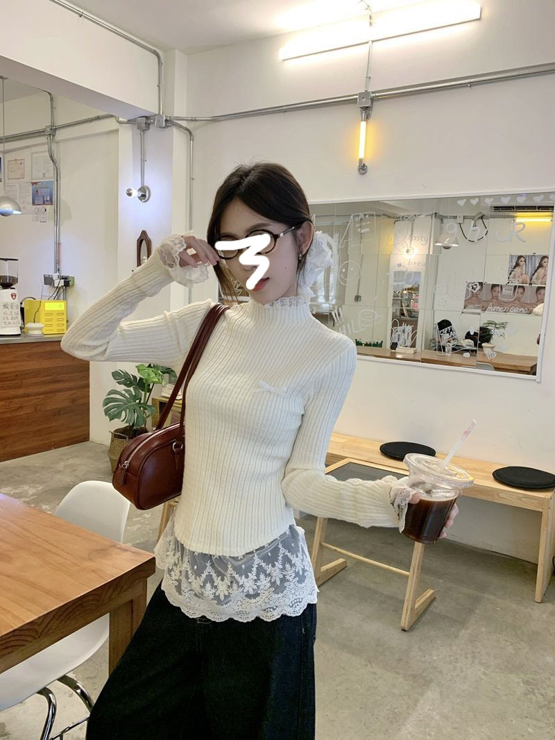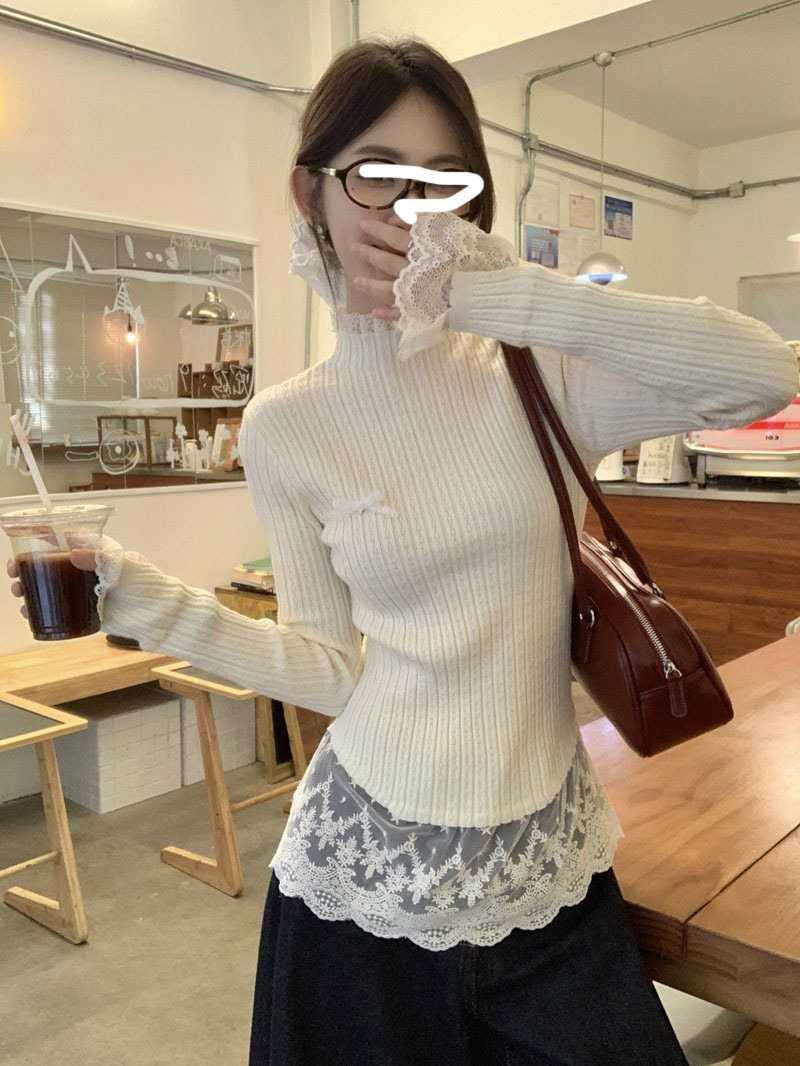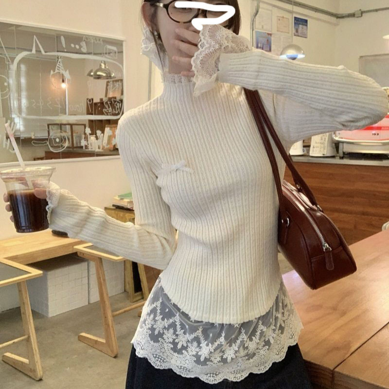 한국식 화이트 하프 하이 칼라 레이스 바느질 니트 베이스 셔츠 여성용 가을 겨울 샤넬 스타일 내부 슬림 핏 스웨터 탑