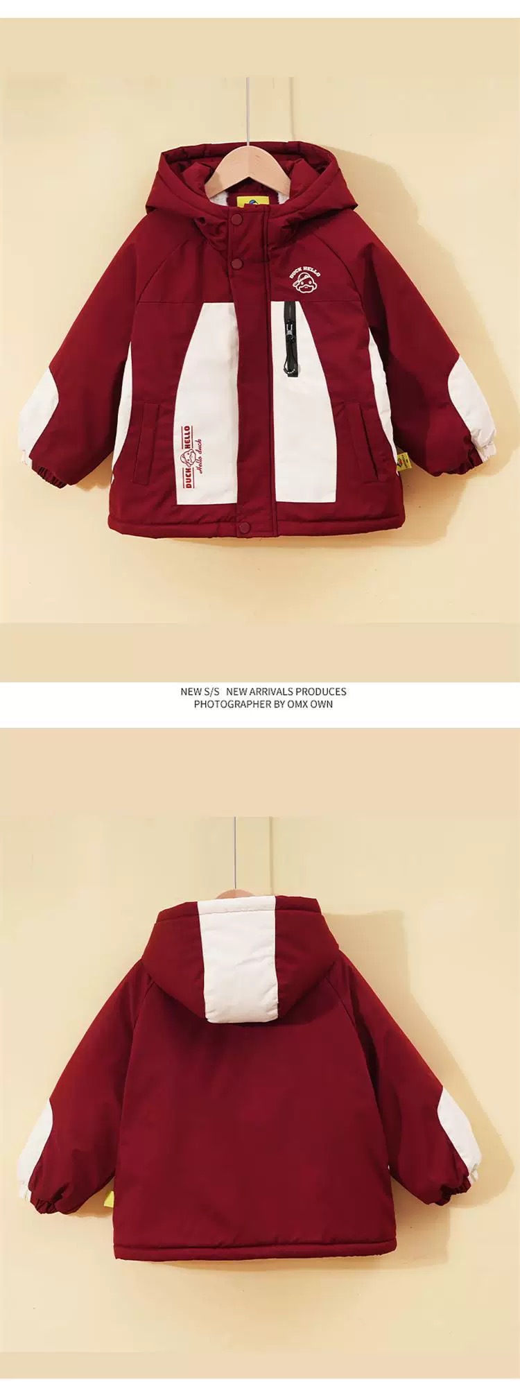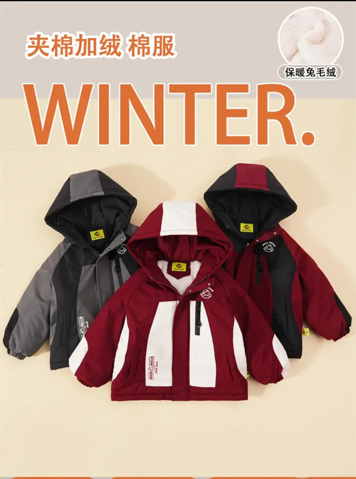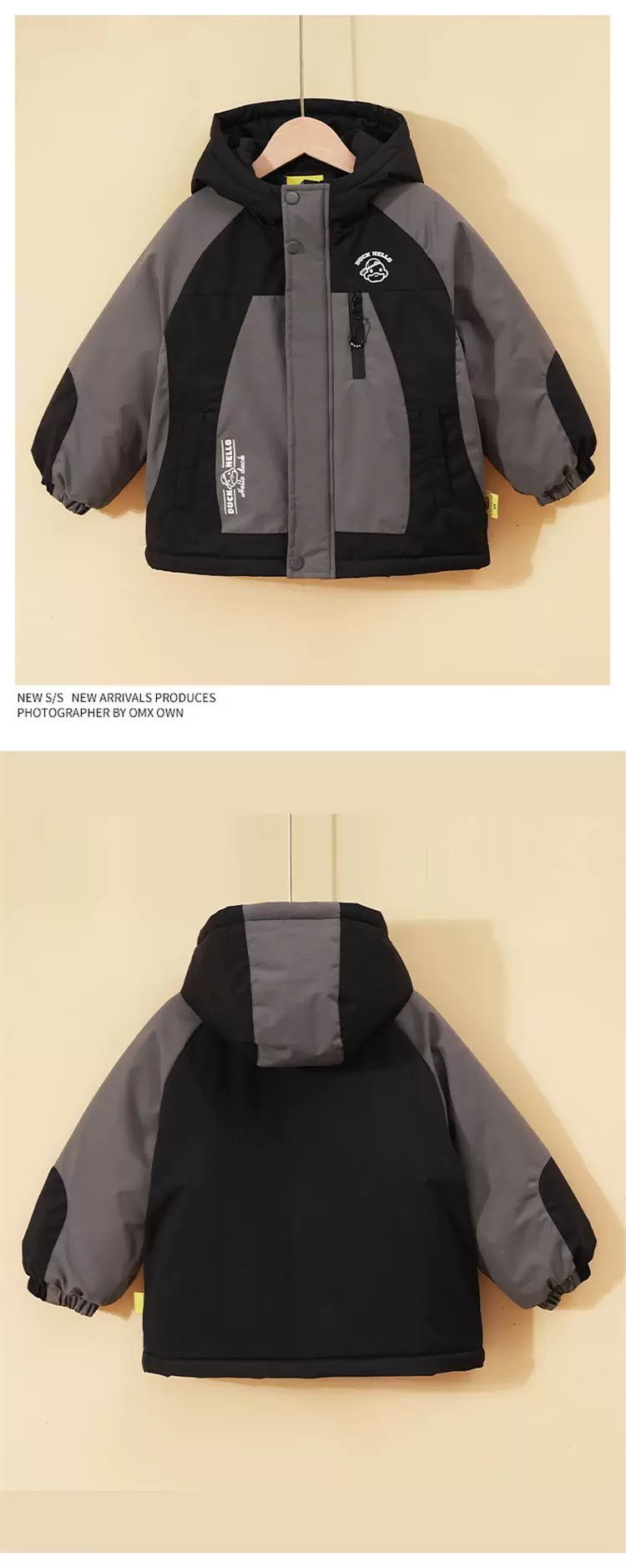 2024 년 새로운 노란색 오리 어린이 두꺼운 기모 면화 코트 소년 소녀 아기 후드 컬러 매칭 겨울 코트스토어 가기