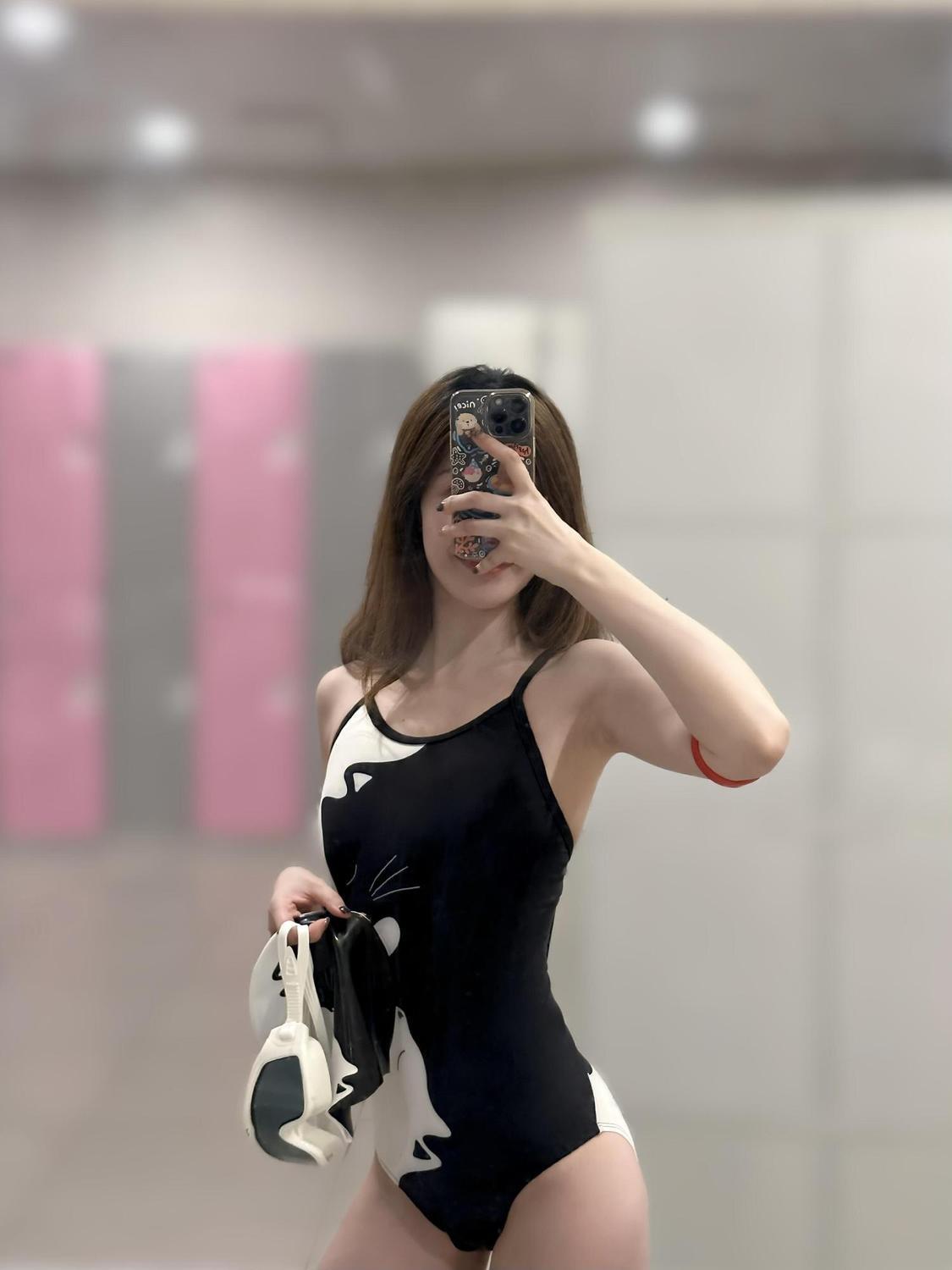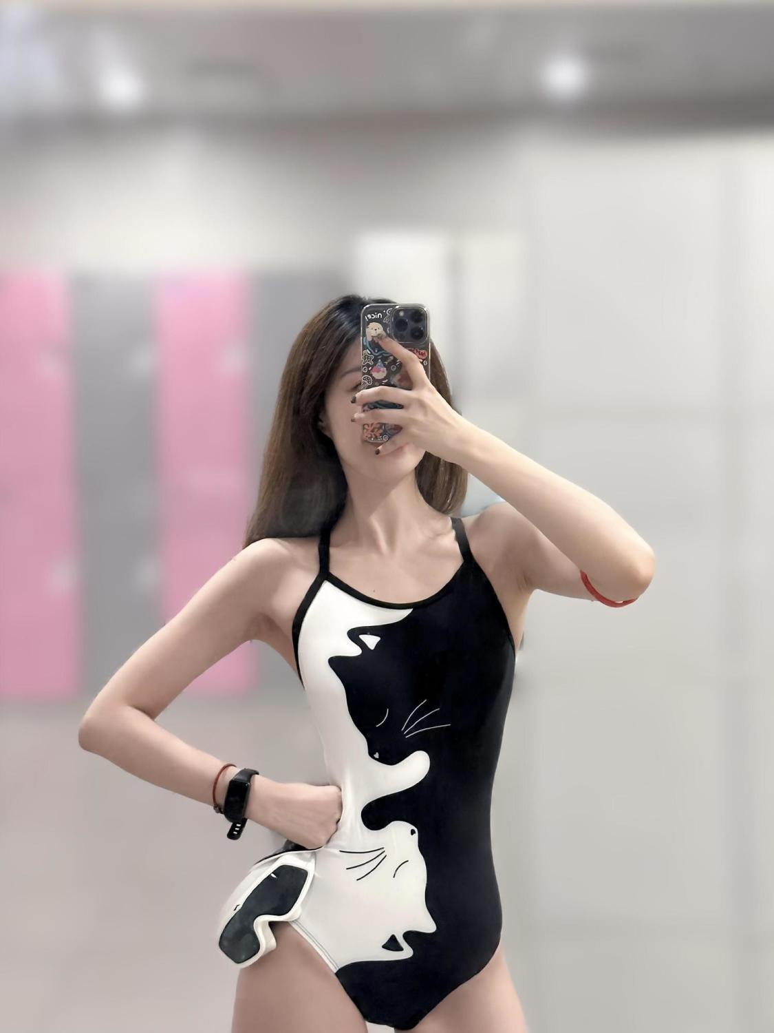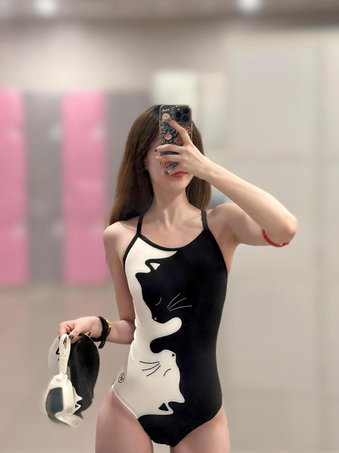 검은 색과 흰색 고양이 귀여운 결합 된 삼각형 레이싱 수영복 여성의 얇은 어깨 스트랩 프로 스포츠 수영장 더블 레이어 가슴 패드스토어 가기