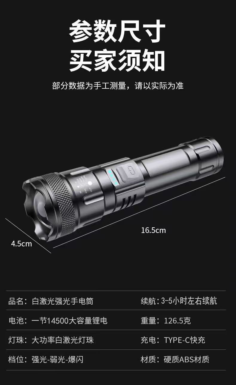 국경 간 손전등 USB 흰색 레이저 휴대용 충전 슈퍼 밝은 비상 야외 조명 줌 장거리 스포트라이트