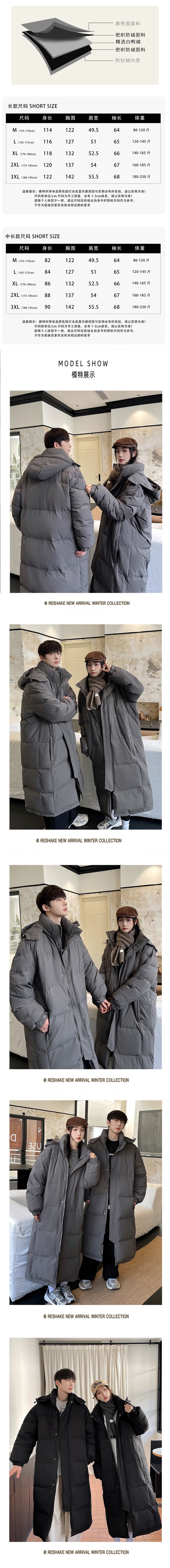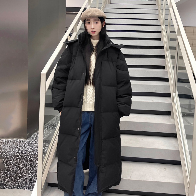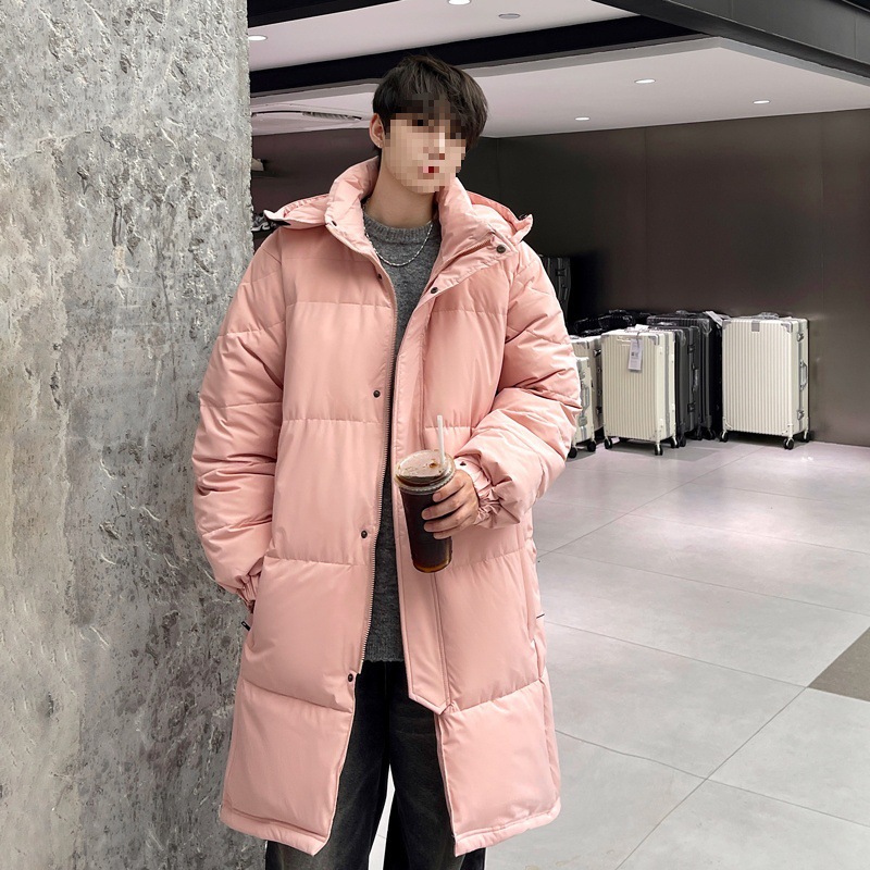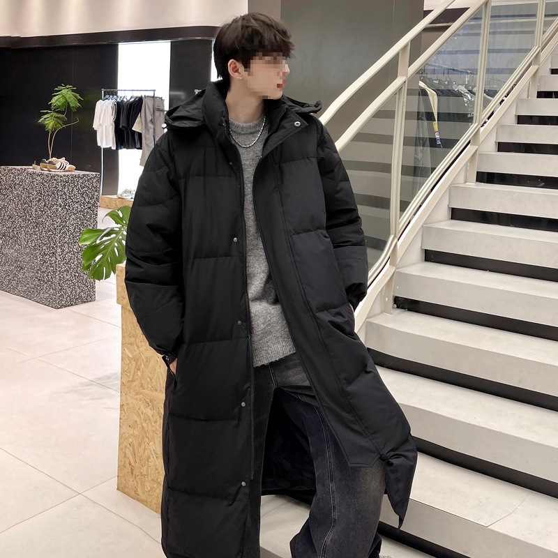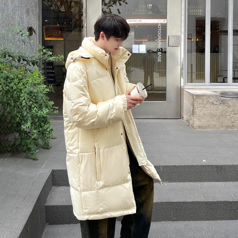 다운 재킷 남자 2024 년 겨울 새로운 중간 길이 두꺼운 따뜻한 무릎 높은 대학생 커플 북동쪽 방한복