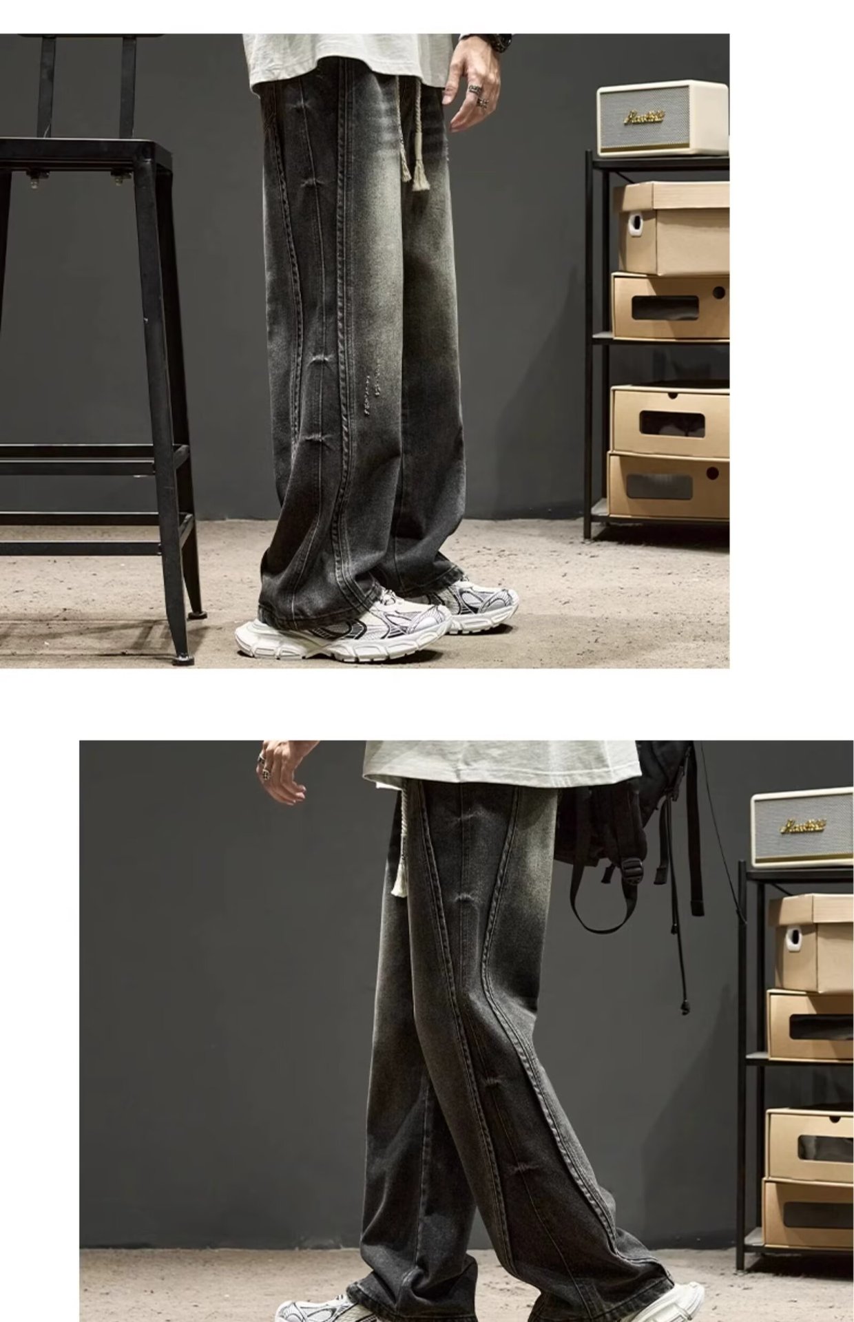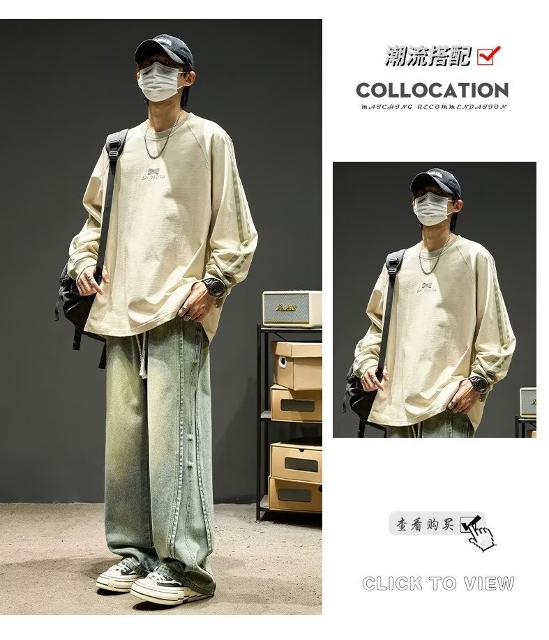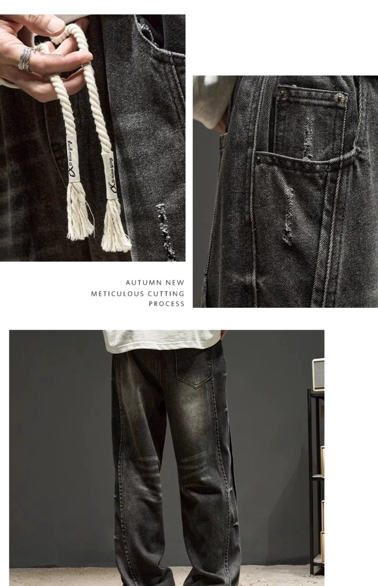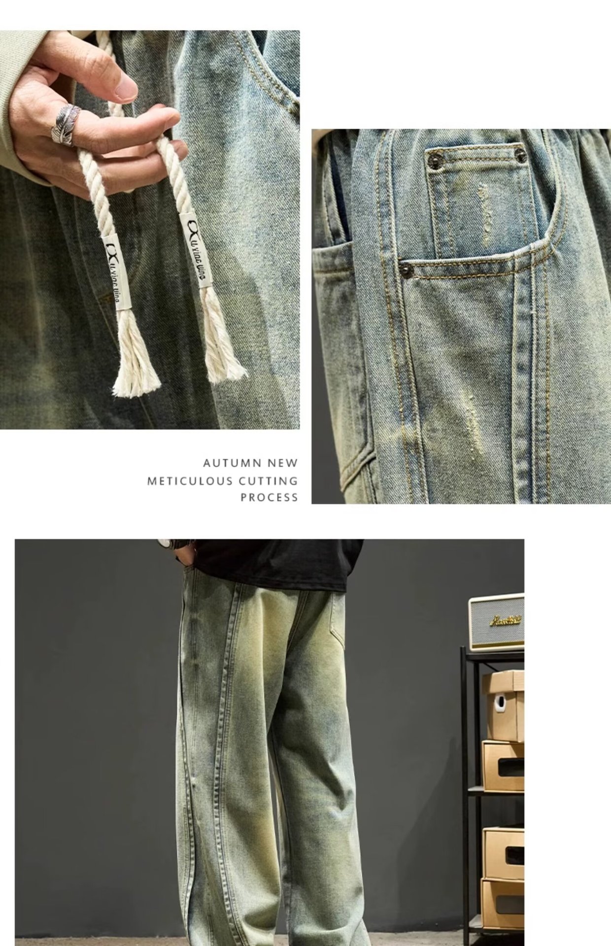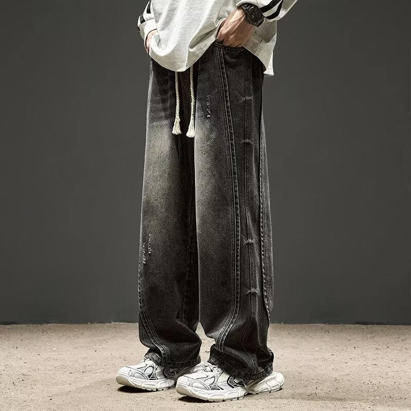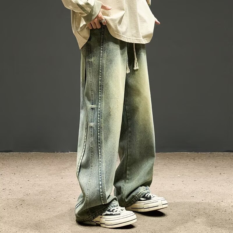 국경 간 일본 스타일 빈티지 바느질 세탁 청바지 남성용 트렌디 올매치 느슨하고 잘 생긴 다리 바지스토어 가기