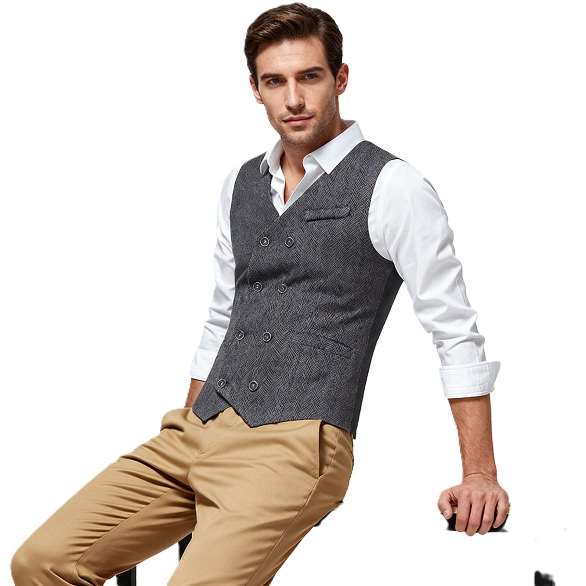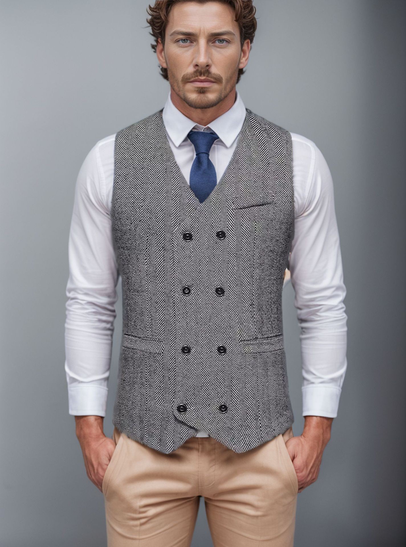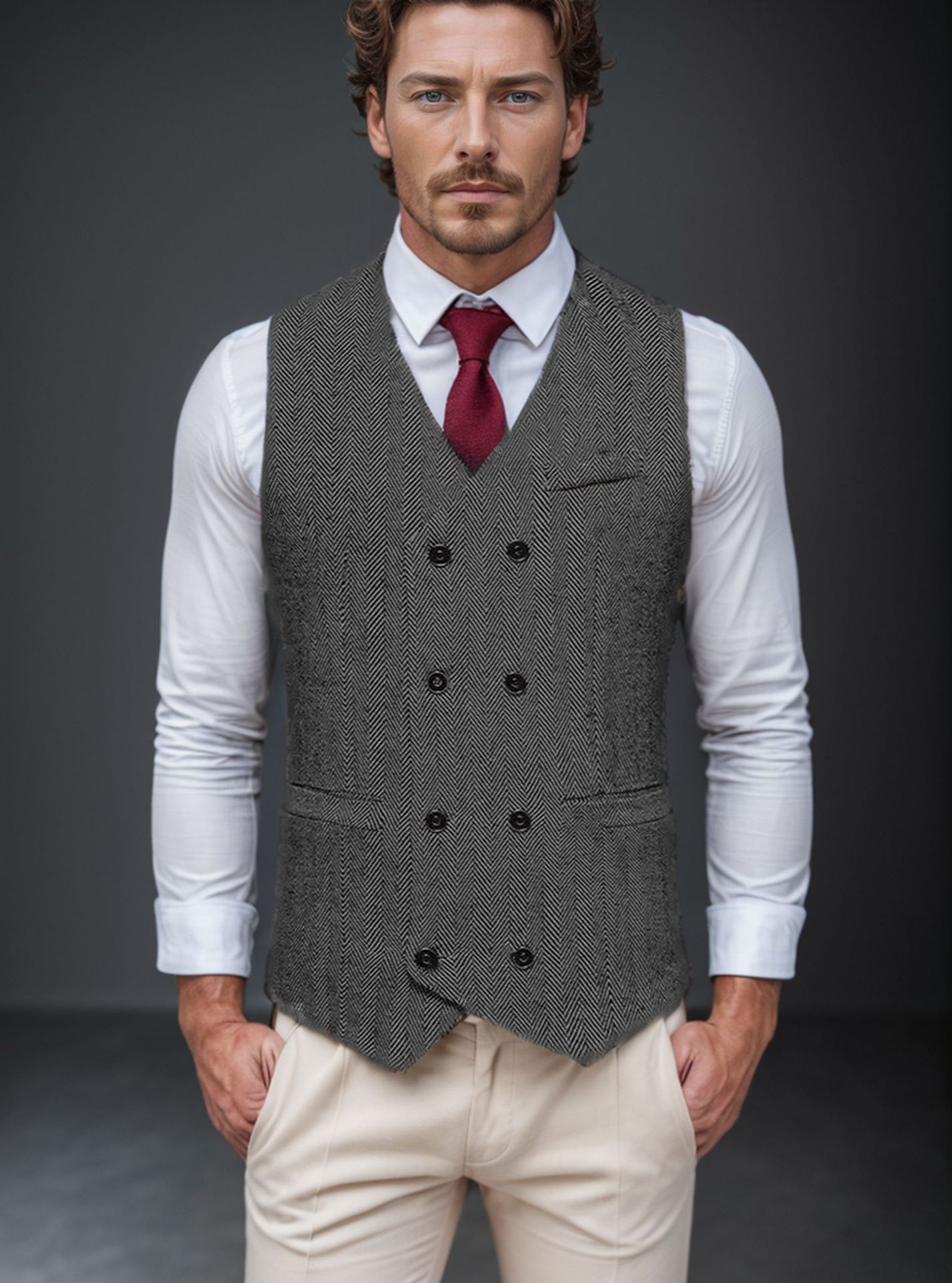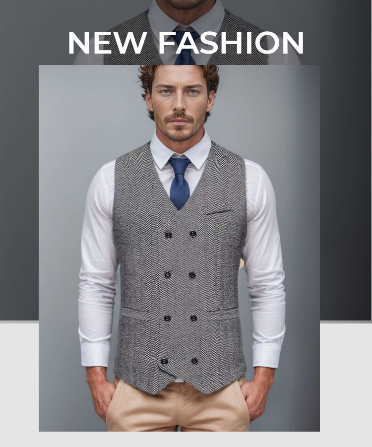 2024 국경을 넘는 봄과 가을 남성 세트 조끼 헤링본 트위드 세트 조끼 빈티지 더블 브레스트 V 넥 조끼