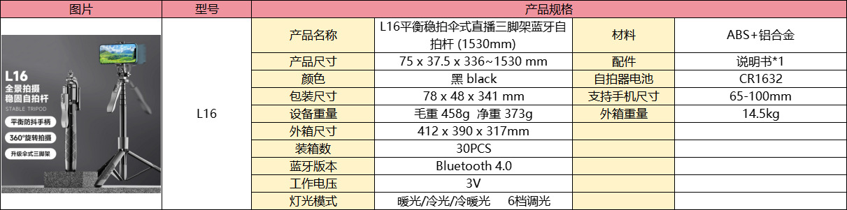 국경 간 휴대 전화 블루투스 셀카 스틱 L16 필 라이트 휴대용 안정기 바닥 텔레스코픽 스틱 야외 라이브 방송 브래킷