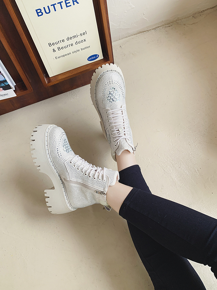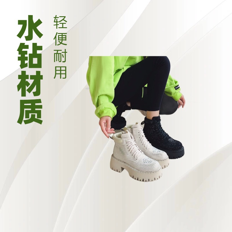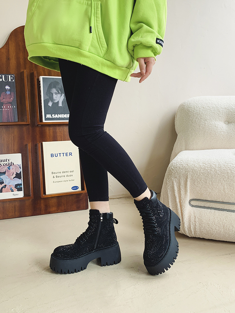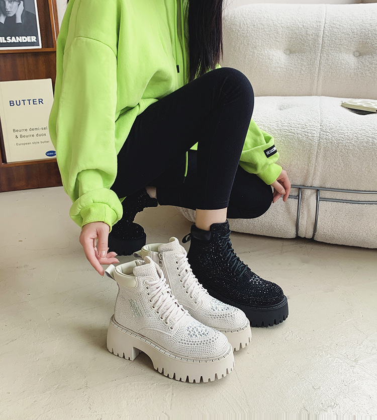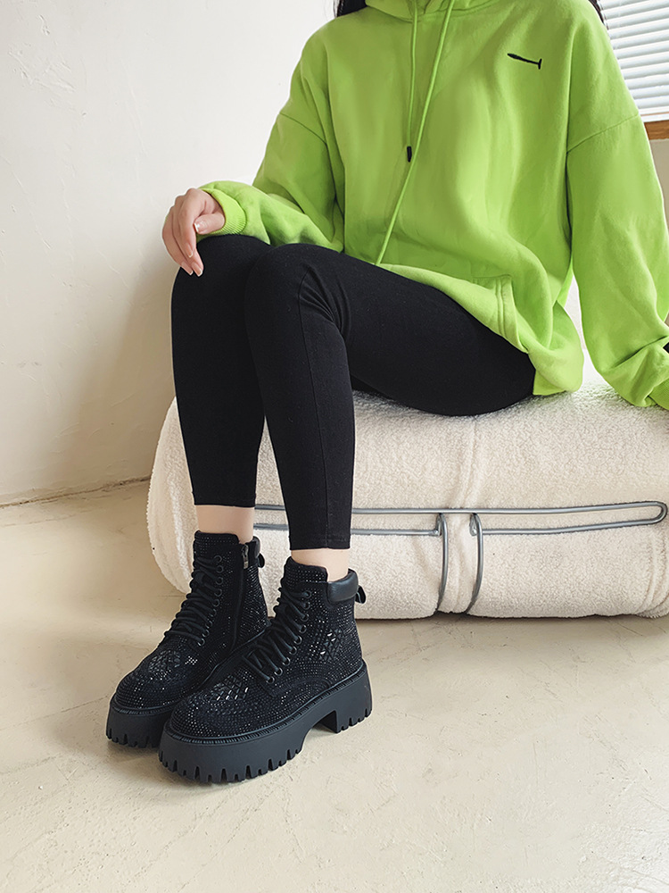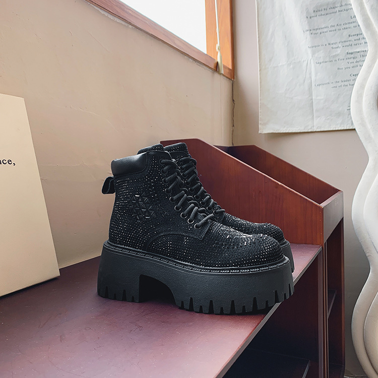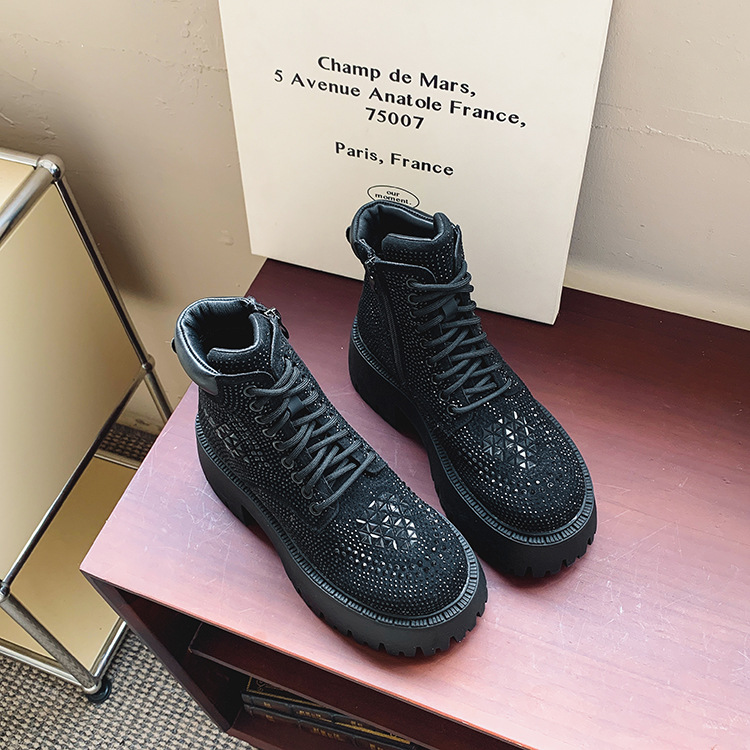 2025 풀 다이아몬드 장식 두꺼운 굽 숏부츠 방수 플랫폼 여성용 마틴 부츠 천연 가죽 스웨이드 끈 묶는 여성 신발 키높이스토어 가기