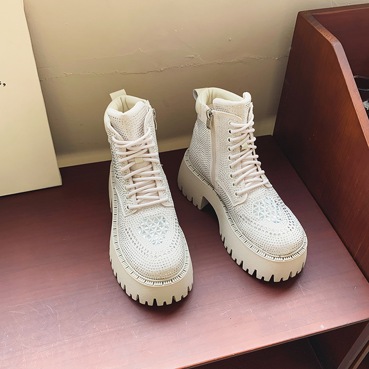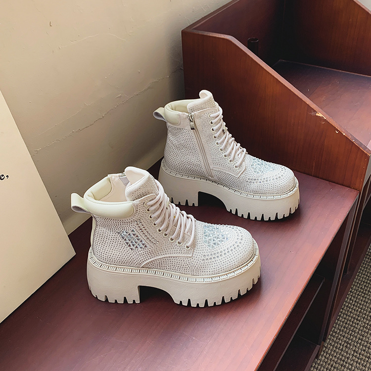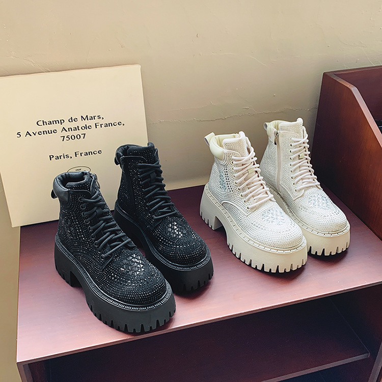 2025 풀 다이아몬드 장식 두꺼운 굽 숏부츠 방수 플랫폼 여성용 마틴 부츠 천연 가죽 스웨이드 끈 묶는 여성 신발 키높이