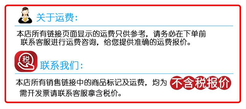 1.我们原则上不接受退货,所发产品均会通过产中、产后、发出前等多次检查,完全合格才发货,但各种不确定因素均会导致产品功能的丧失,我司只能保证98%的合格率,2%属免责范围。如产品因出厂质量问题的可协商换货,但所产生运输费用需要由买家负责,收到退回产品后我们会在客户下次进货时将换货一起发出,无法接受下次发货时一起发的情况,运费由客户自理且寄回前必须告知本商行旺旺客服!!!
