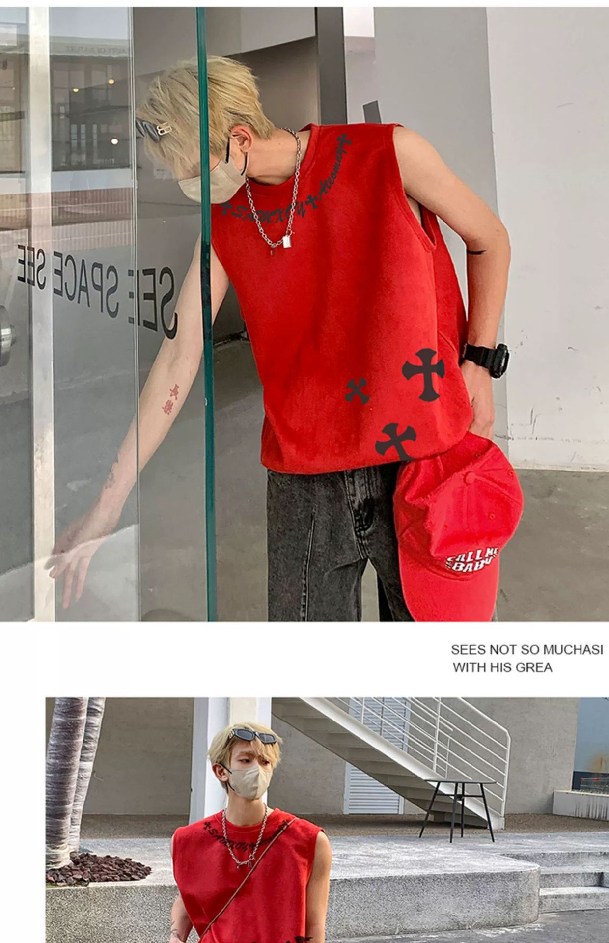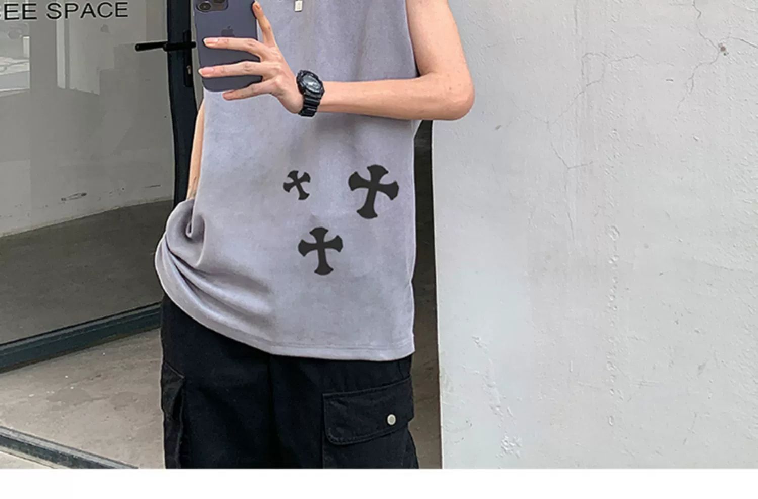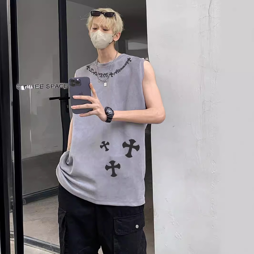 아메리칸 스타일 빈티지 크로스 프린트 스웨이드 스포츠 조끼 남자 여름 패션 브랜드 스트리트 힙합 민소매 티셔츠스토어 가기