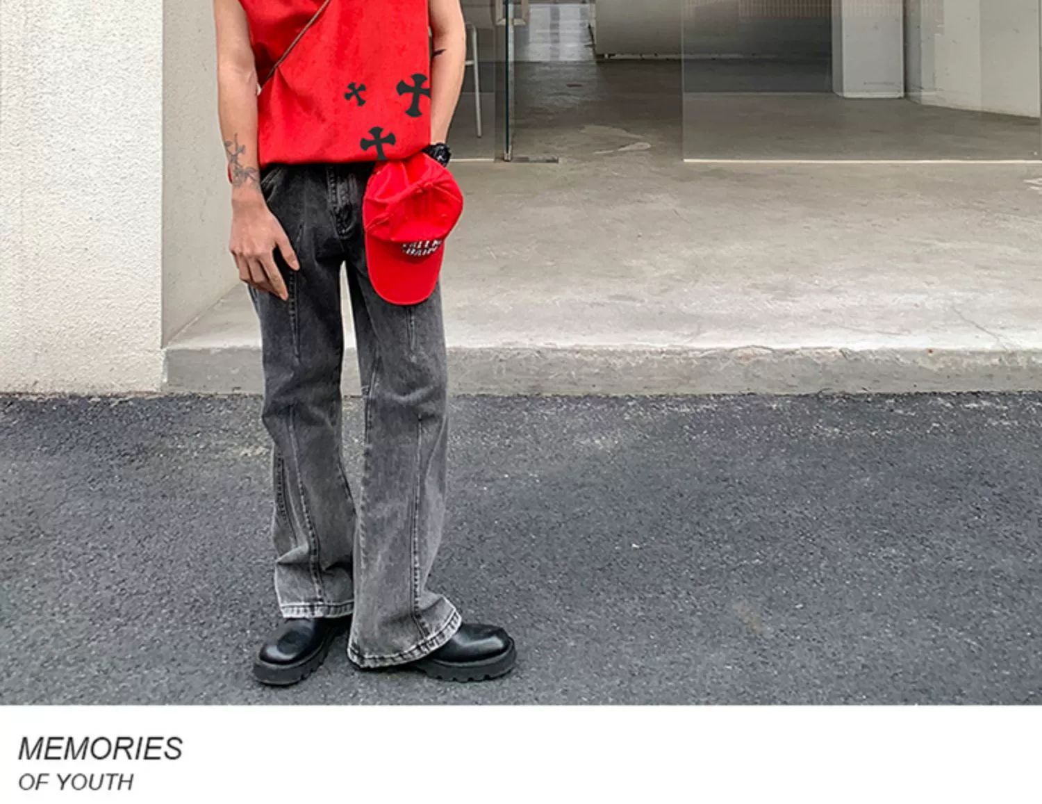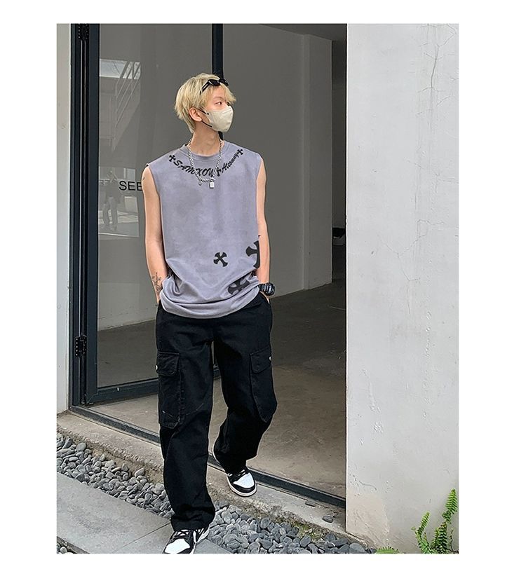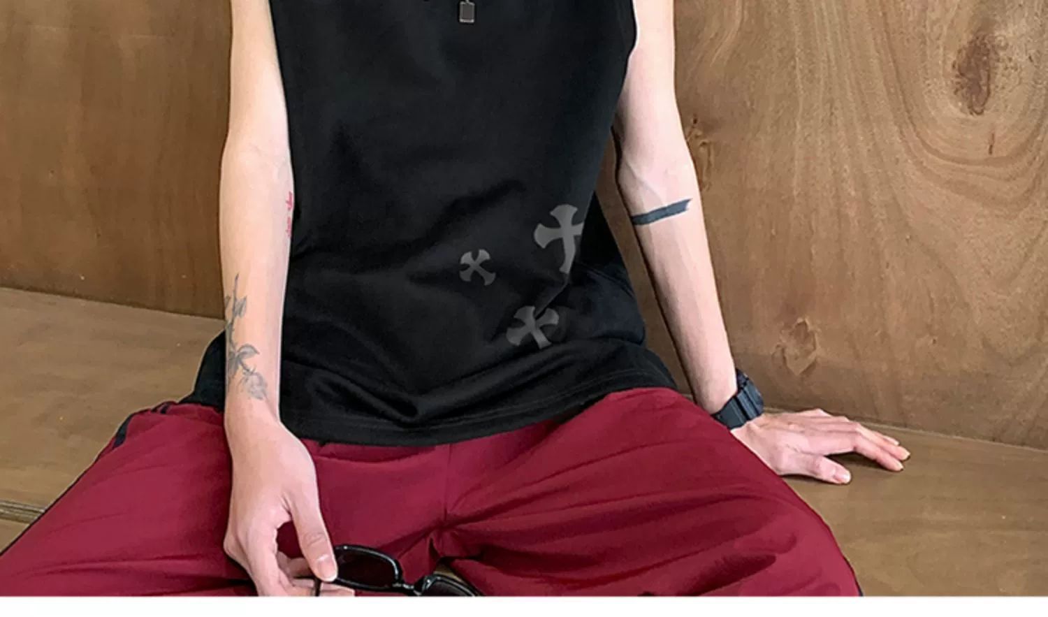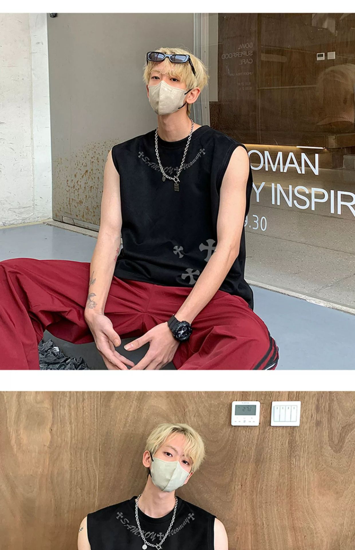 아메리칸 스타일 빈티지 크로스 프린트 스웨이드 스포츠 조끼 남자 여름 패션 브랜드 스트리트 힙합 민소매 티셔츠스토어 가기