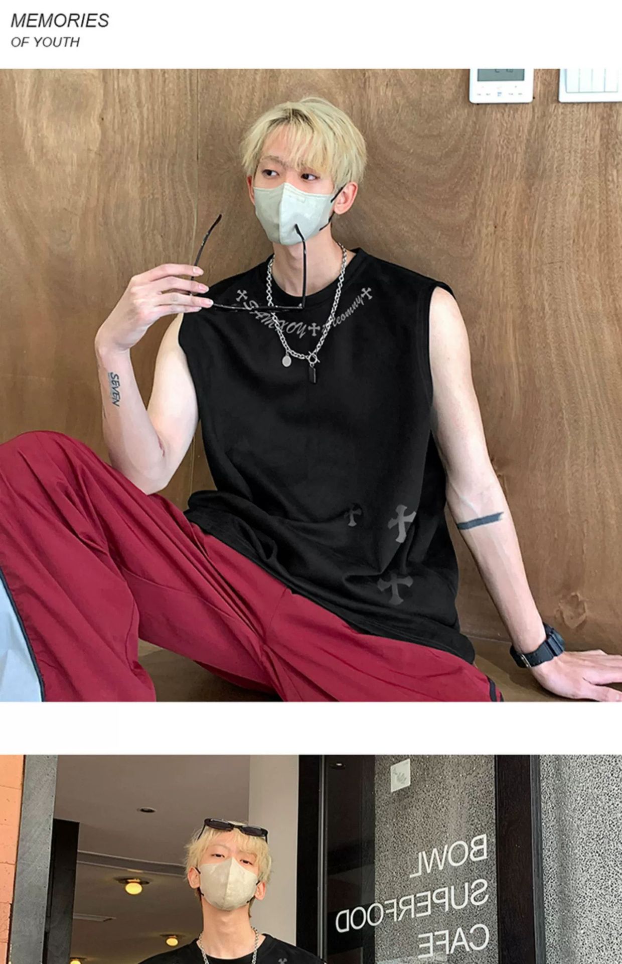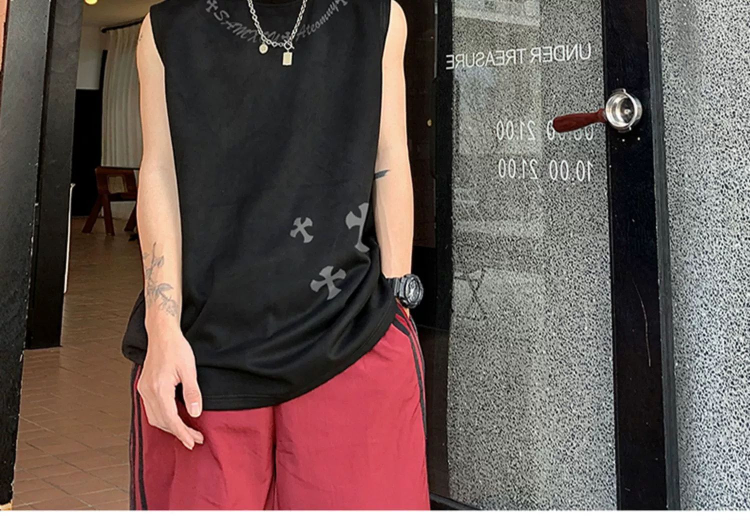 아메리칸 스타일 빈티지 크로스 프린트 스웨이드 스포츠 조끼 남자 여름 패션 브랜드 스트리트 힙합 민소매 티셔츠