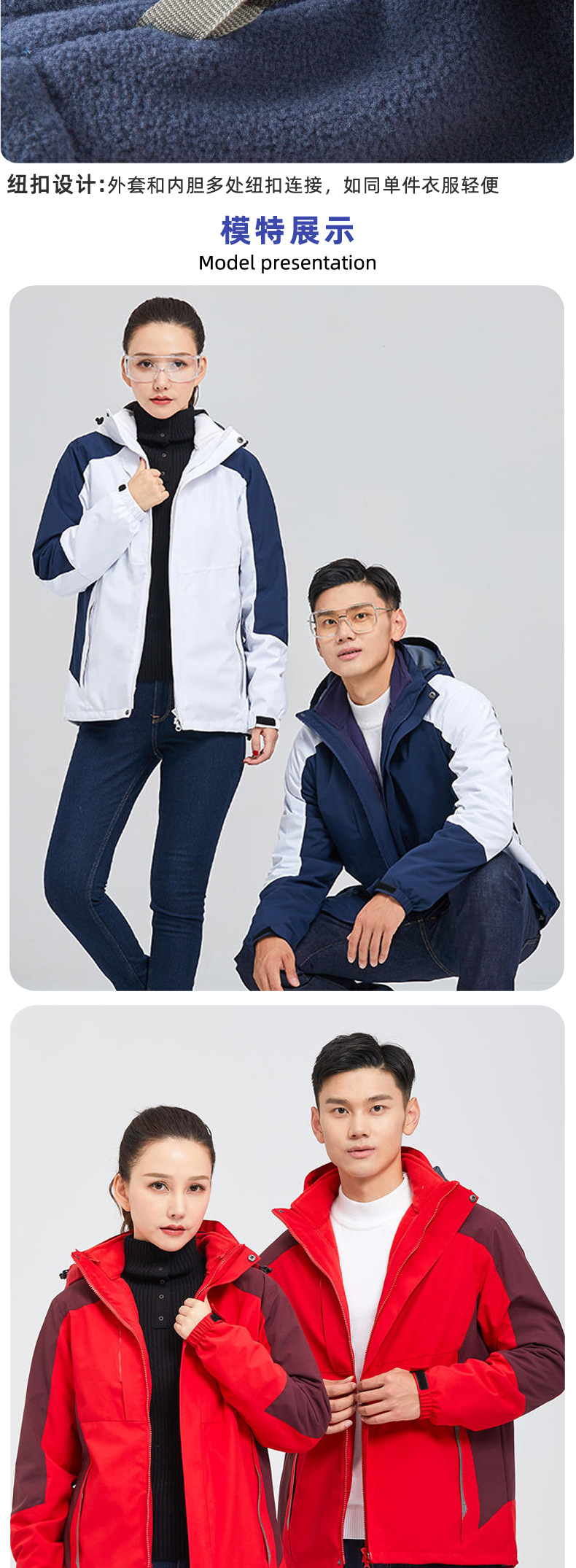 가을 겨울용 아웃도어 쓰리인원 재킷, 벨벳과 두껍게, 맞춤형 프린트와 자수, 방풍 및 방수 남녀 공용 작업복 재킷스토어 가기