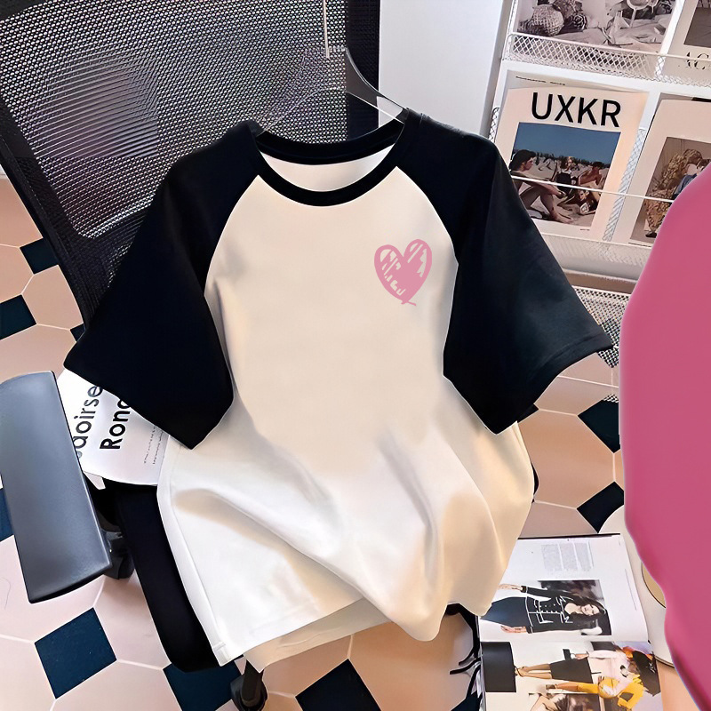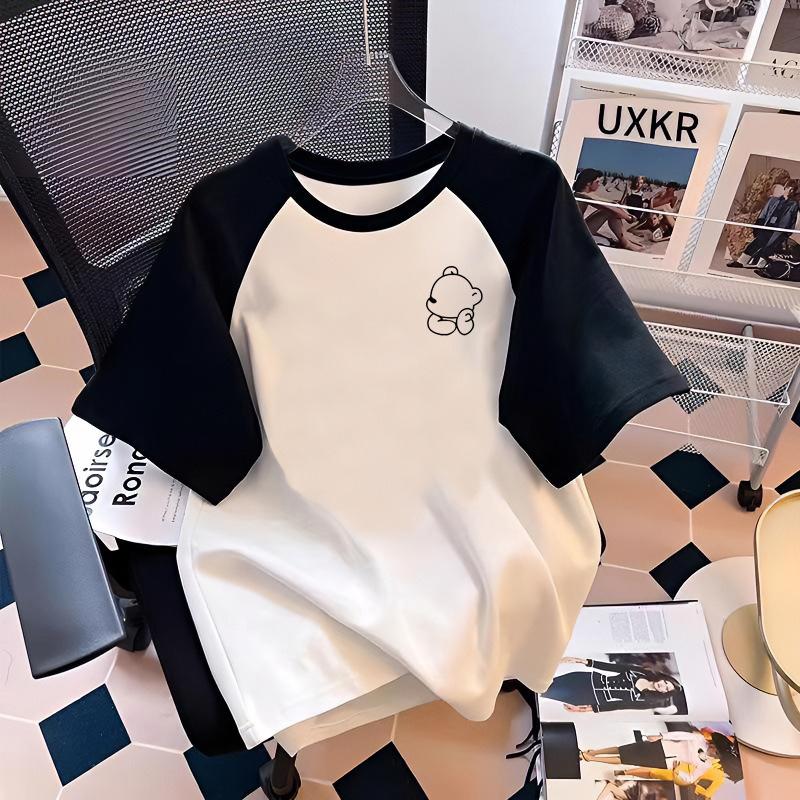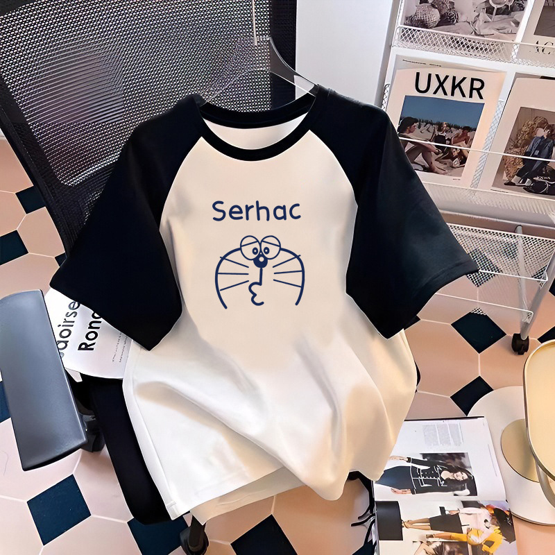 흑백 대조 컬러 퓨어 코튼 반팔 티셔츠 여름 남녀 아동복 느슨한 서양식 만화 인쇄 탑 트렌디
