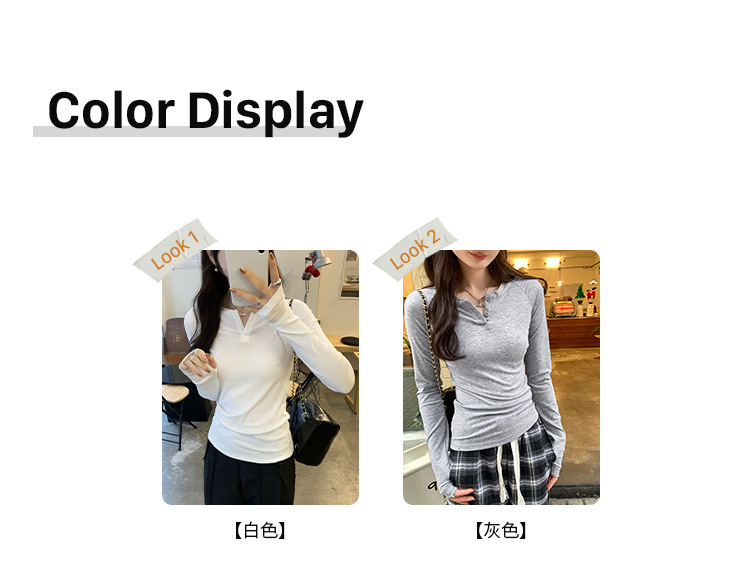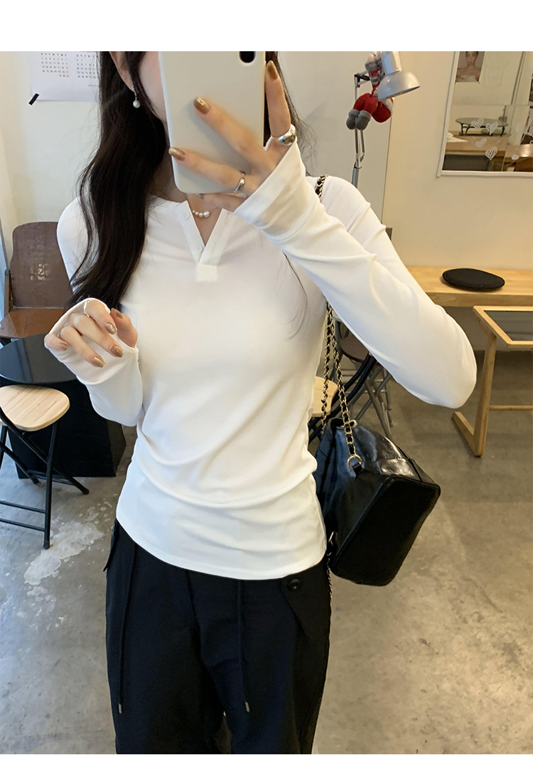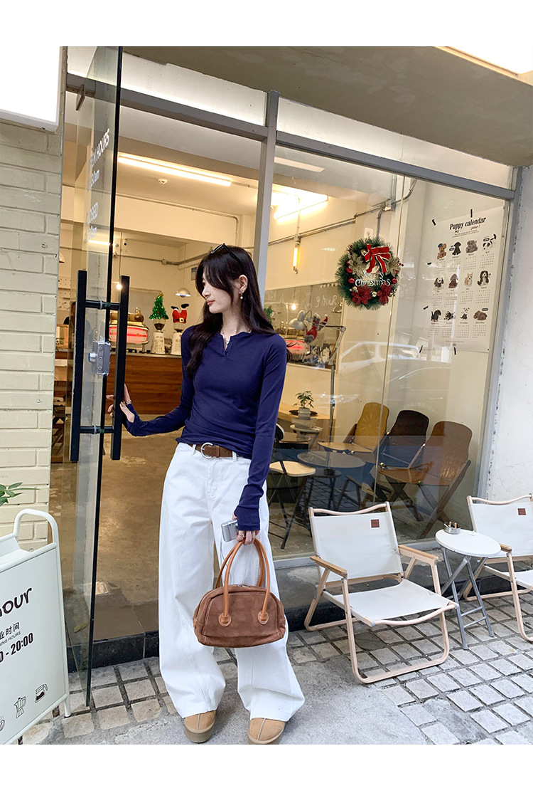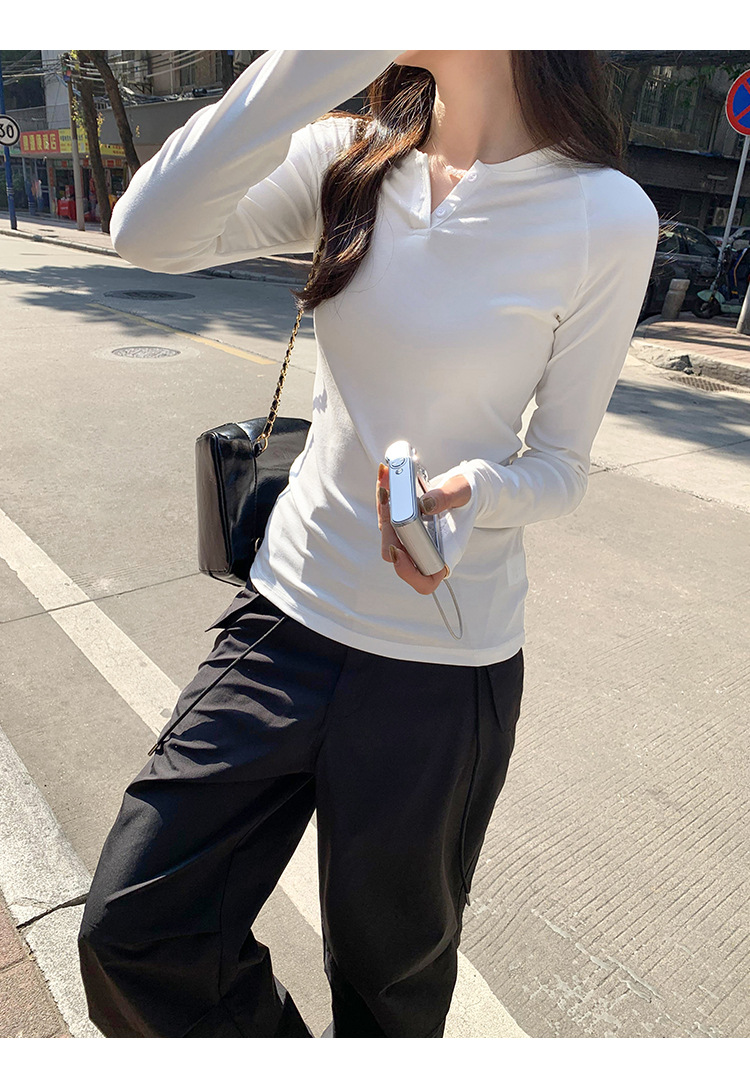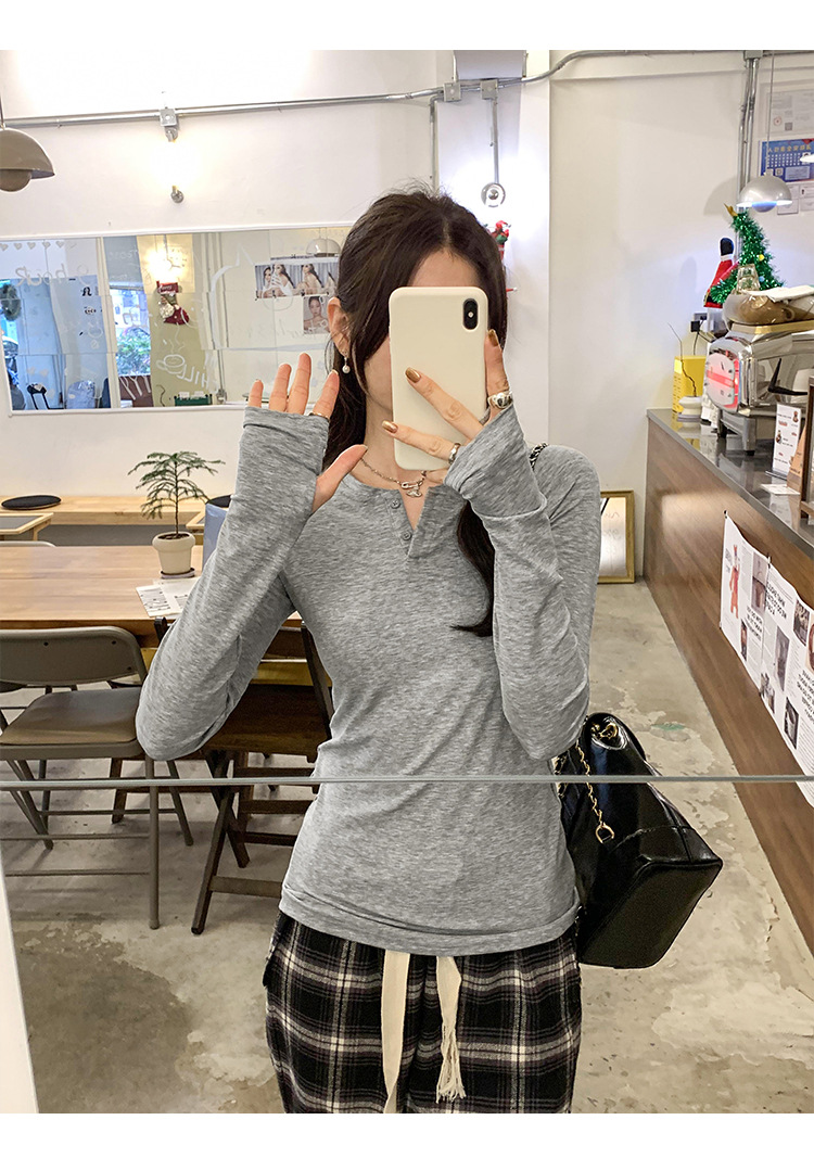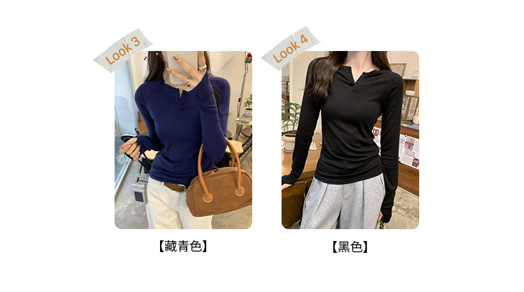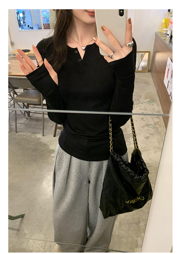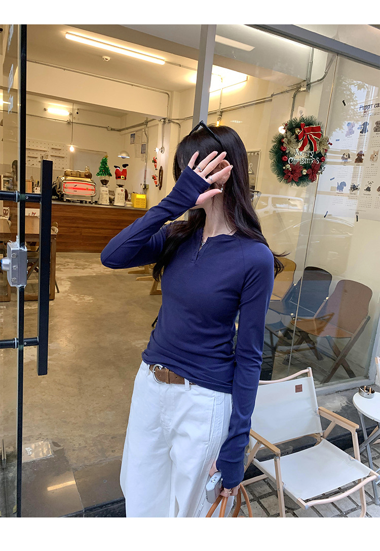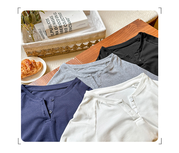 Henry Collar Raglan 긴팔 티셔츠 여성의 가을과 겨울 새로운 디자인 센스 세련된 버튼 내부 슬림베이스 셔츠 탑스토어 가기