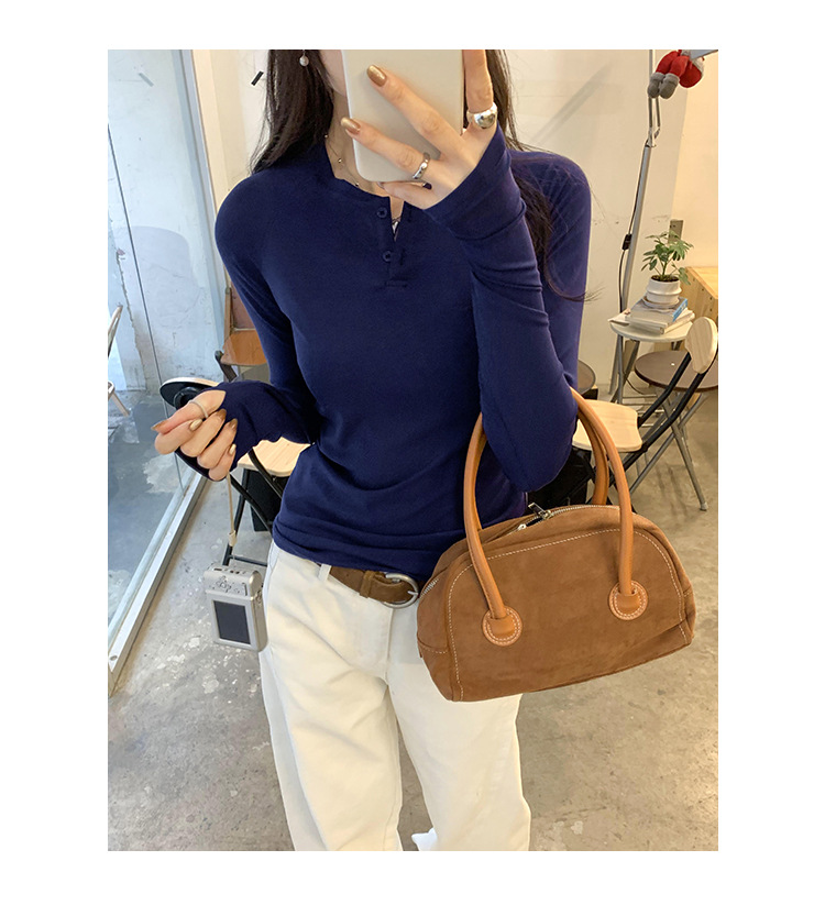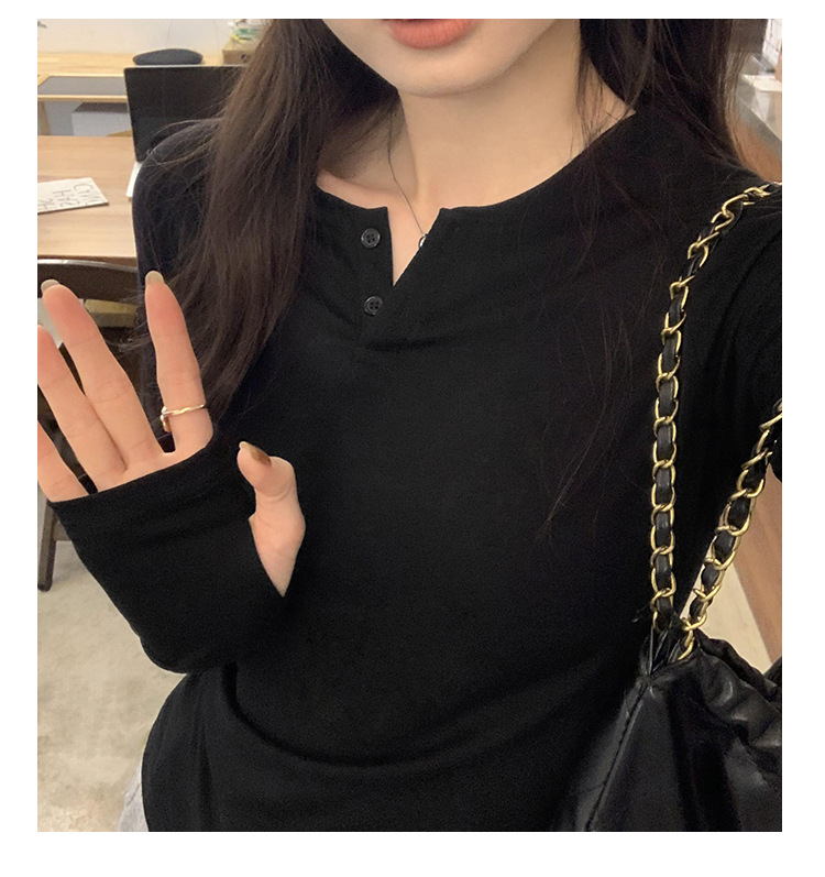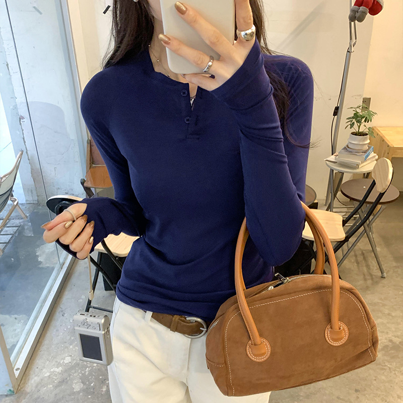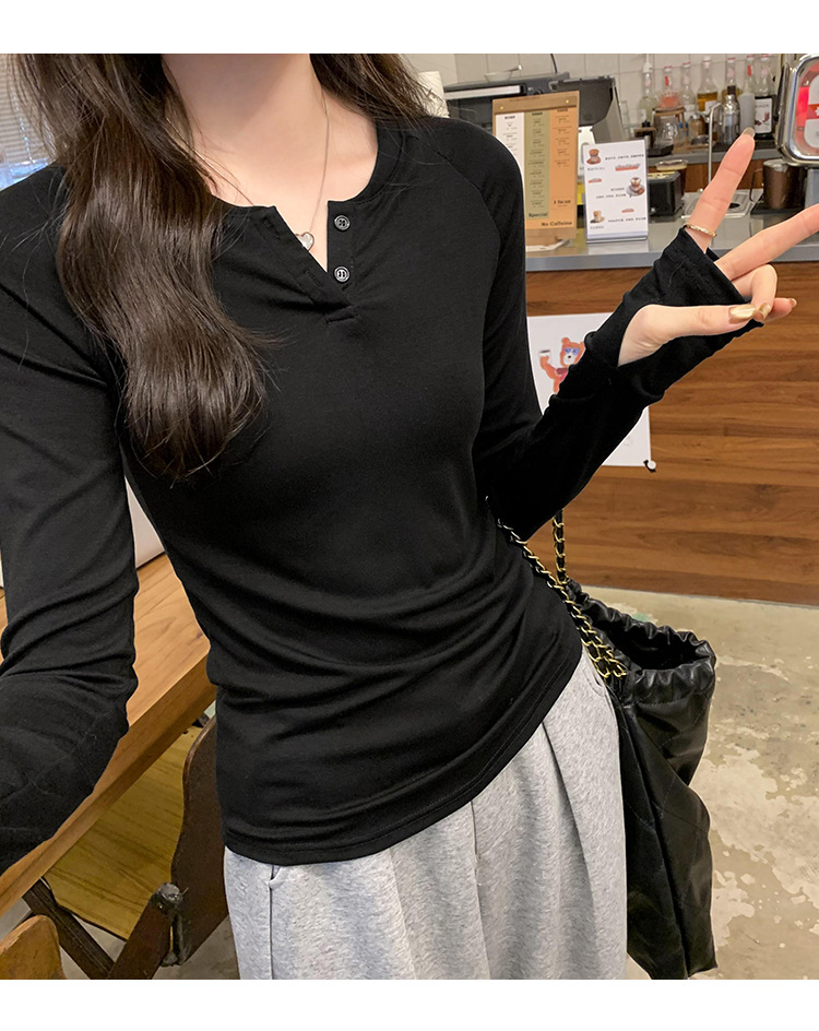 Henry Collar Raglan 긴팔 티셔츠 여성의 가을과 겨울 새로운 디자인 센스 세련된 버튼 내부 슬림베이스 셔츠 탑