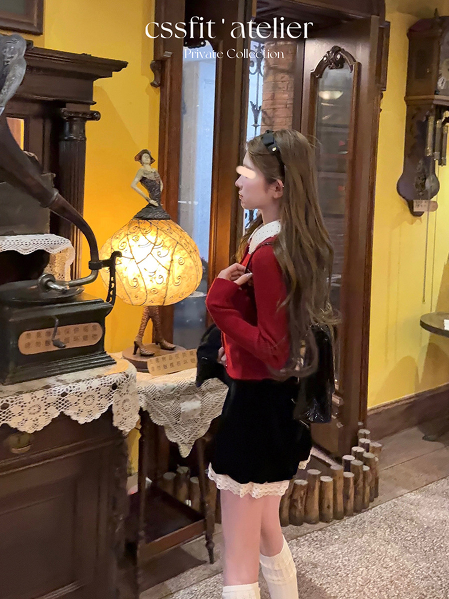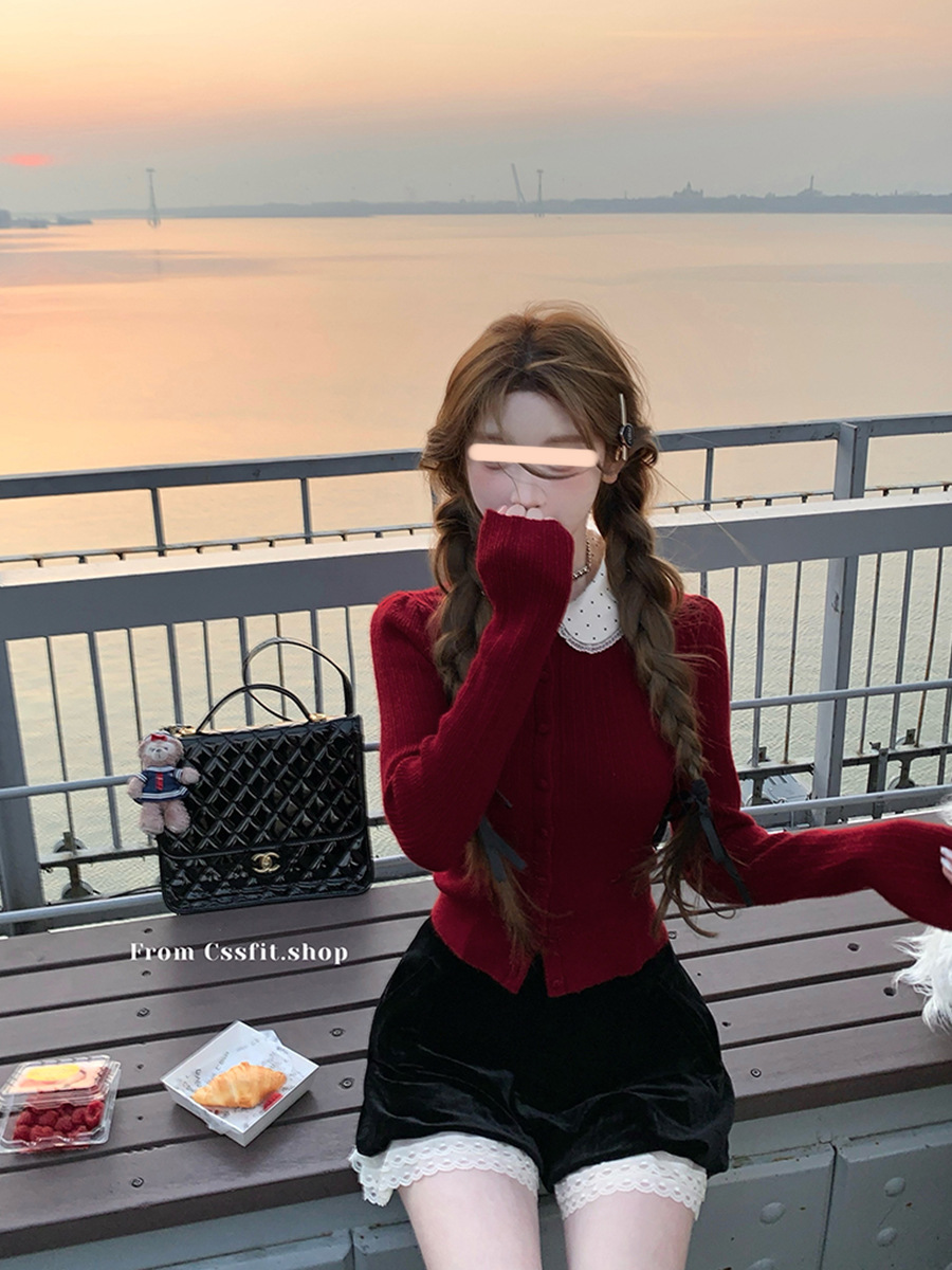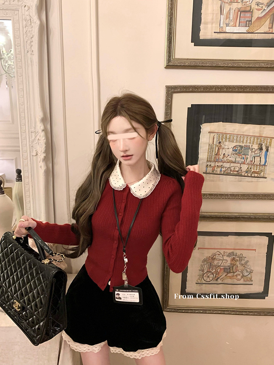 늦은 우산 우산 24/fw 크리스마스 애호가 크리스마스 레드 웨이브 레이스 옷깃 슬림 니트 카디건 탑스토어 가기