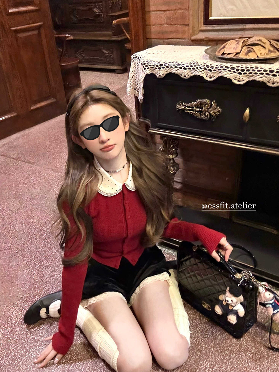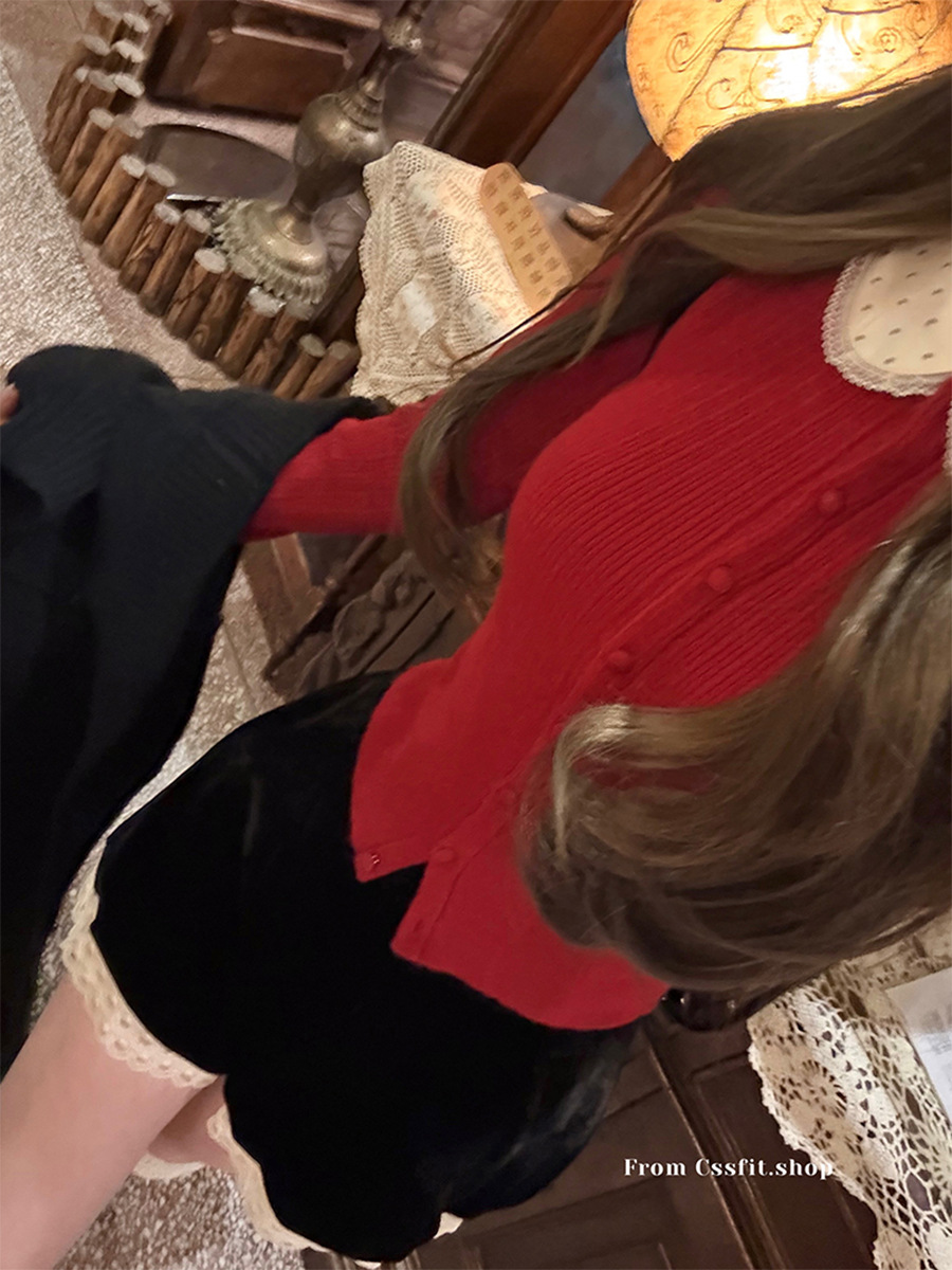 늦은 우산 우산 24/fw 크리스마스 애호가 크리스마스 레드 웨이브 레이스 옷깃 슬림 니트 카디건 탑
