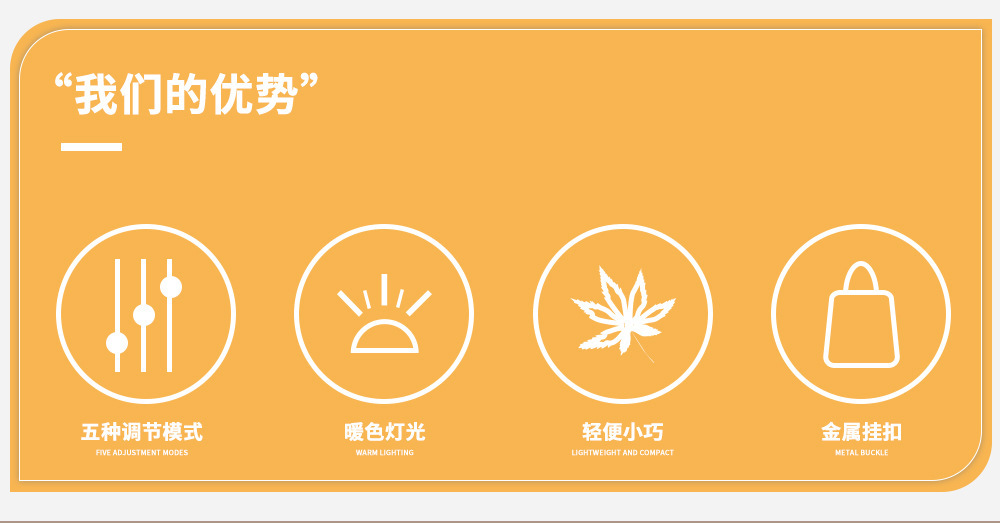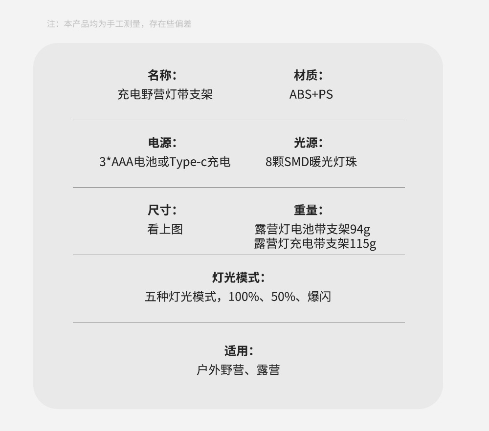 使用3*AAA电池,产品不含电池,5档开关,一档暖光全亮,二档暖光半亮,三档远光全亮,四档远光半亮,5档远光闪烁,8颗SMD暖光灯珠功率4W流明90,1W远光灯65流明,材质ABS+PS