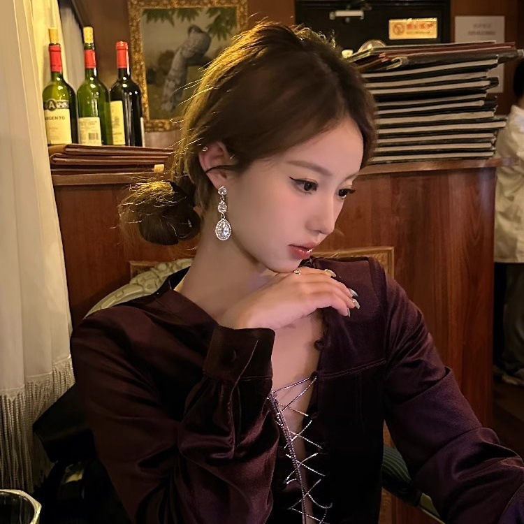 유럽과 미국의 국경 슈퍼 플래시 풀 다이아몬드 롱 워터 드롭 지르콘 귀걸이 여성 라이트 럭셔리 우아한 우아한 우아한 귀걸이 디자인 센스 귀걸이스토어 가기