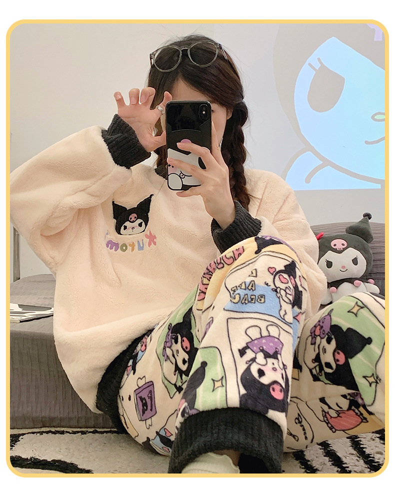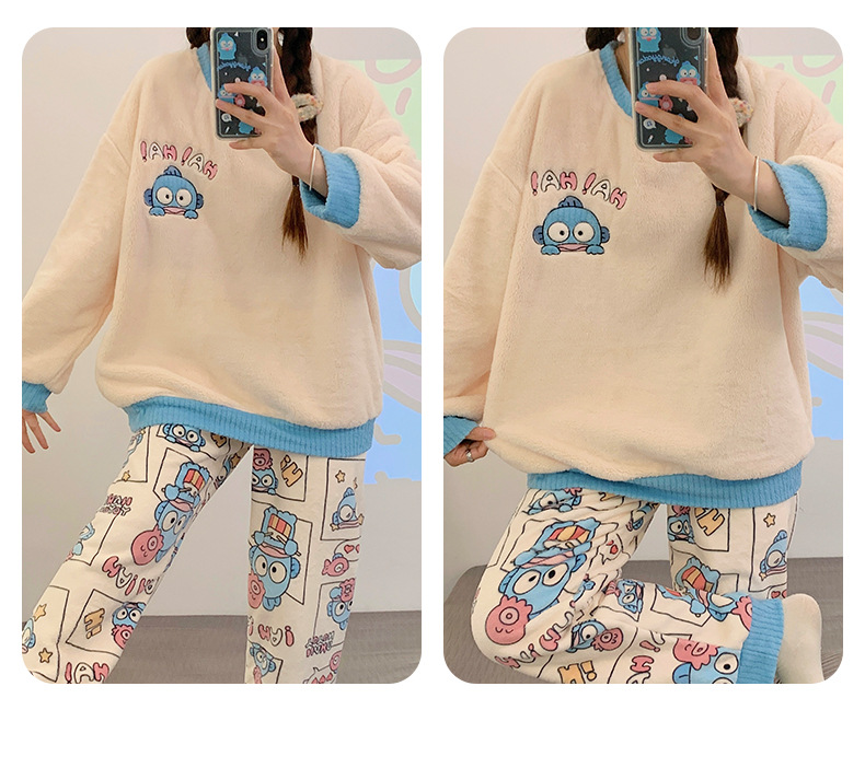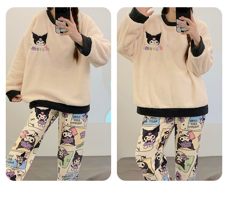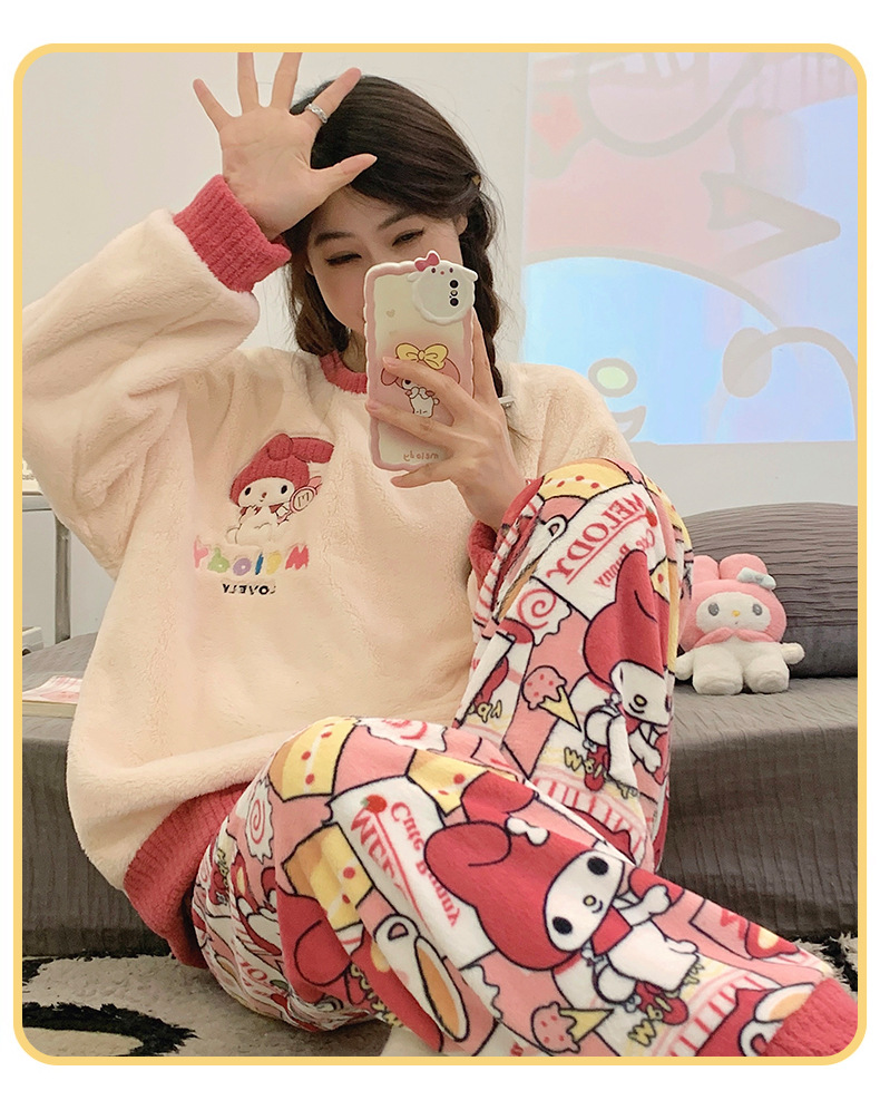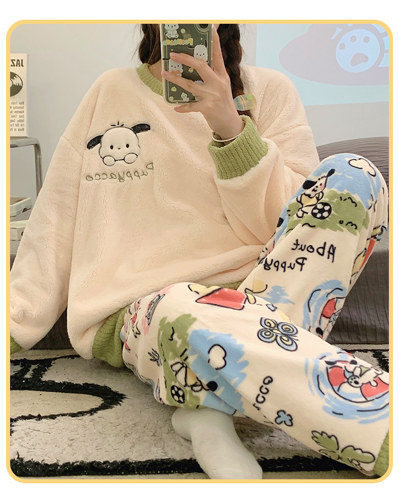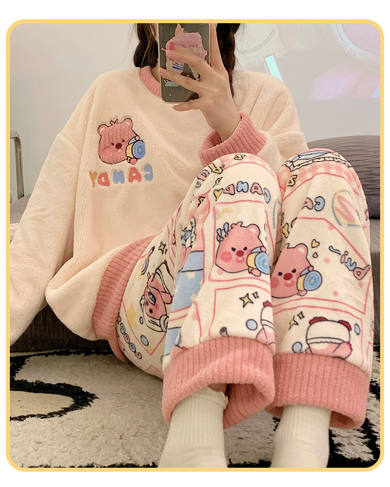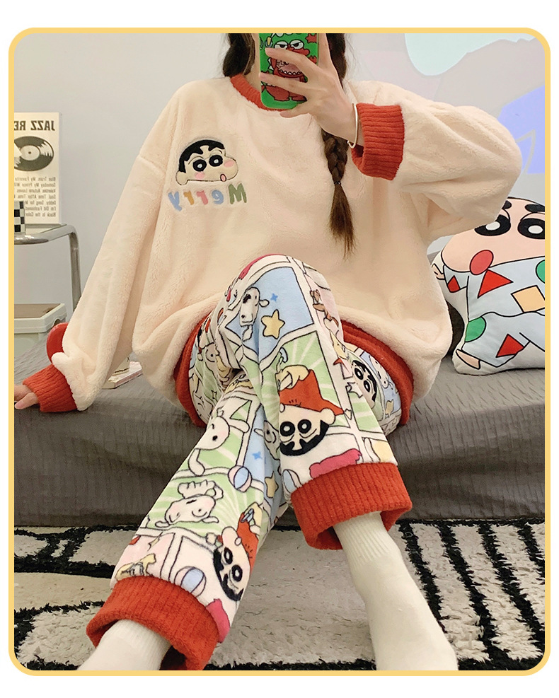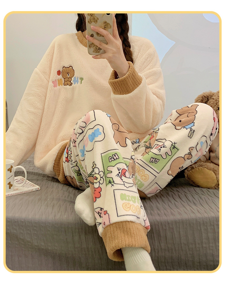 2024 새로운 잠옷 여성 겨울 한국어 버전 만화 만화 스타일 인터넷 연예인 스타일 플란넬 산호 벨벳 슈트