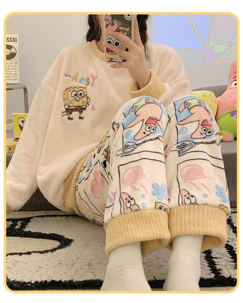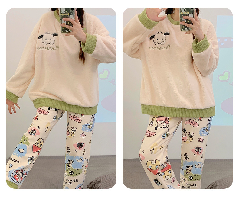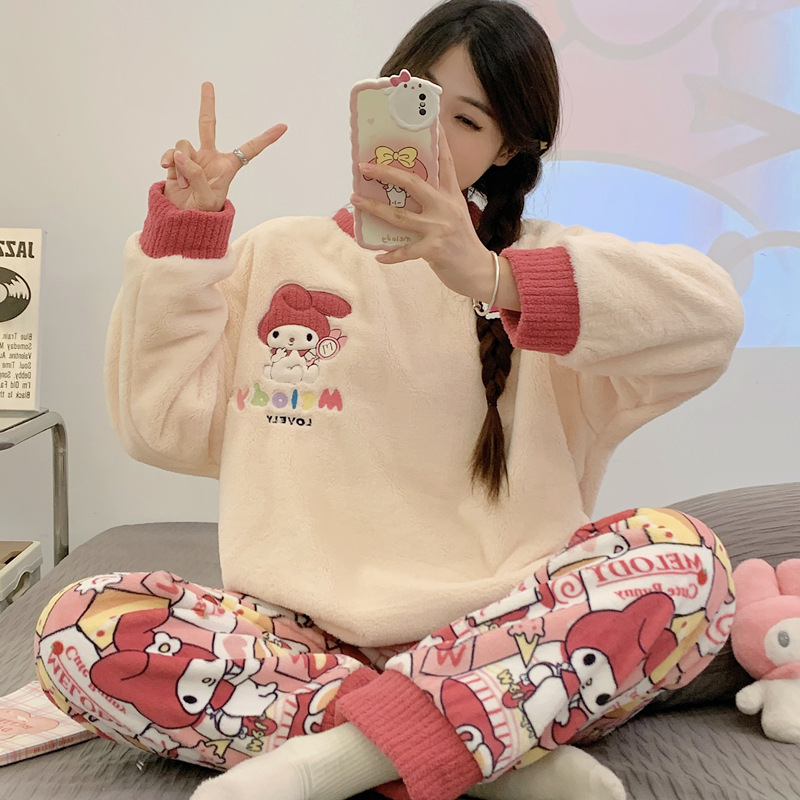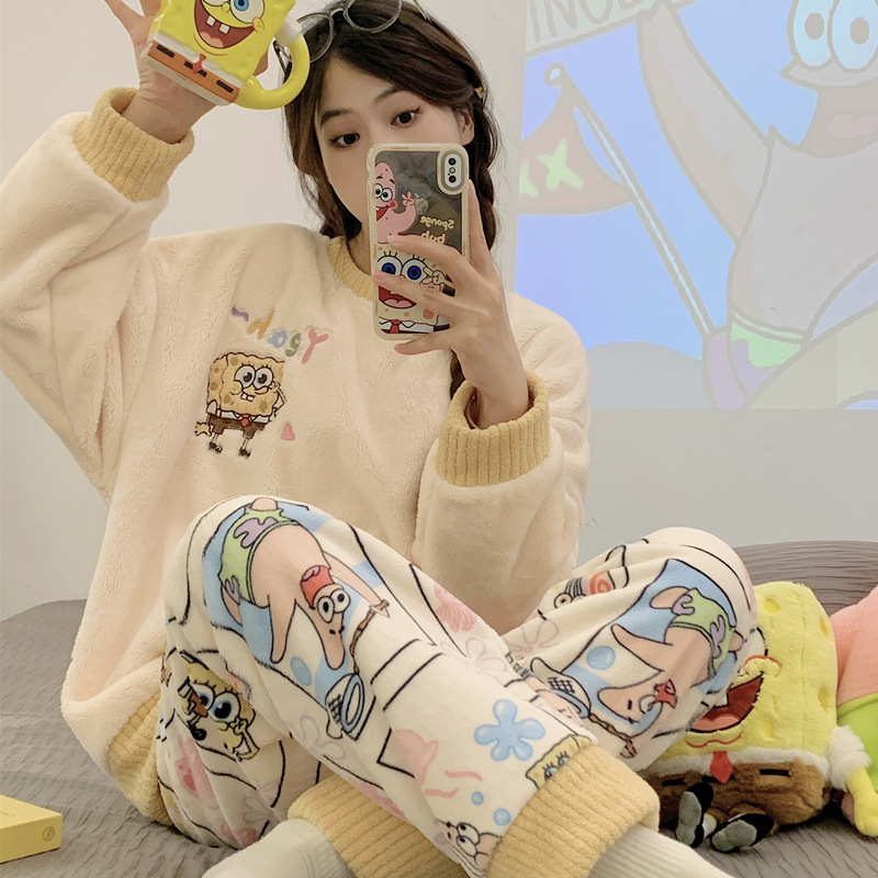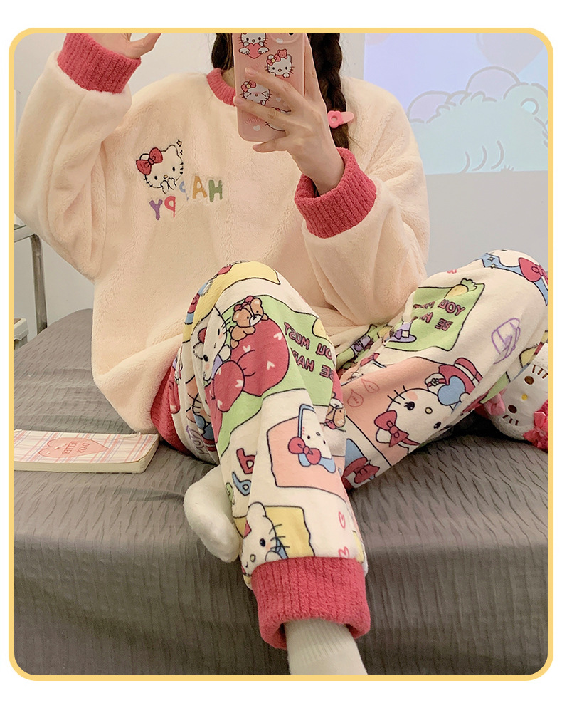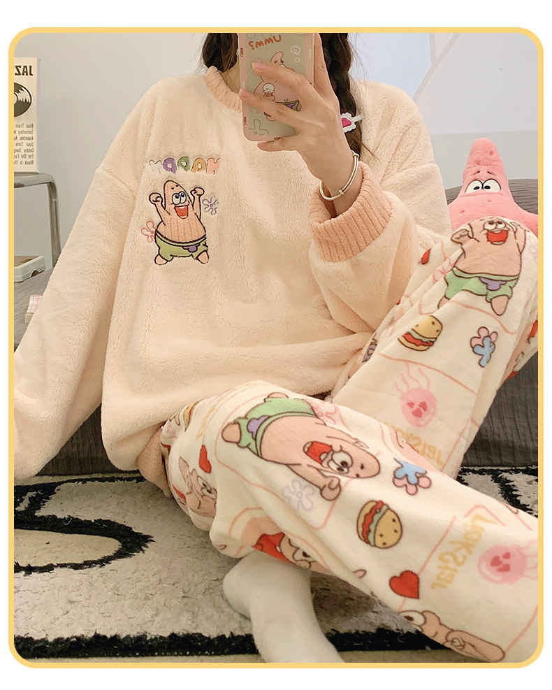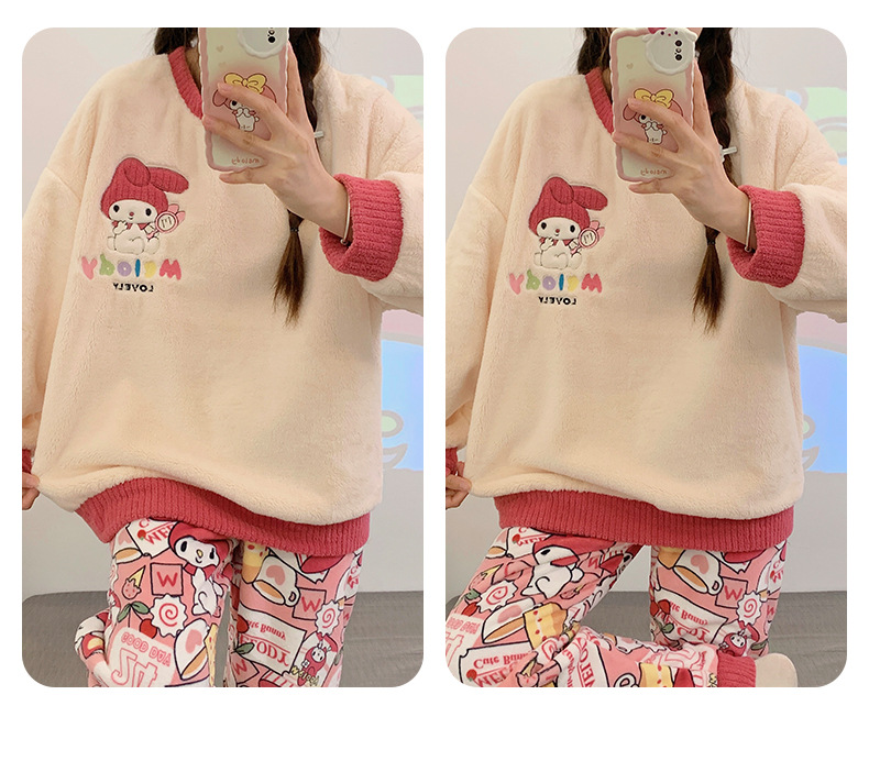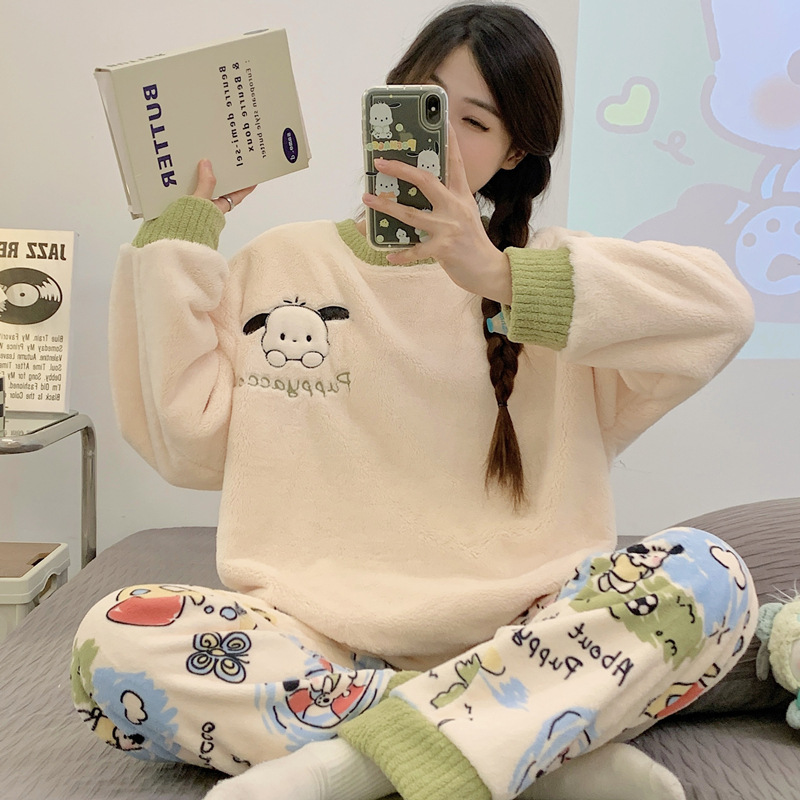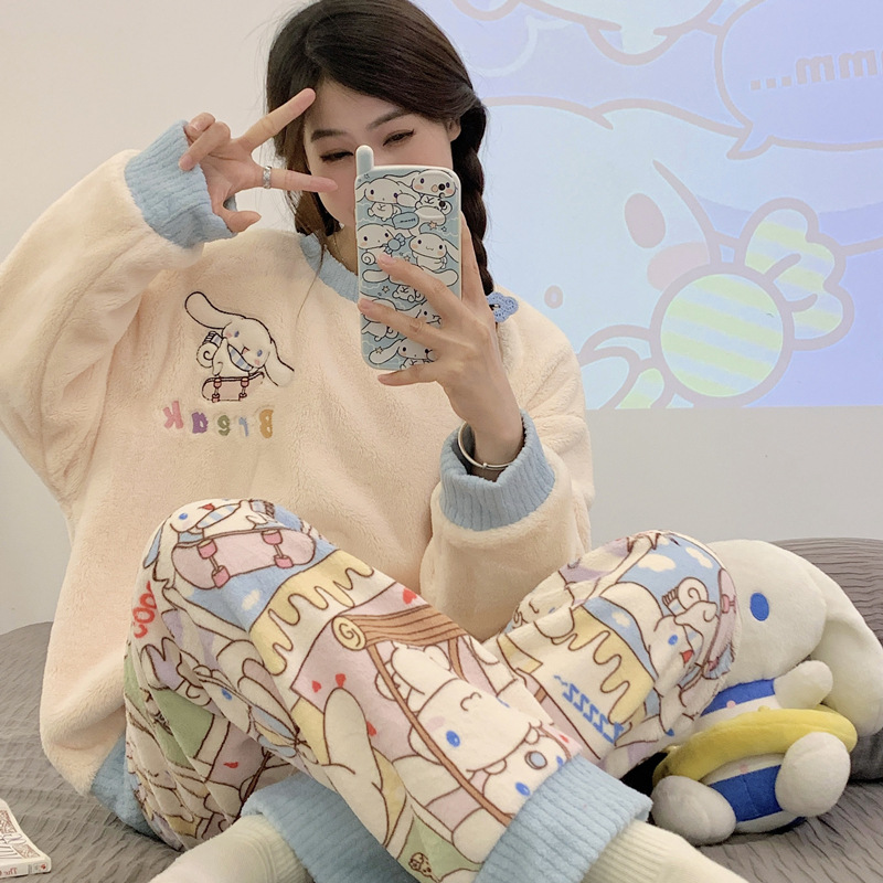 2024 새로운 잠옷 여성 겨울 한국어 버전 만화 만화 스타일 인터넷 연예인 스타일 플란넬 산호 벨벳 슈트