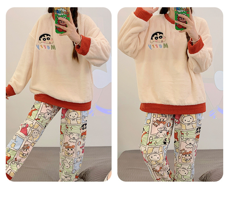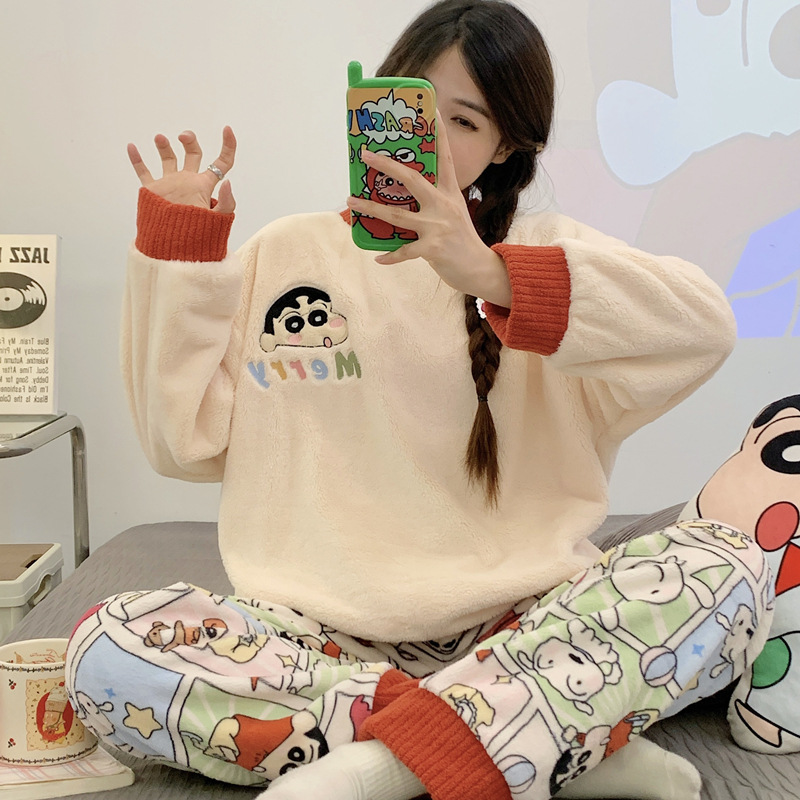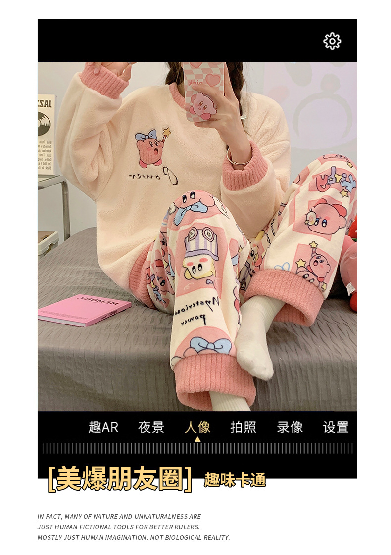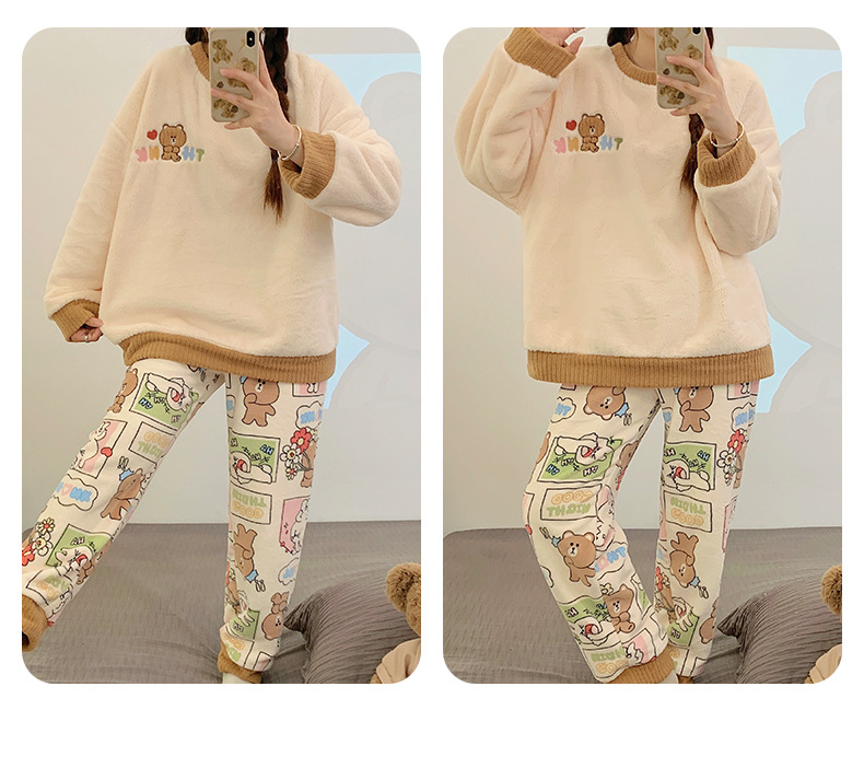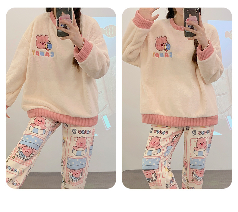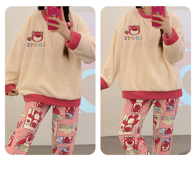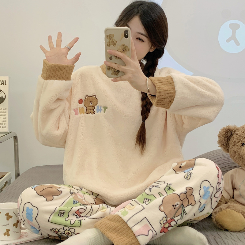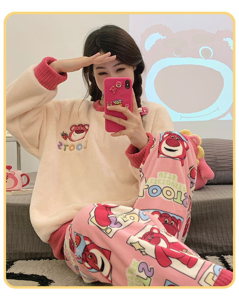 2024 새로운 잠옷 여성 겨울 한국어 버전 만화 만화 스타일 인터넷 연예인 스타일 플란넬 산호 벨벳 슈트스토어 가기