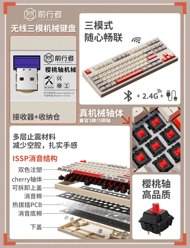 프리런더 CR108 체리 스위치 기계식 키보드 마우스 세트 무선 3모드 키보드 게임용 사무용 키보드