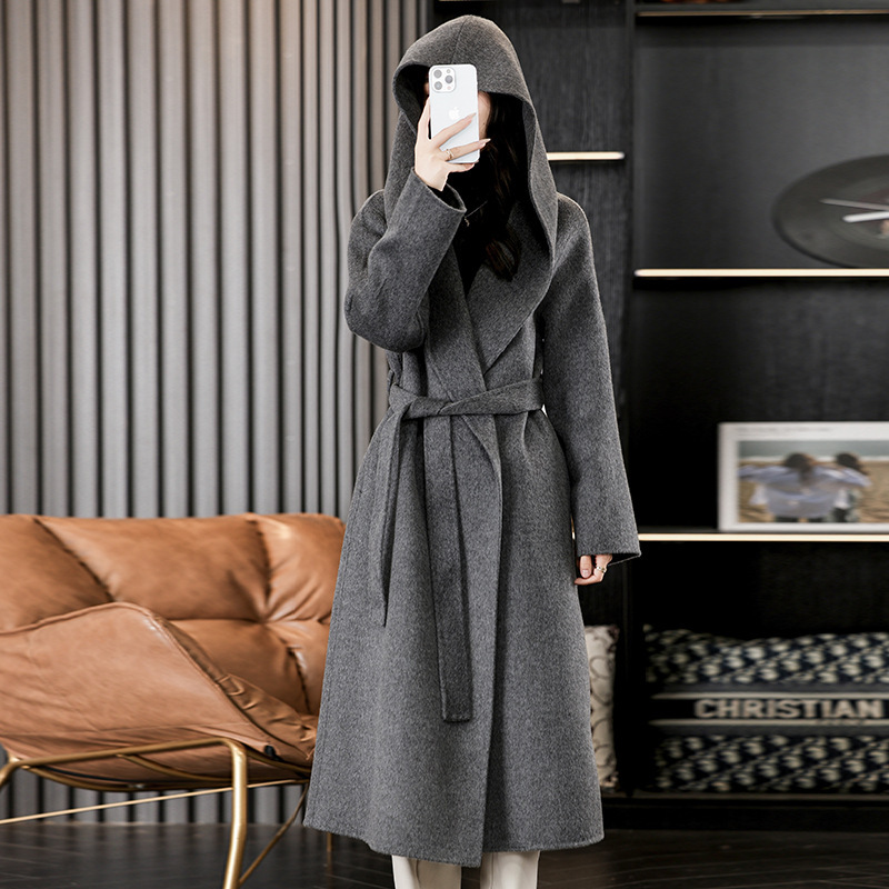 가을과 겨울 후드 코트 여성의 새로운 양면 캐시미어 하이 엔드 루즈 플러스 사이즈 롱 모직 세트 재킷
