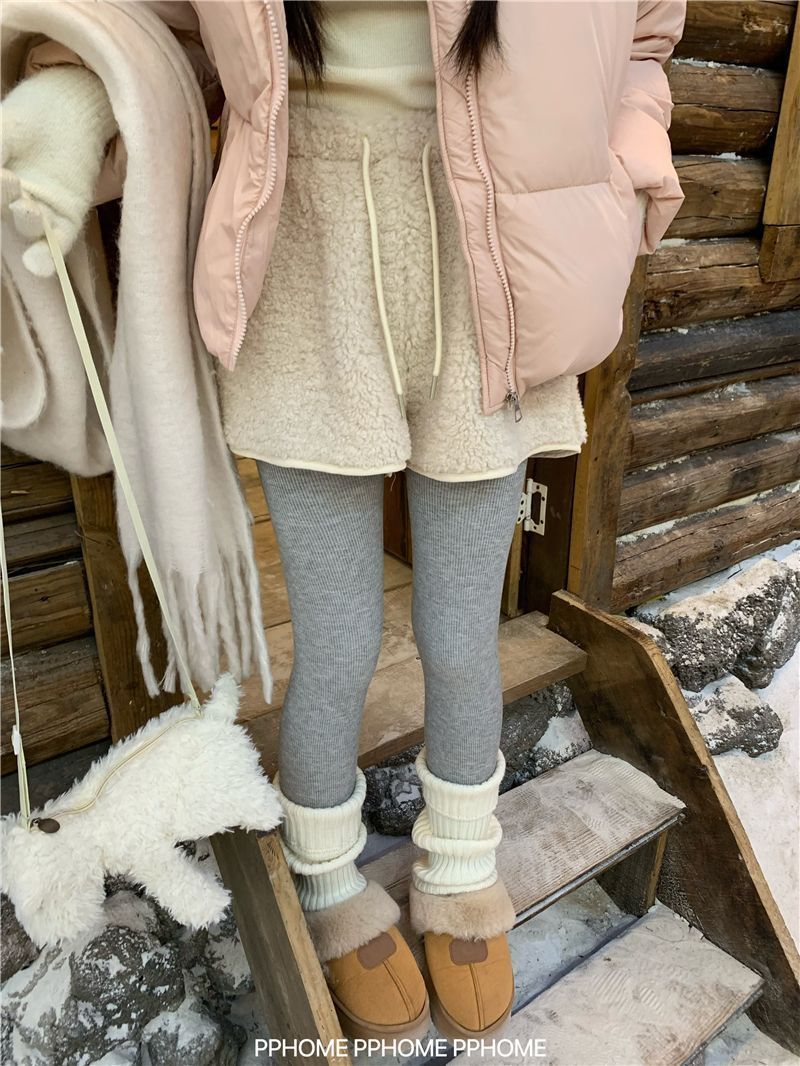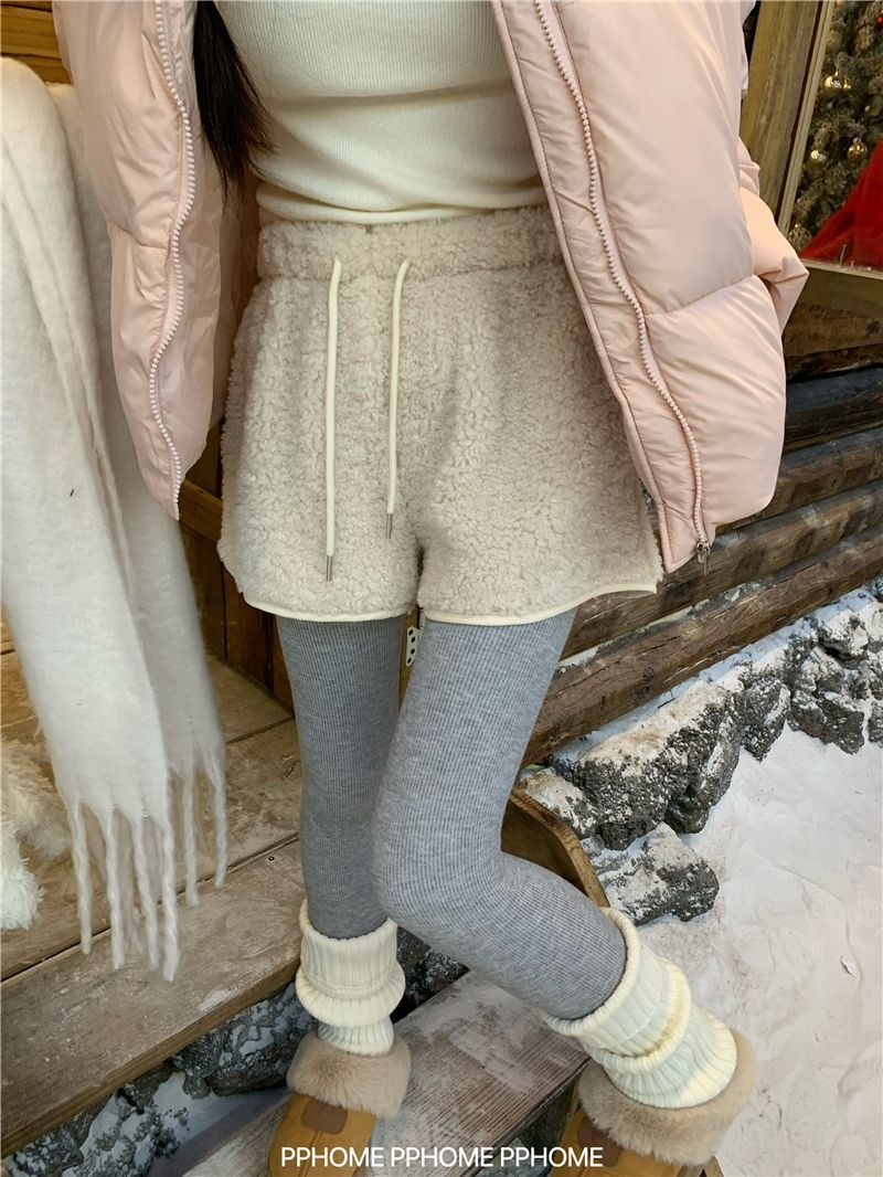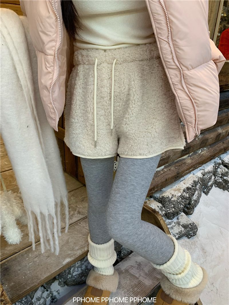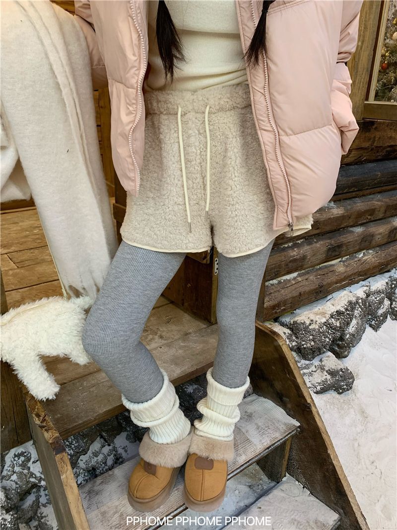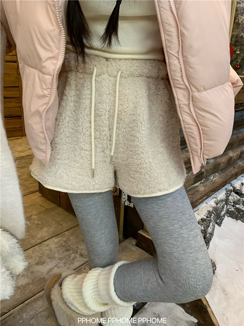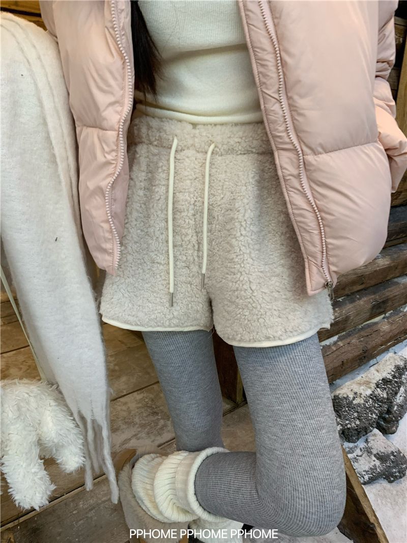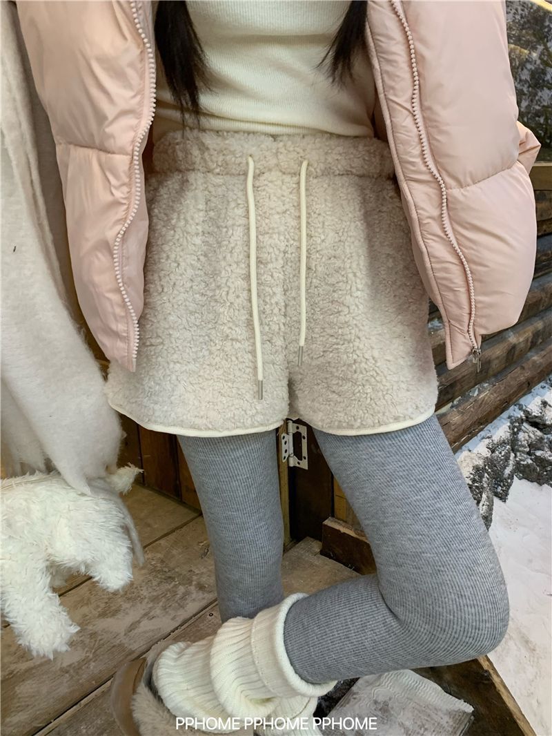 탄성 허리 양모 캐주얼 바지 여성의 겨울 작은 패딩 플러시 넓은 다리 반바지 회색 핫 팬츠