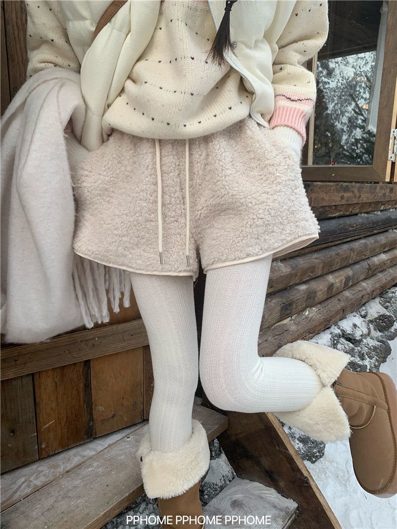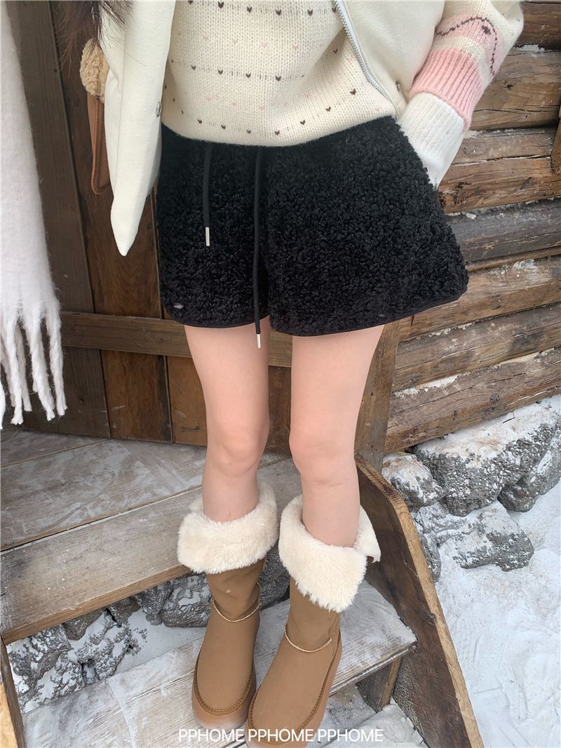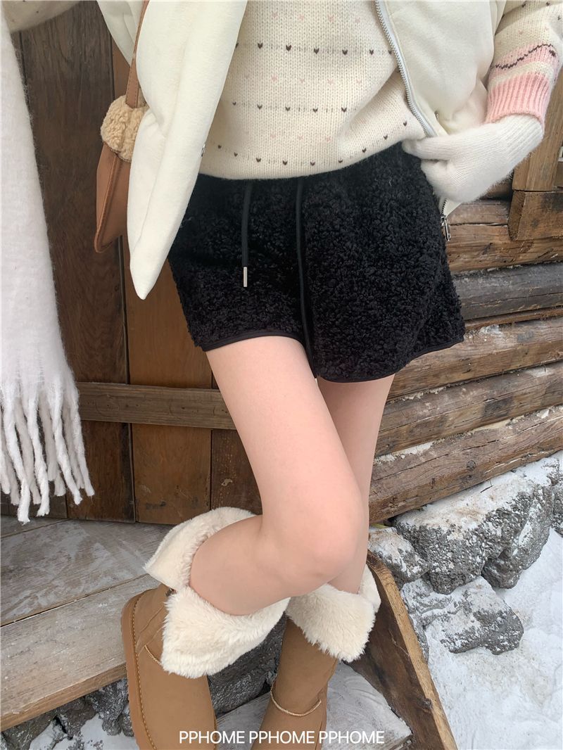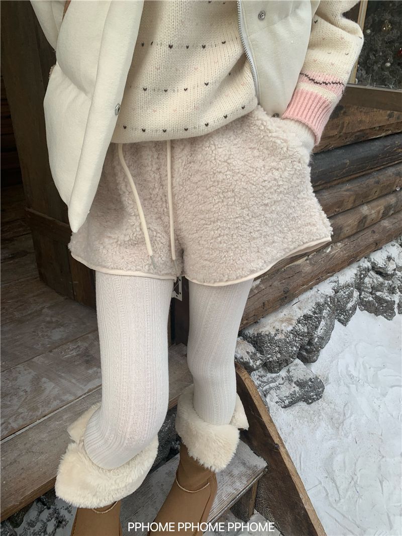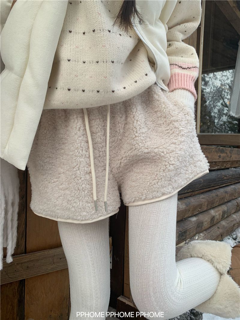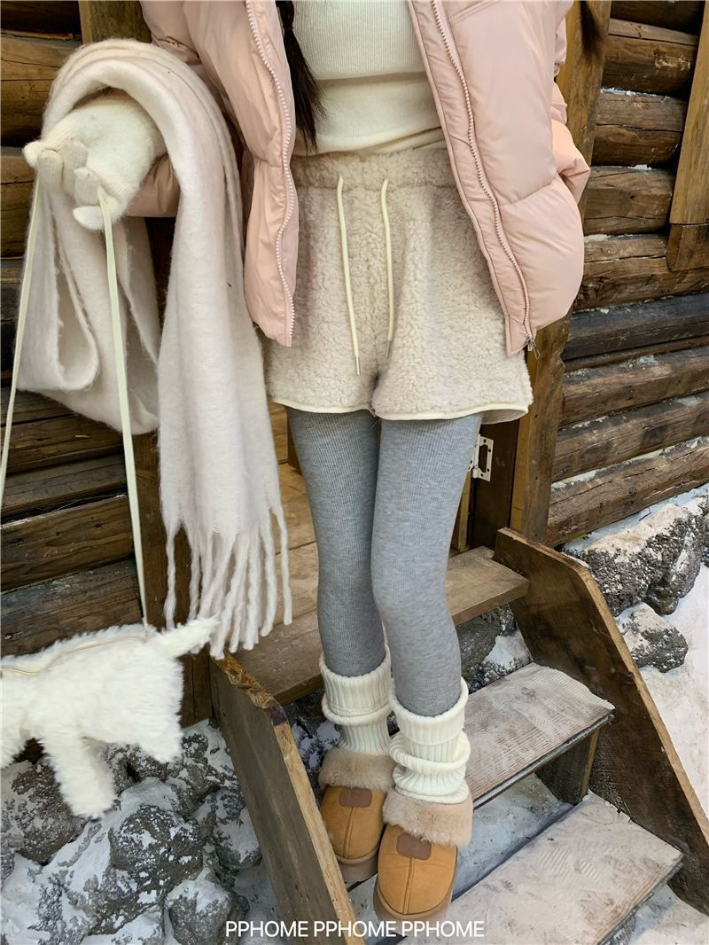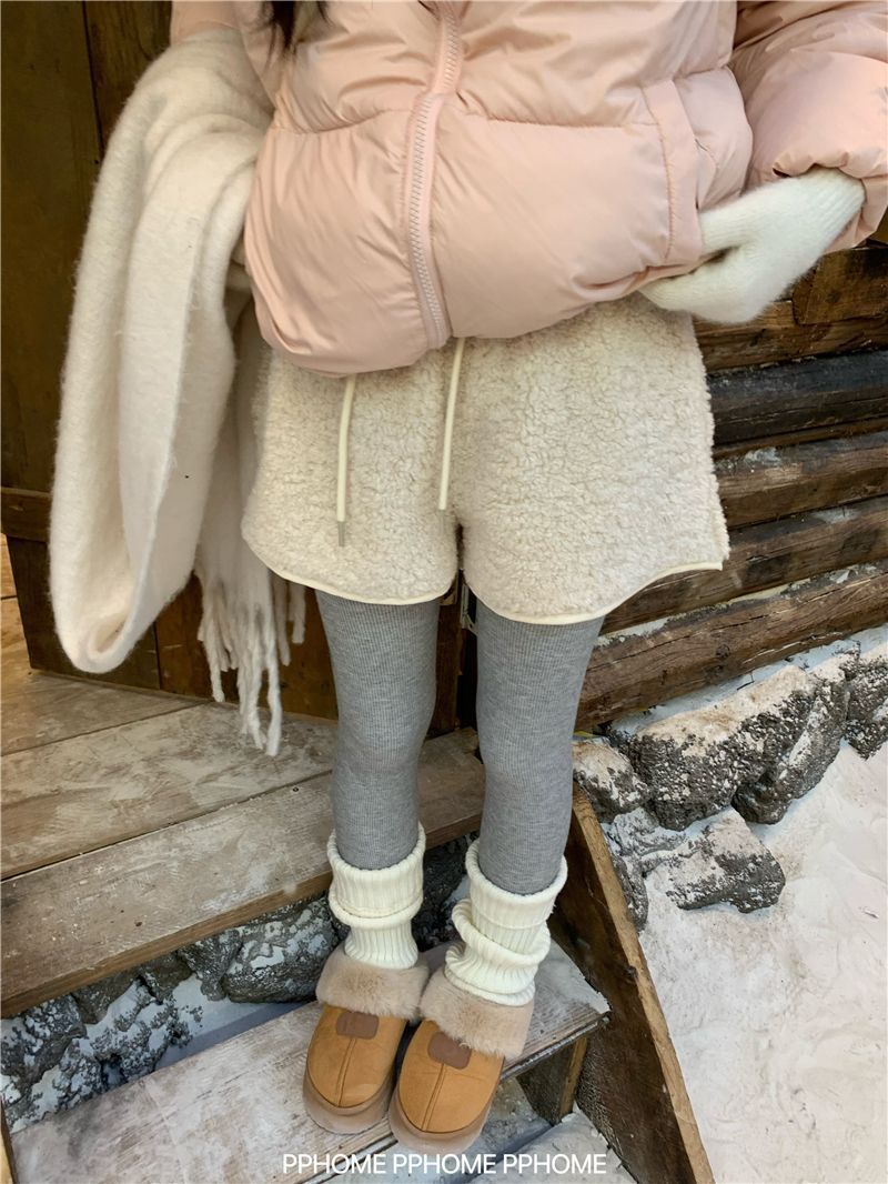 탄성 허리 양모 캐주얼 바지 여성의 겨울 작은 패딩 플러시 넓은 다리 반바지 회색 핫 팬츠