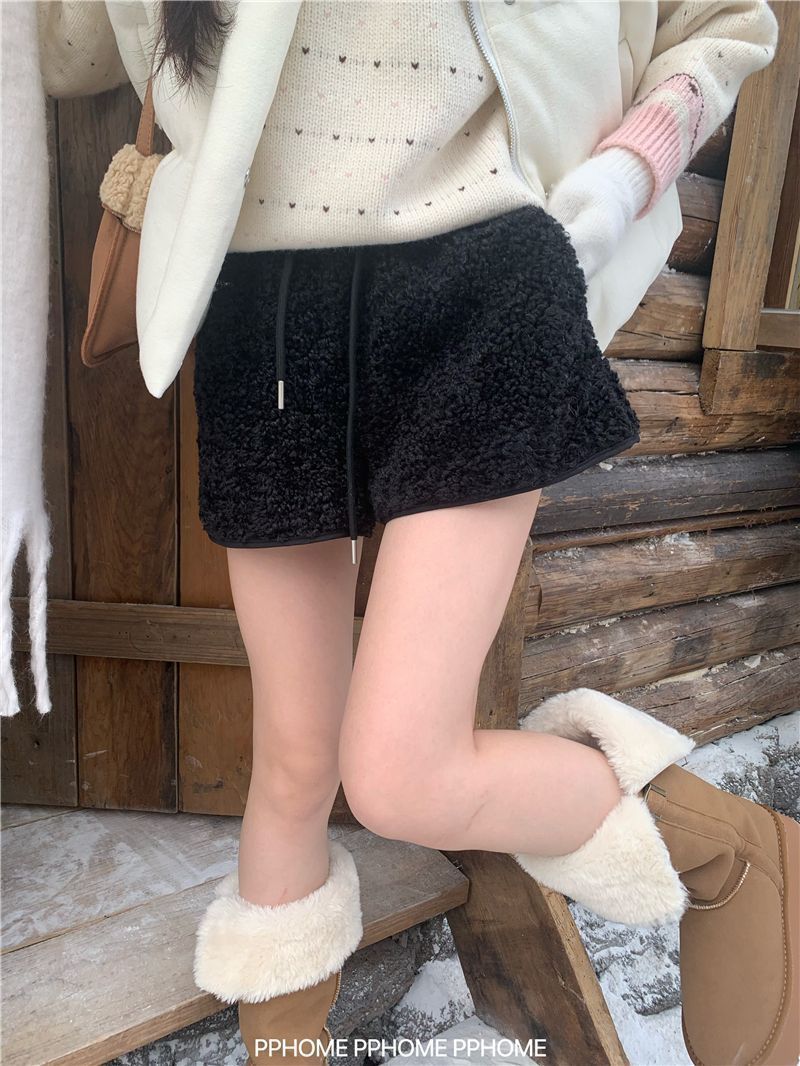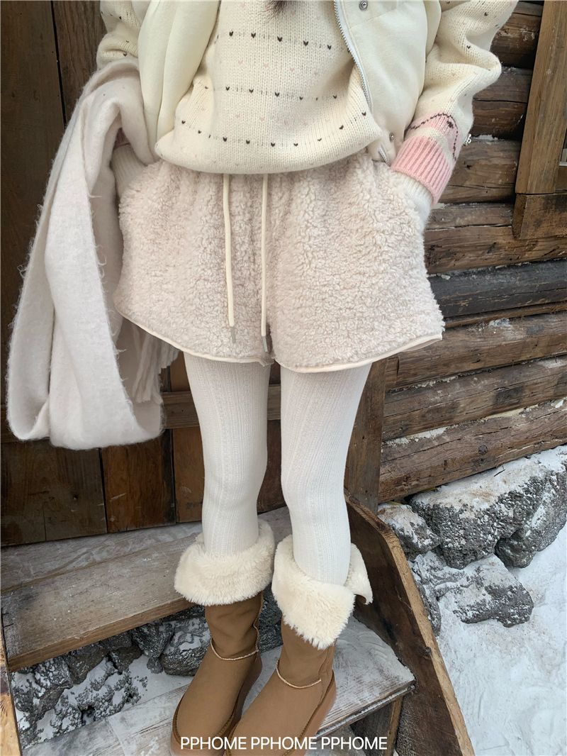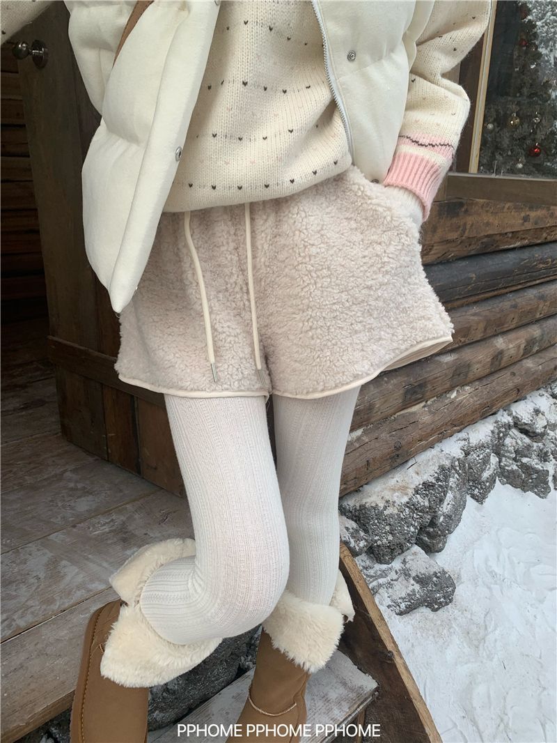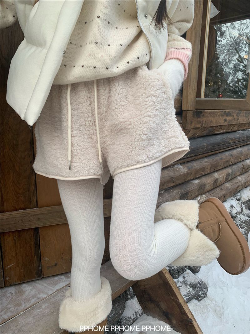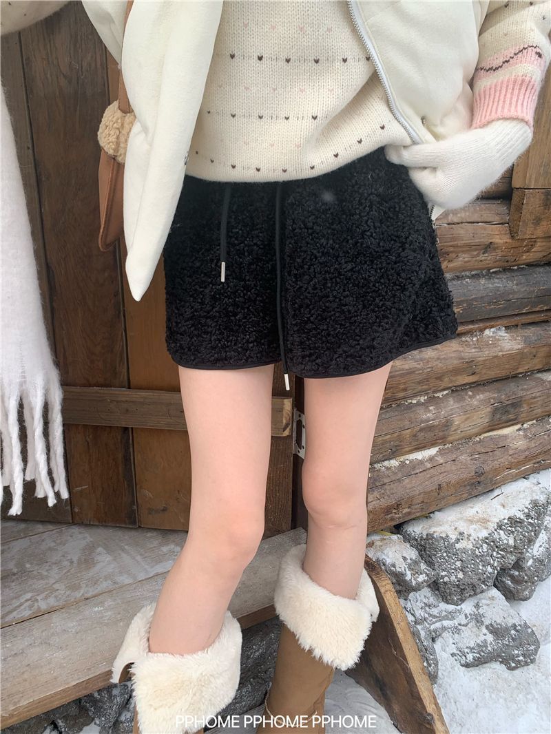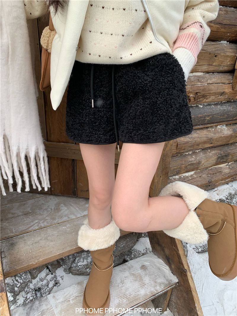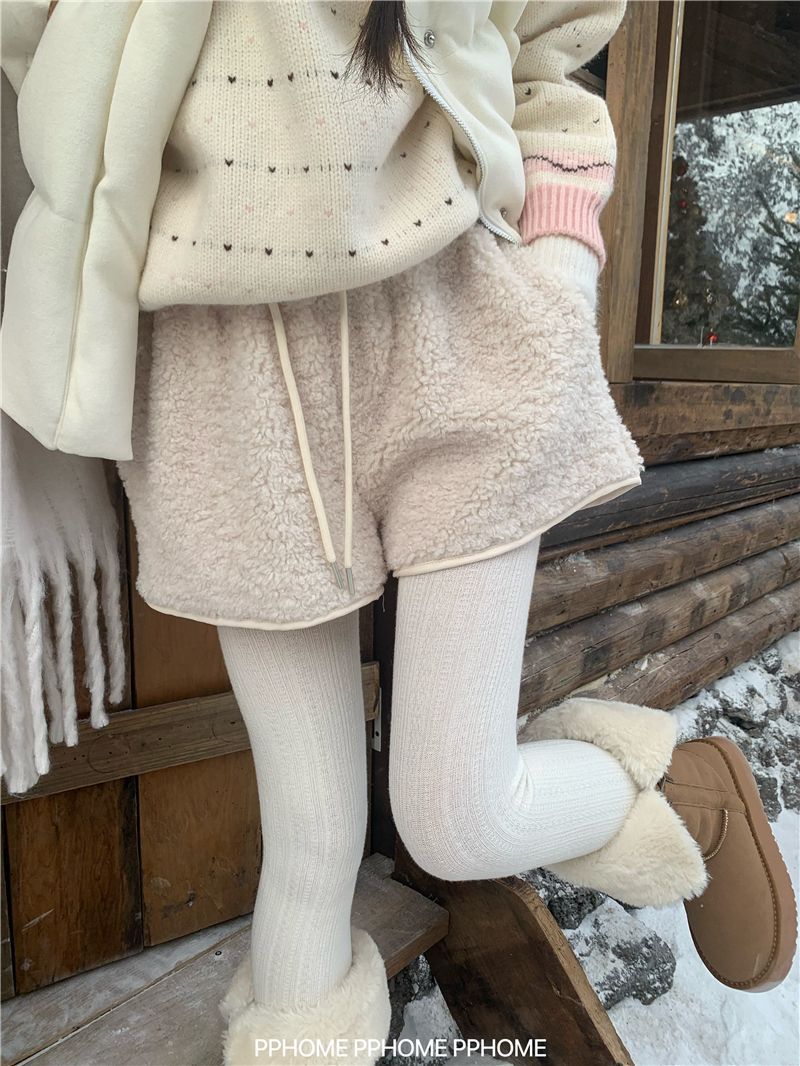 탄성 허리 양모 캐주얼 바지 여성의 겨울 작은 패딩 플러시 넓은 다리 반바지 회색 핫 팬츠