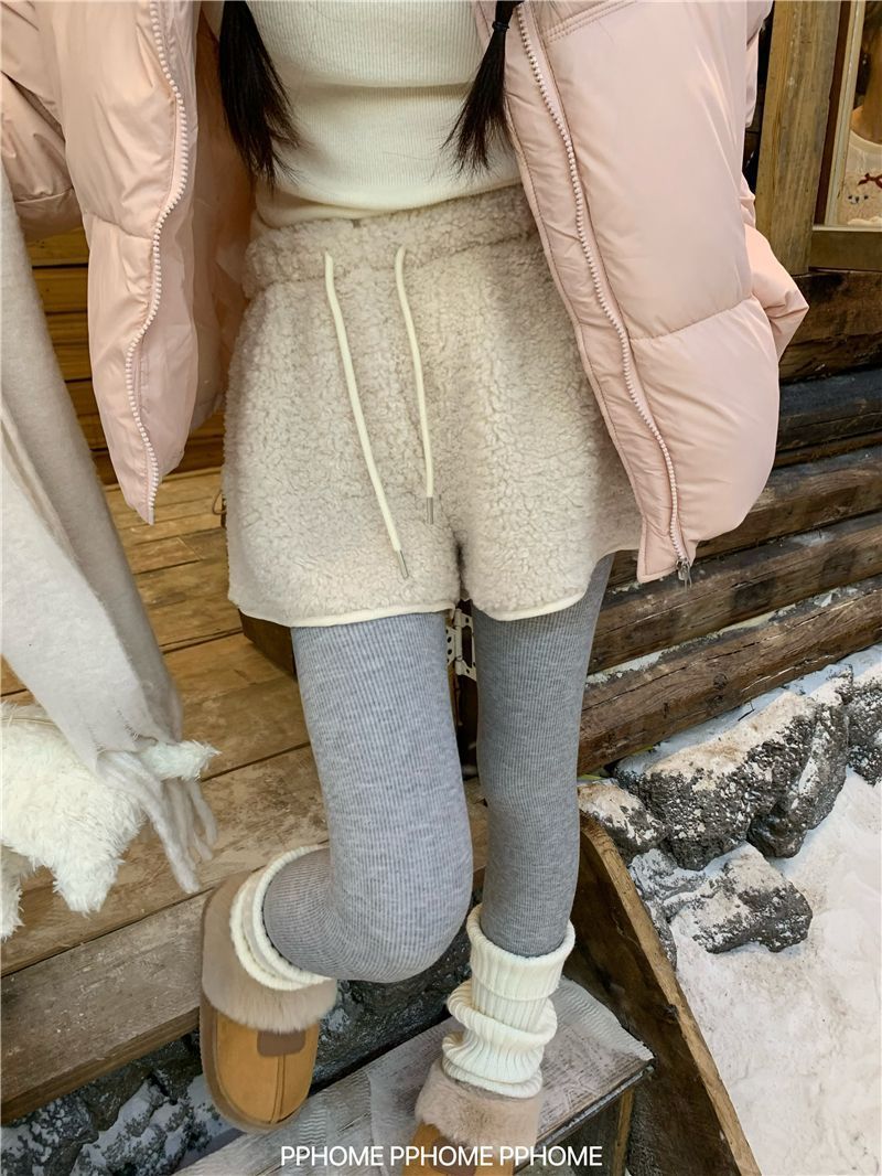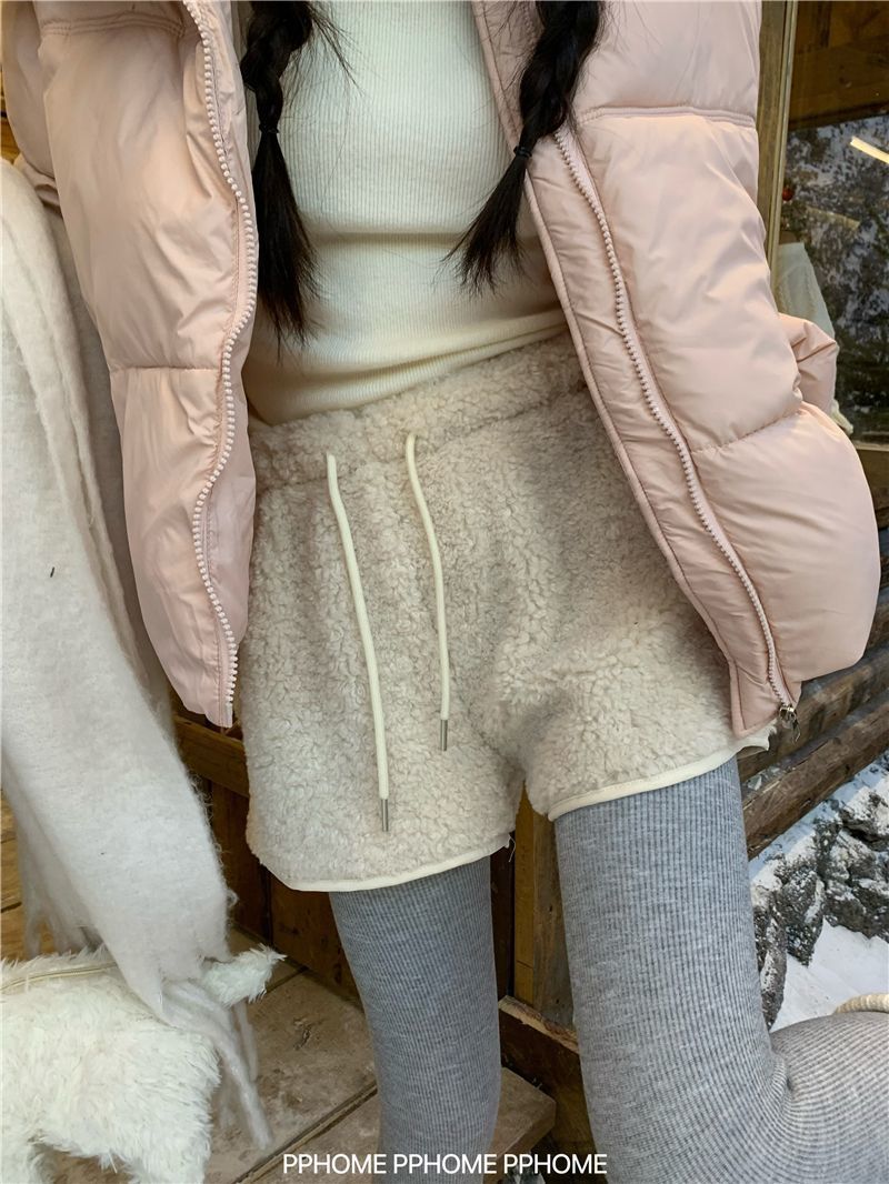 탄성 허리 양모 캐주얼 바지 여성의 겨울 작은 패딩 플러시 넓은 다리 반바지 회색 핫 팬츠스토어 가기