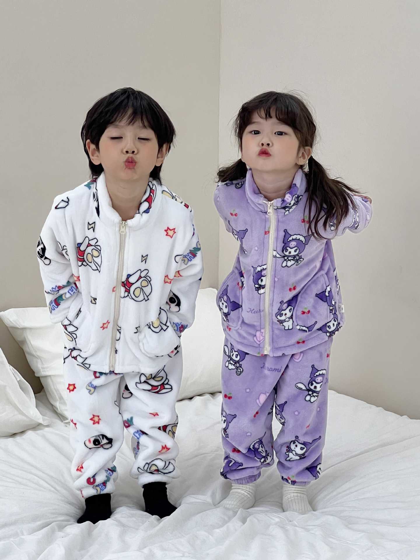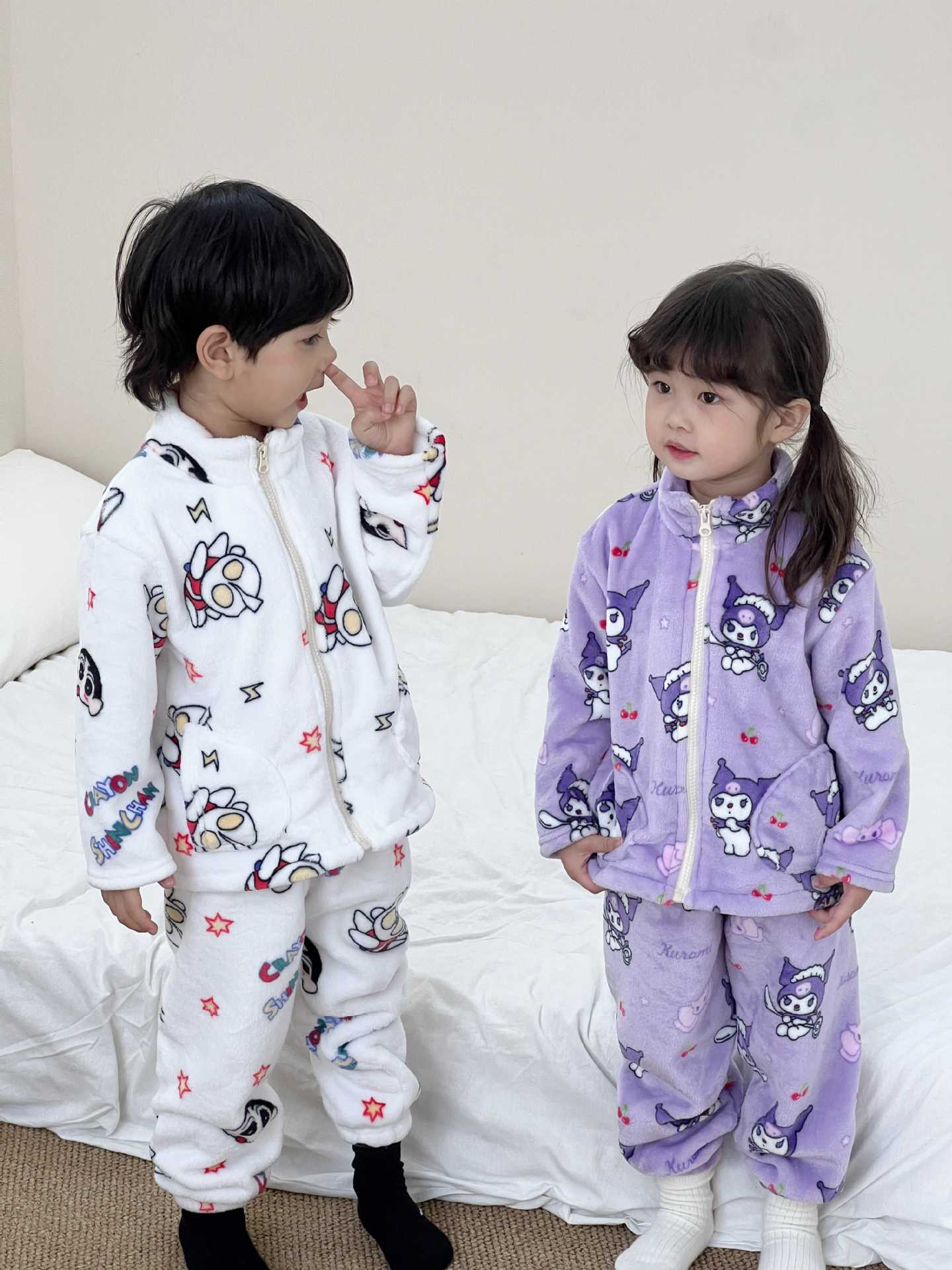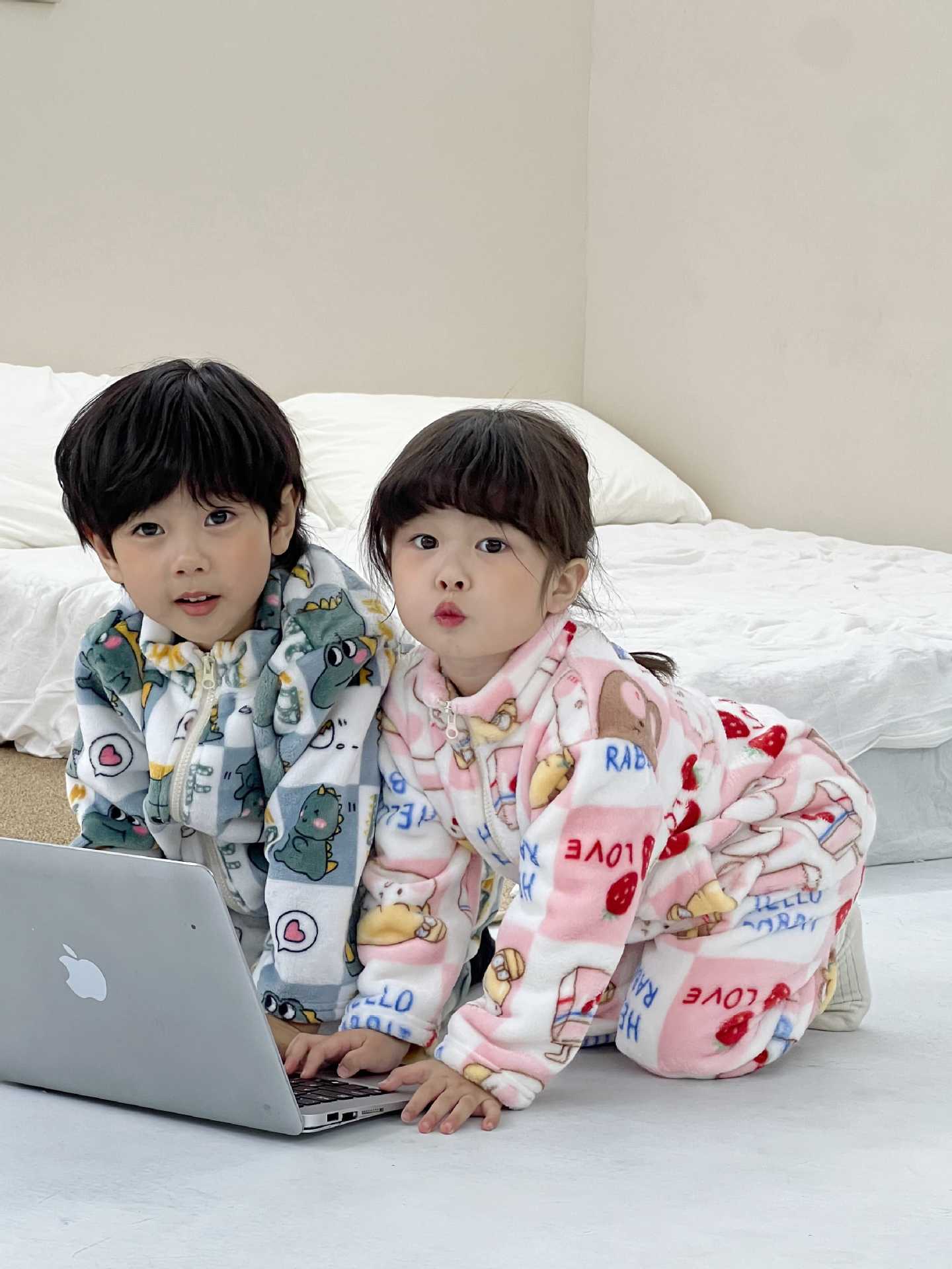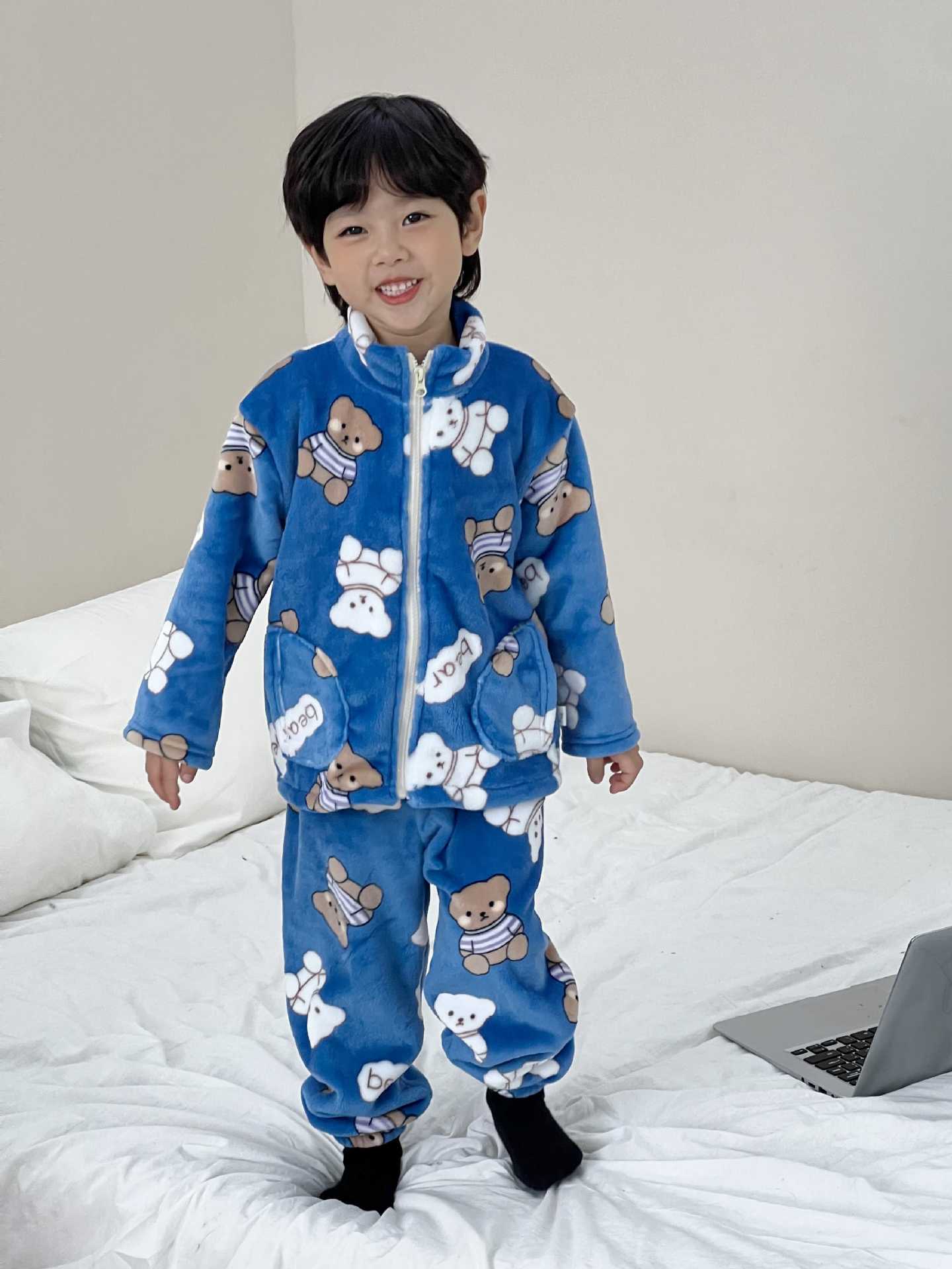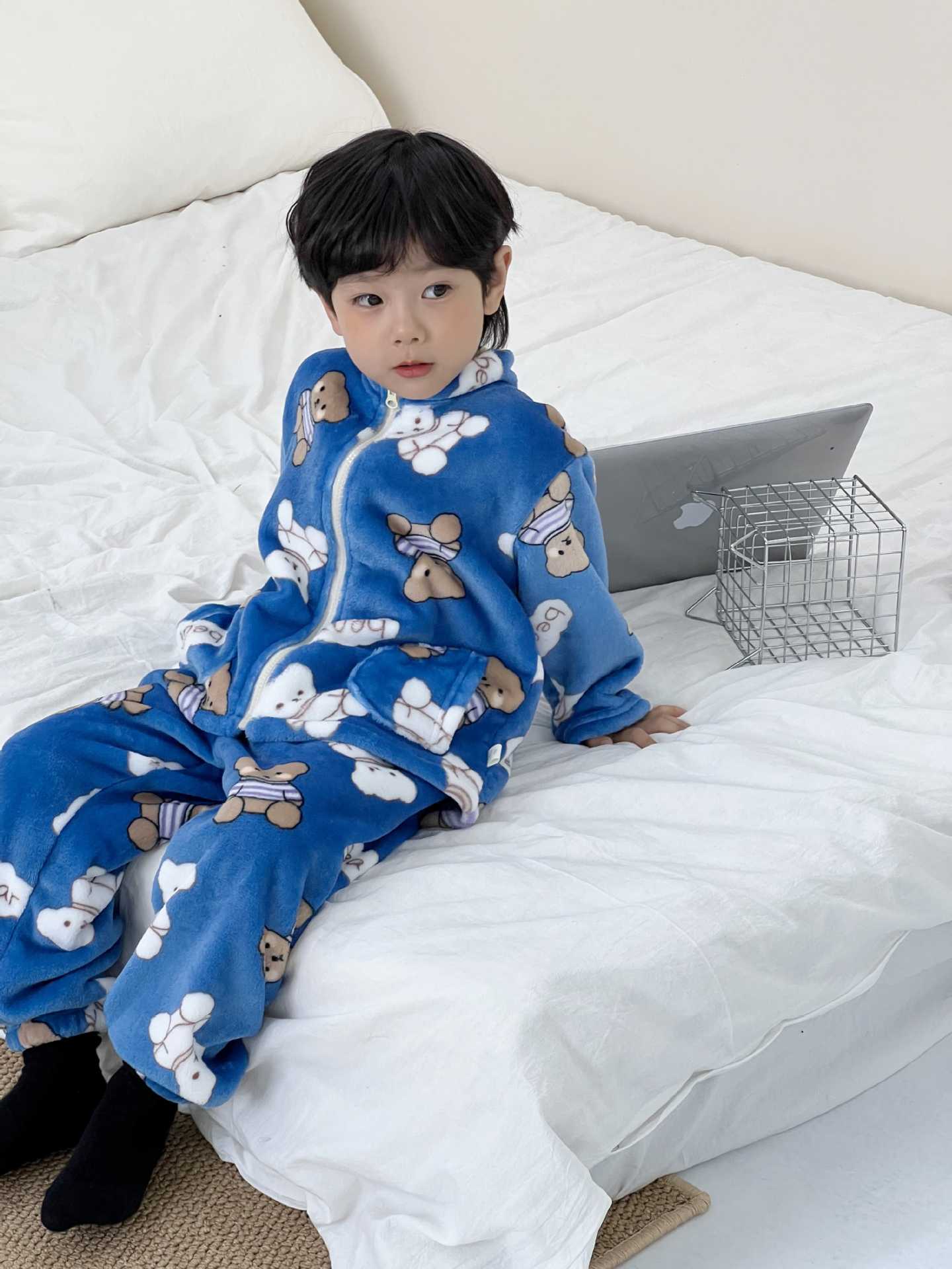어린이 잠옷 가을과 겨울 플란넬 산호 양털 기모 두꺼운 겨울 소년의 집 옷 아기 세트 만화스토어 가기